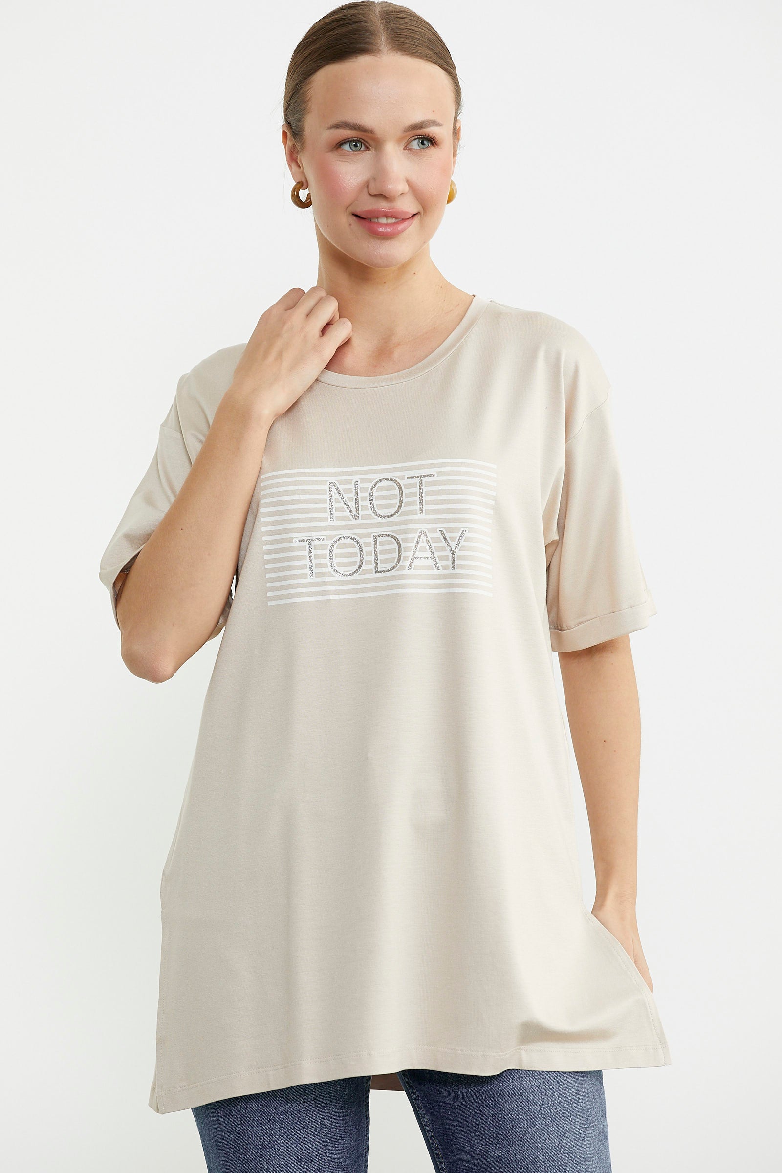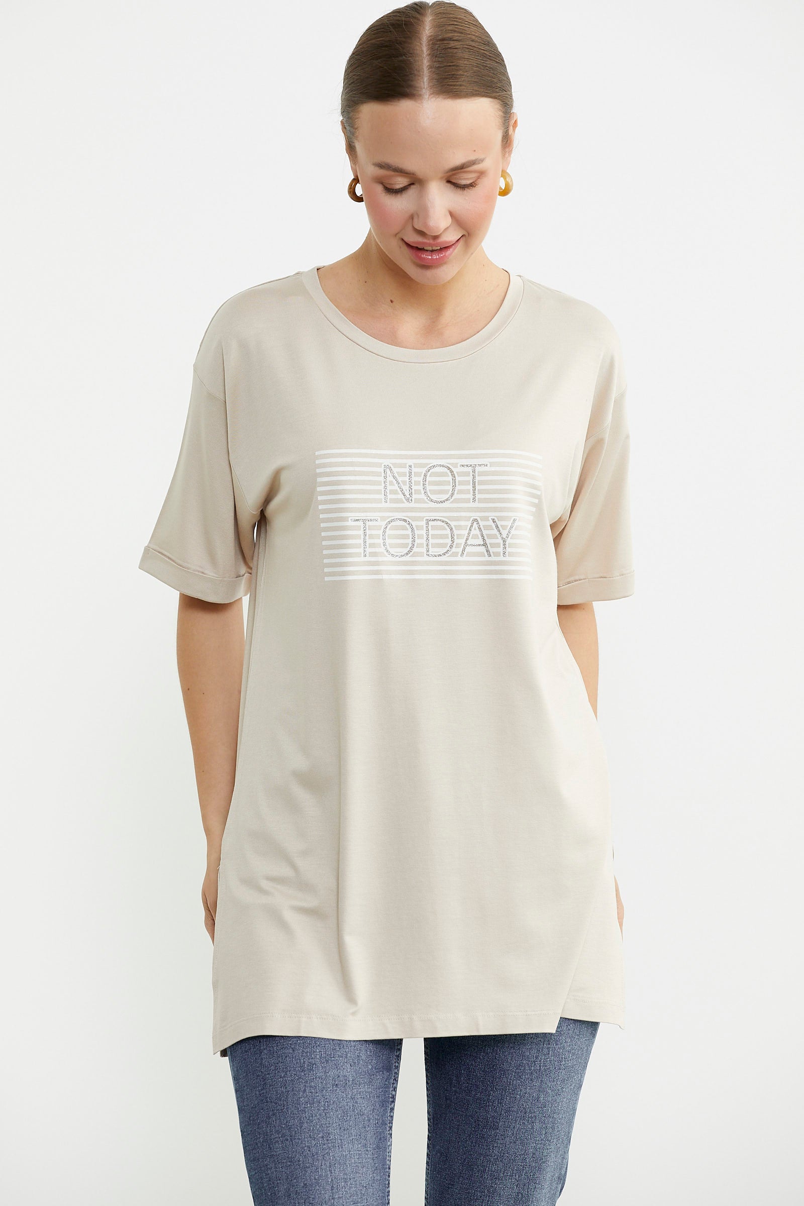 Göğüs hizasında konumlanan baskı detaylı tişört, tunik boydur. Etek ucundaki yırtmacıyla rahat bir kullanım sunar.