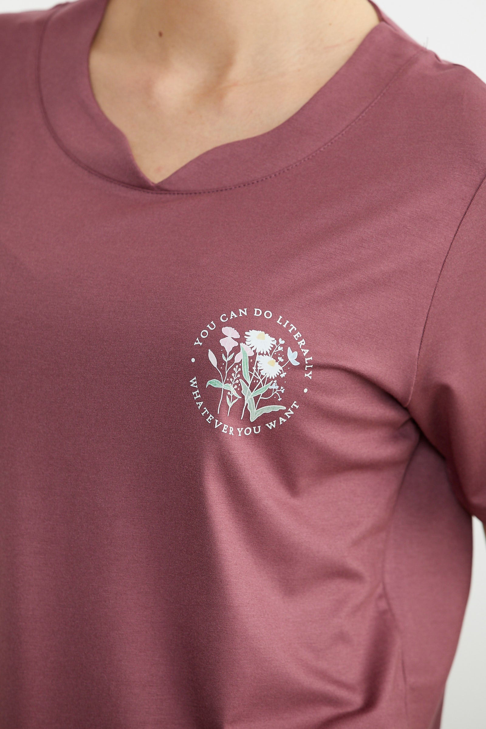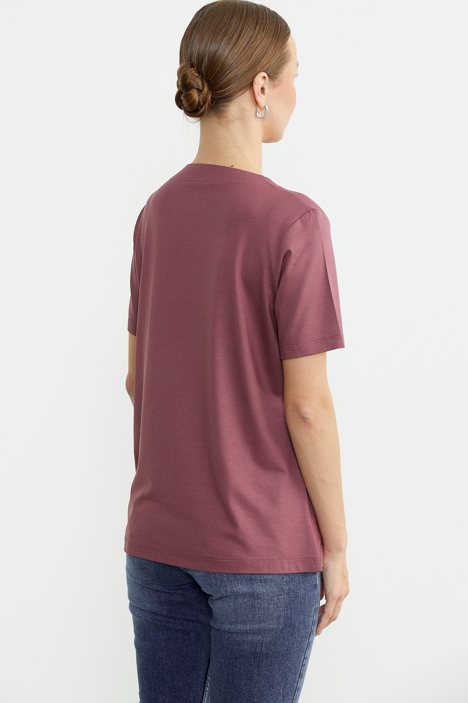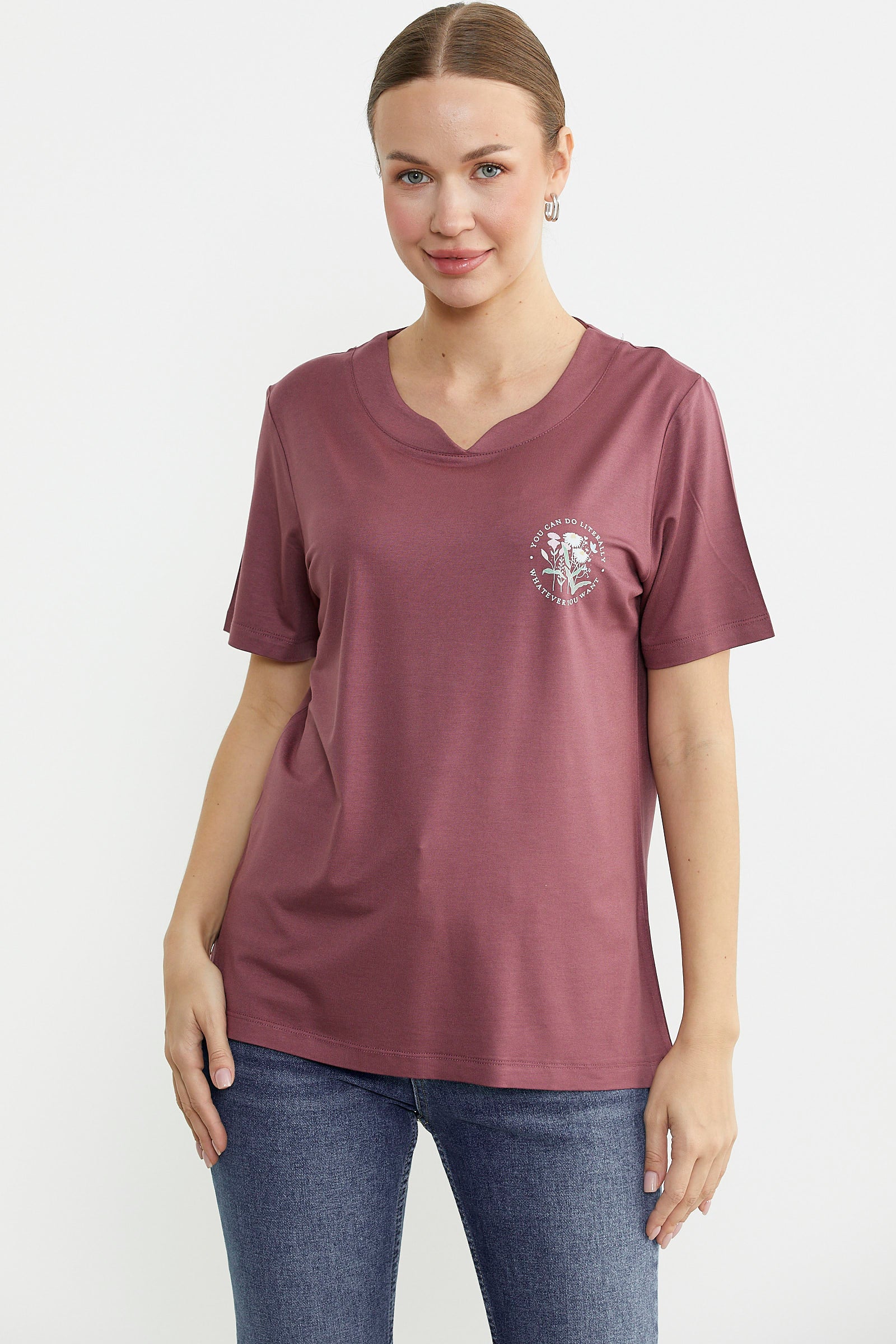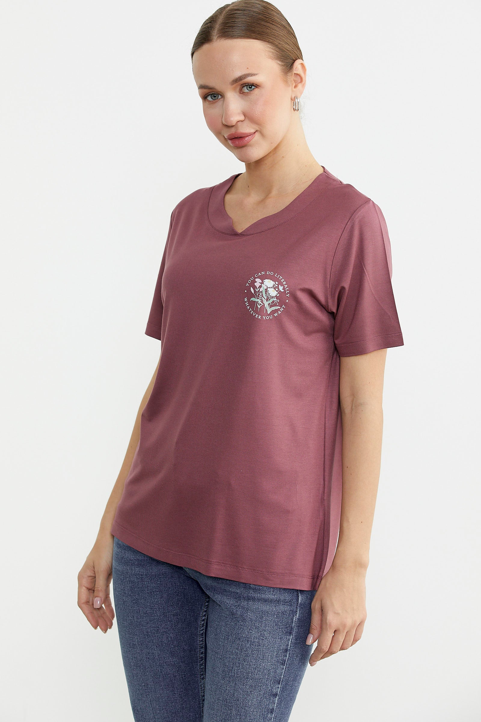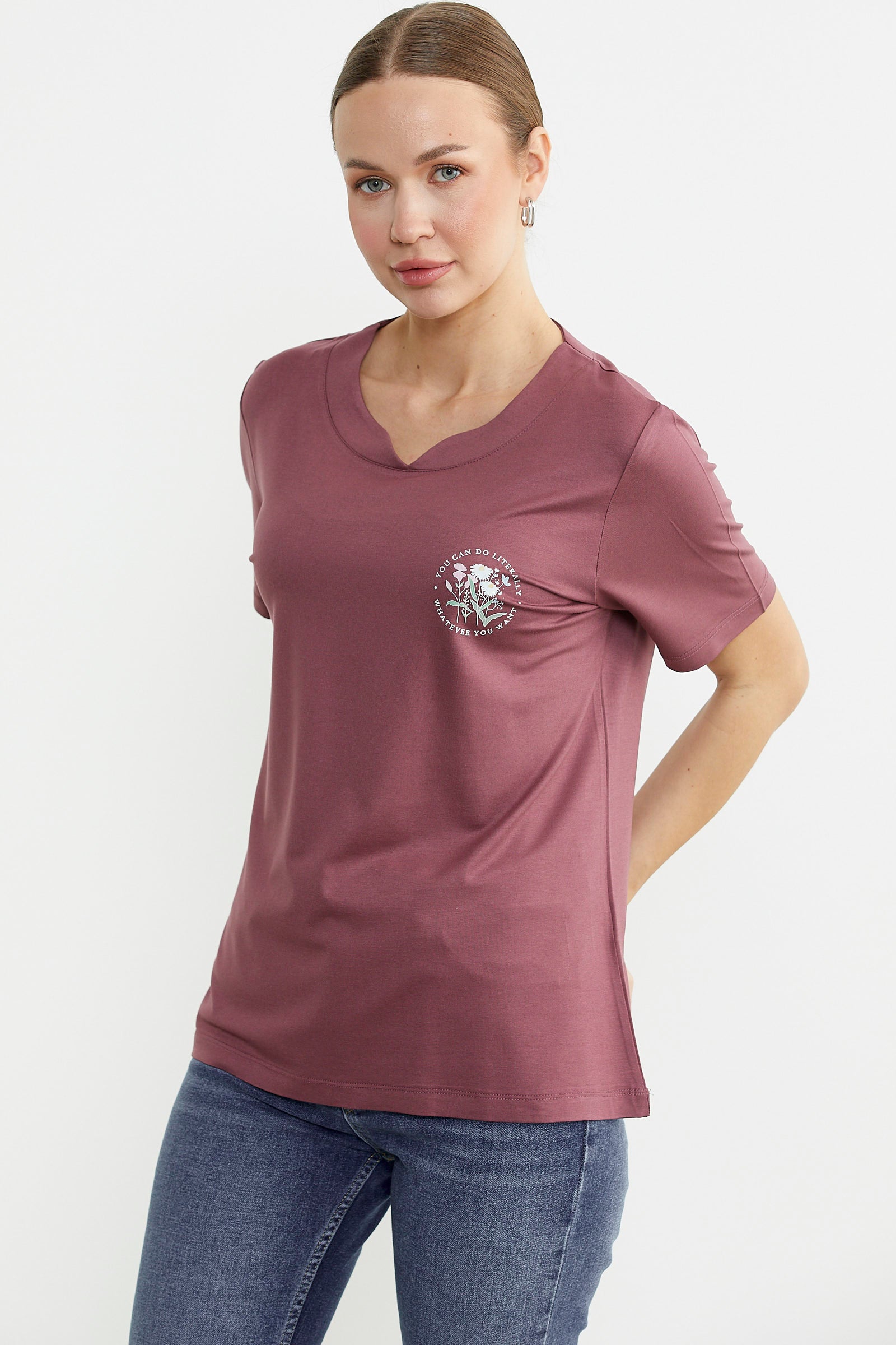 Bisiklet Yaka Baskılı Dökümlü Tişört - Gül