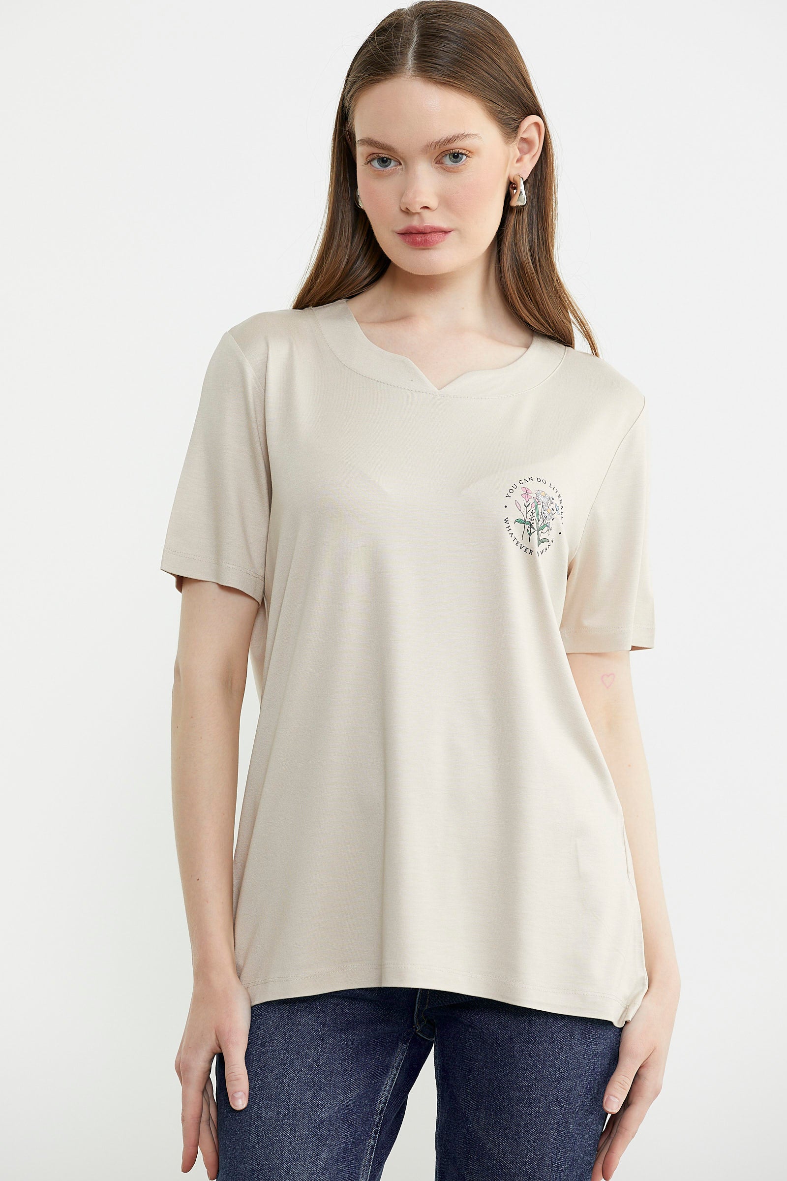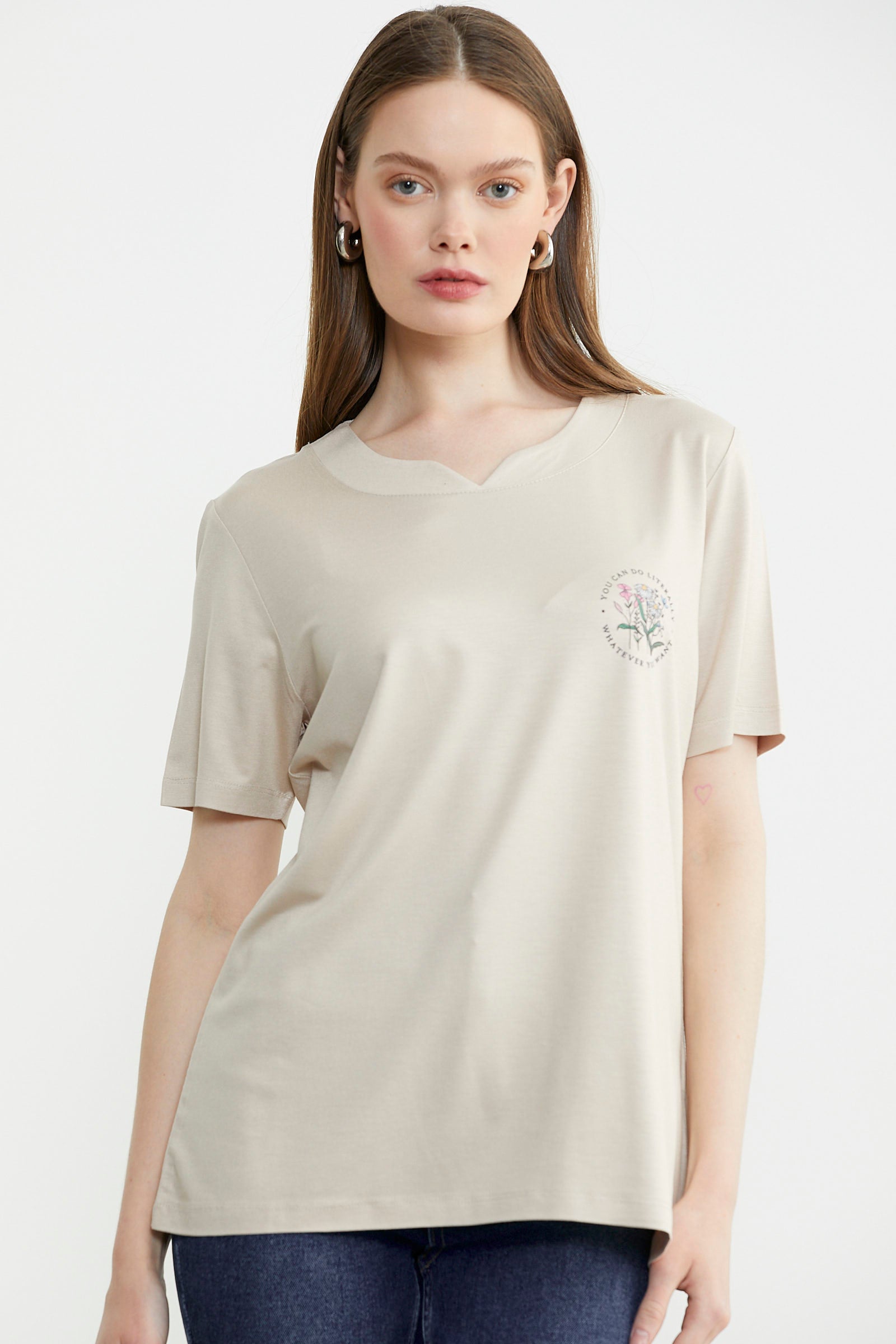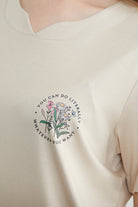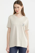 Bisiklet Yaka Baskılı Dökümlü Tişört - Taş