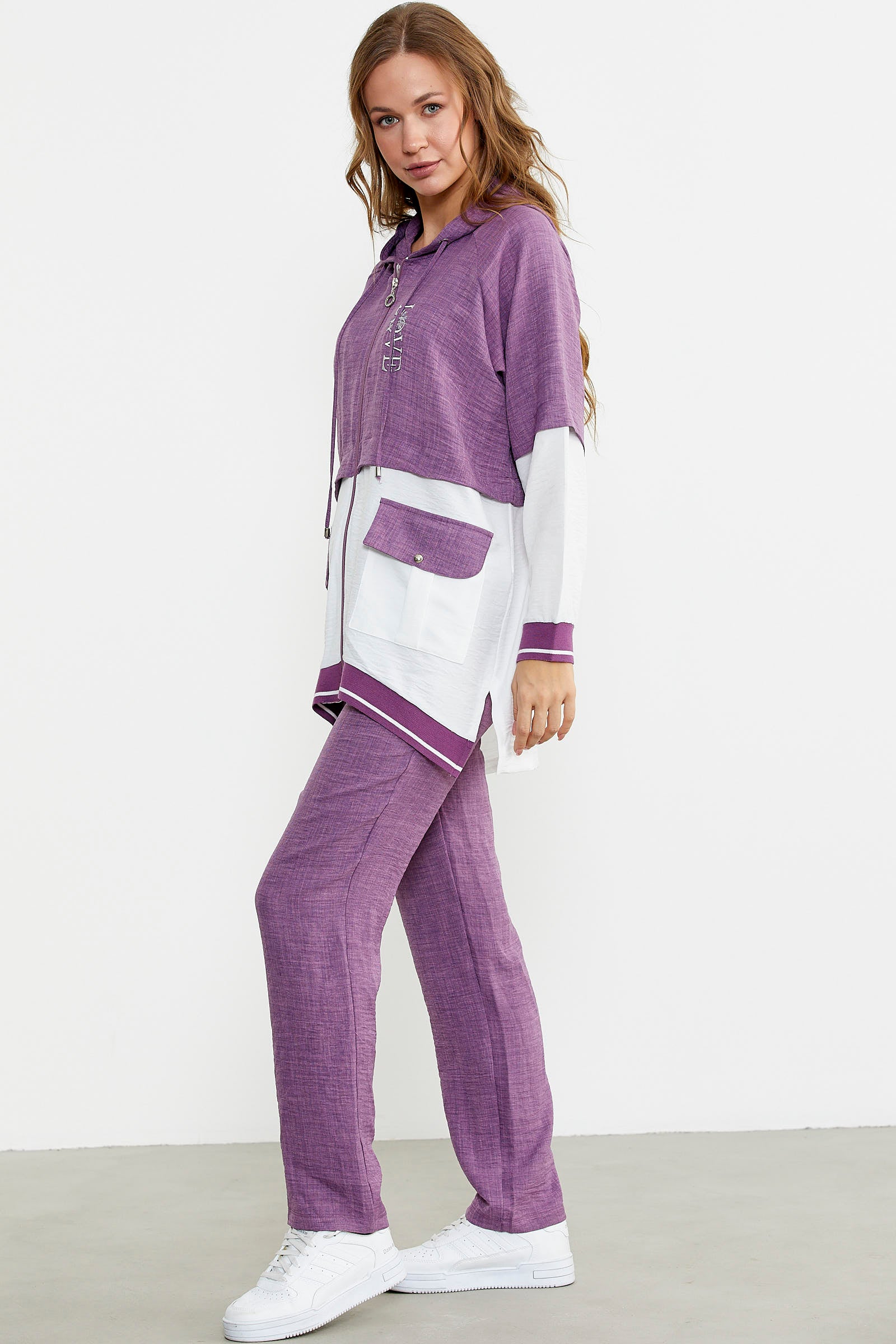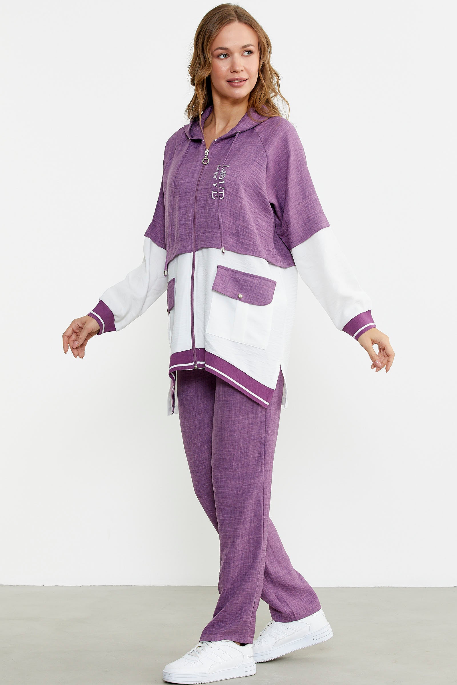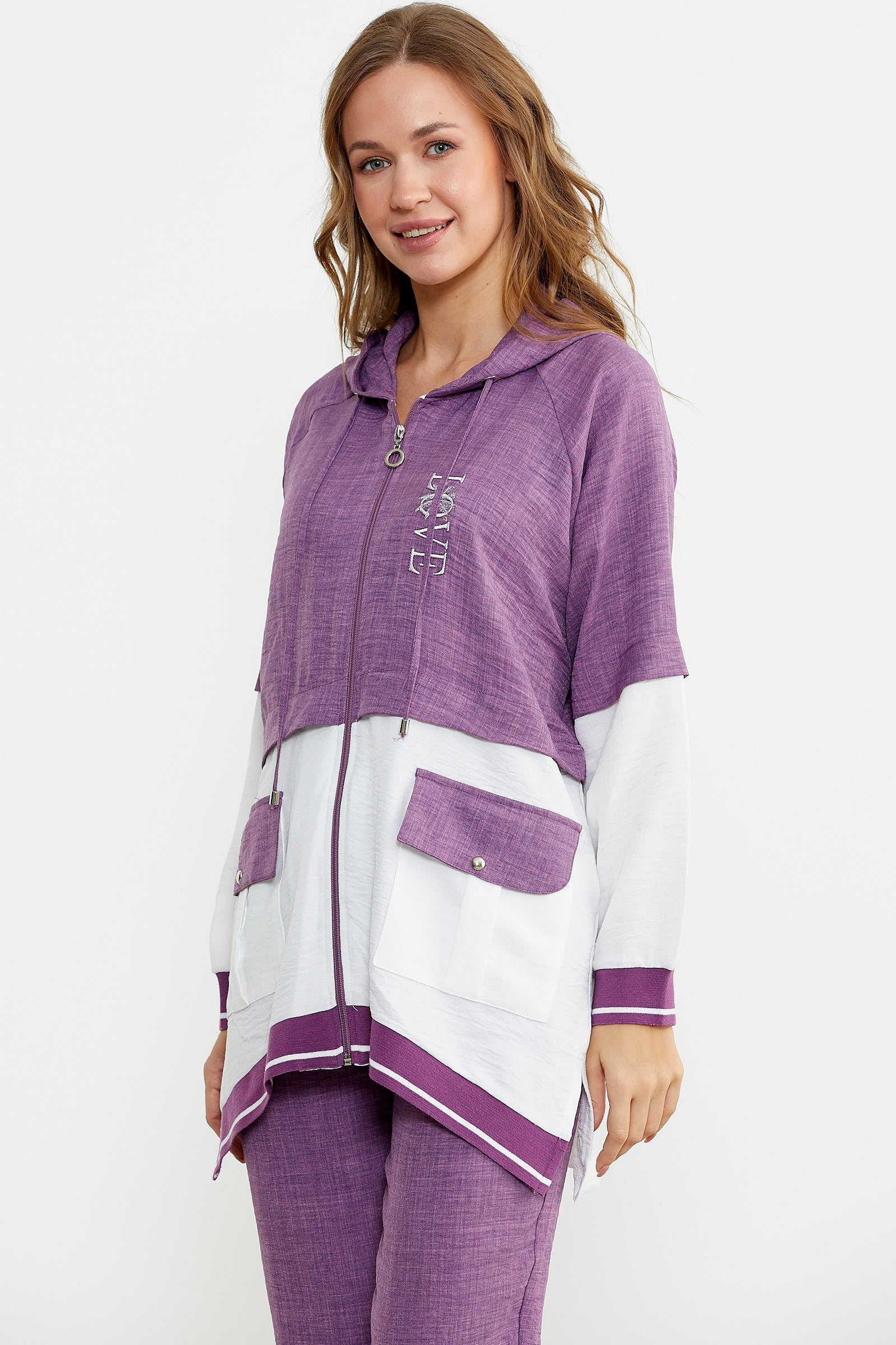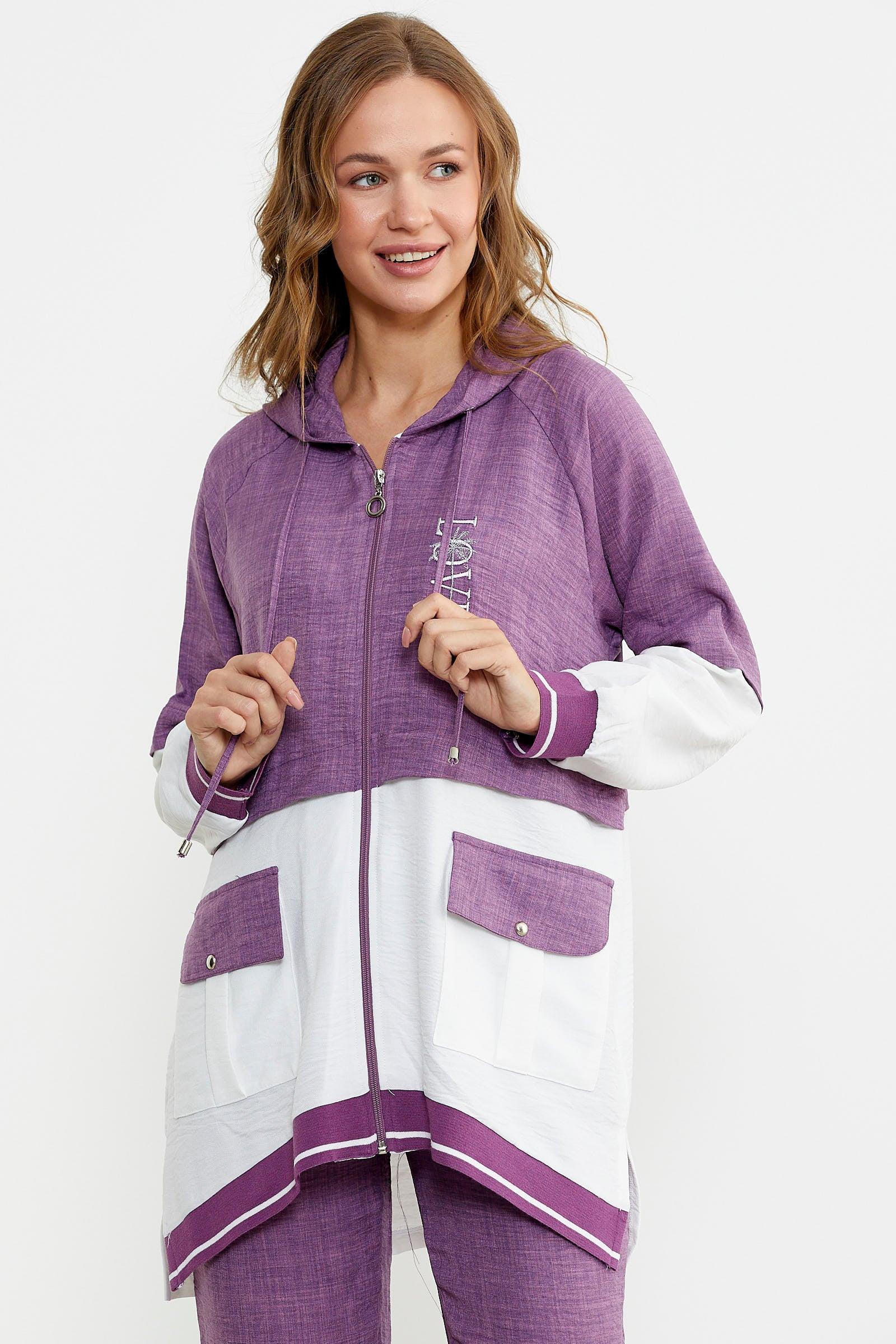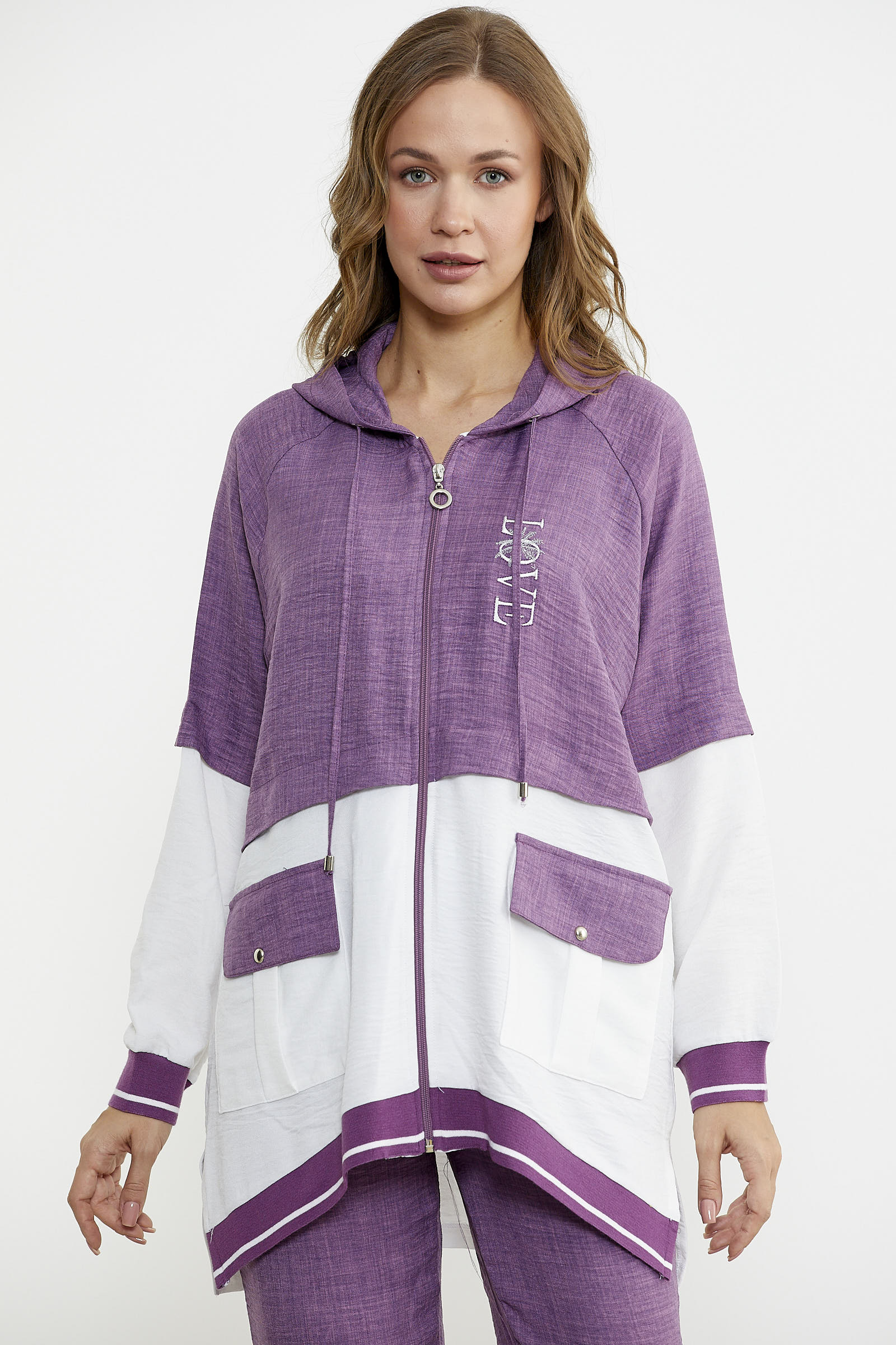 Bol kesimli arkası uzun keten görünümlü takım. Kapüşonlu, fermuar kapamalı ve cep detaylıdır. Etek ucu ve manşetler örmedir.