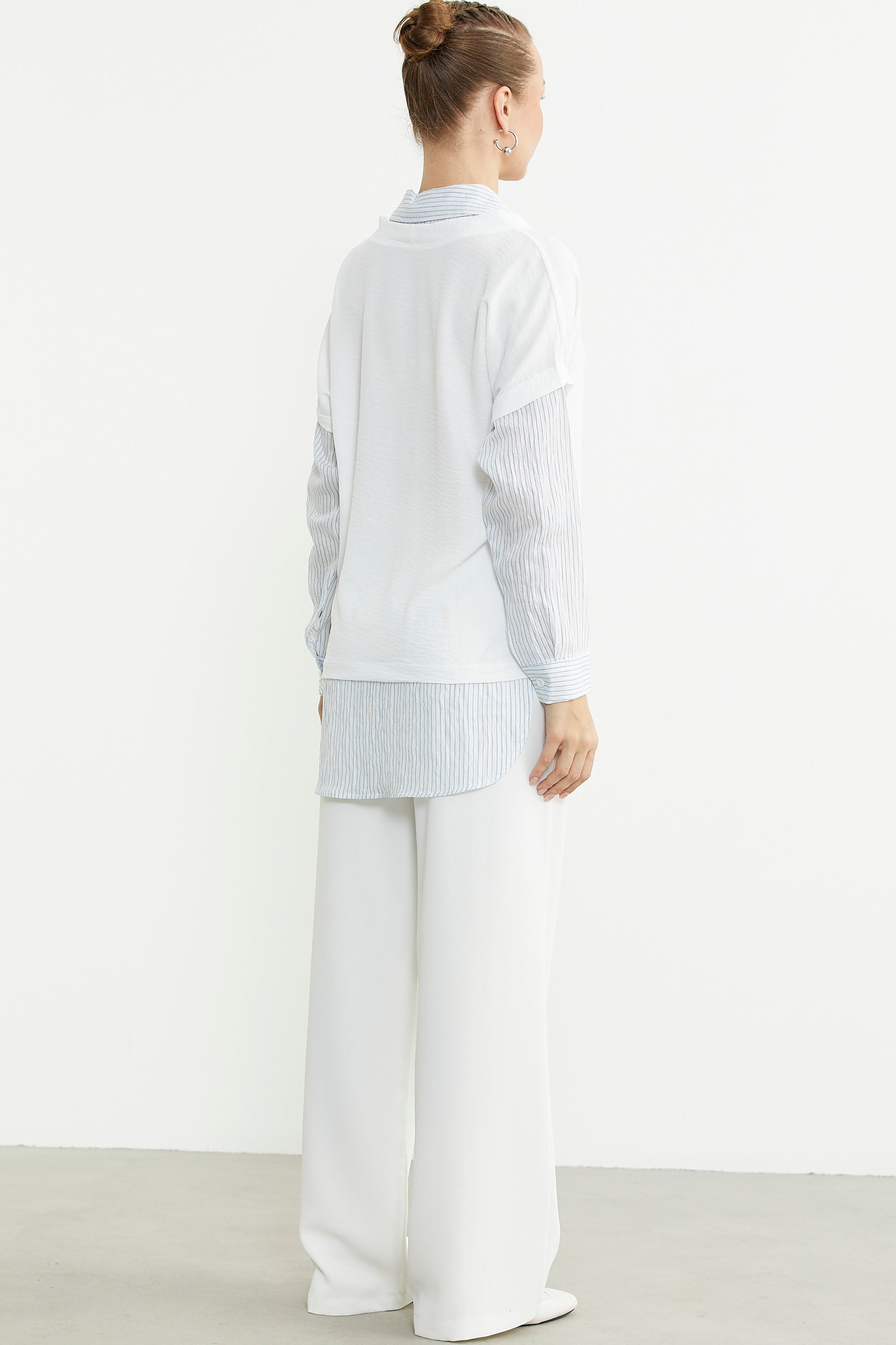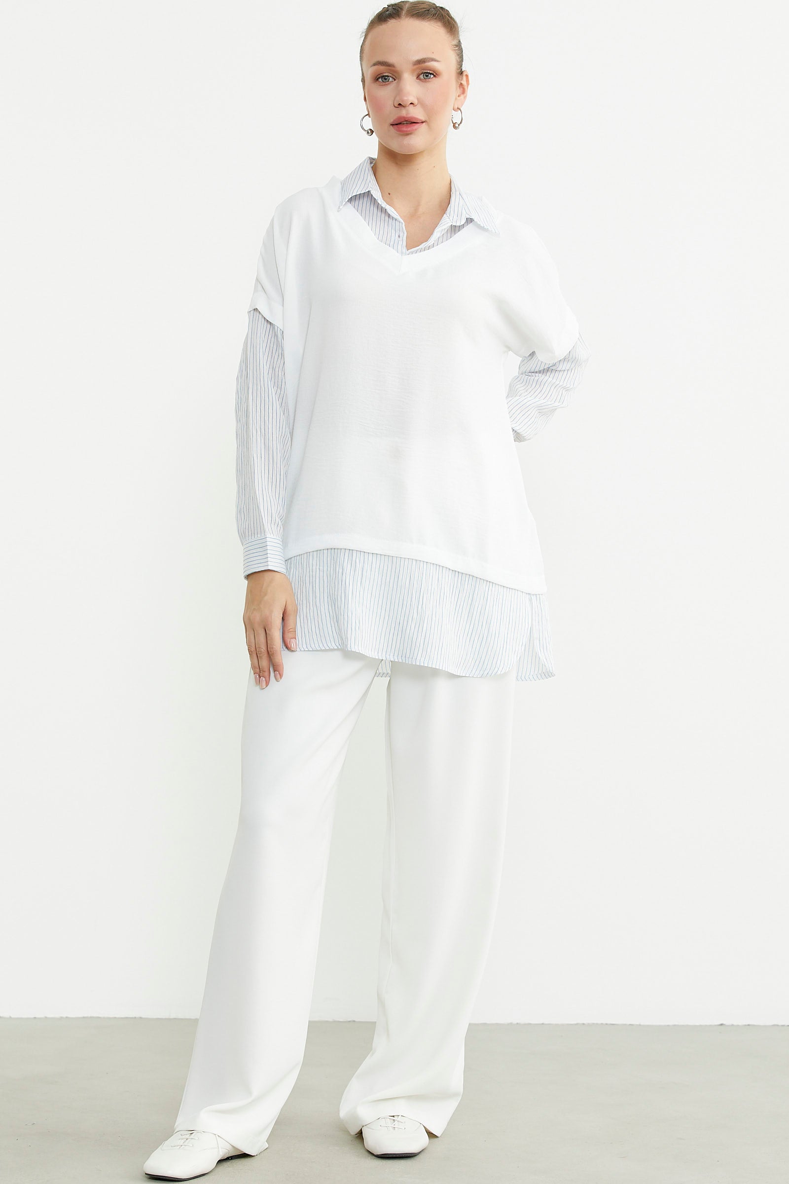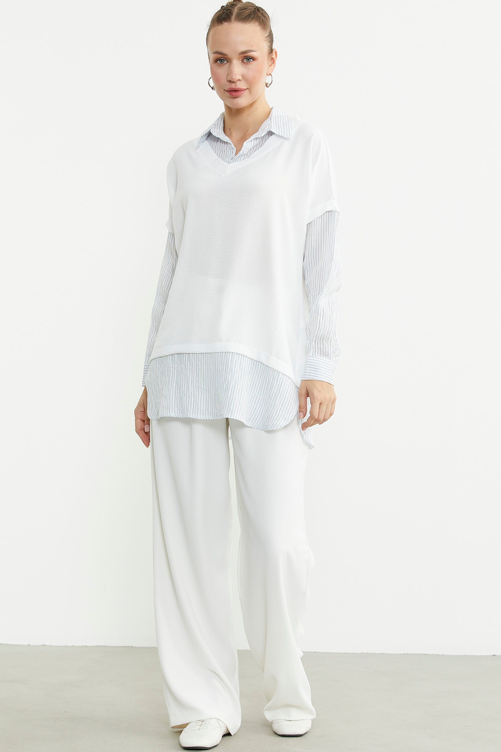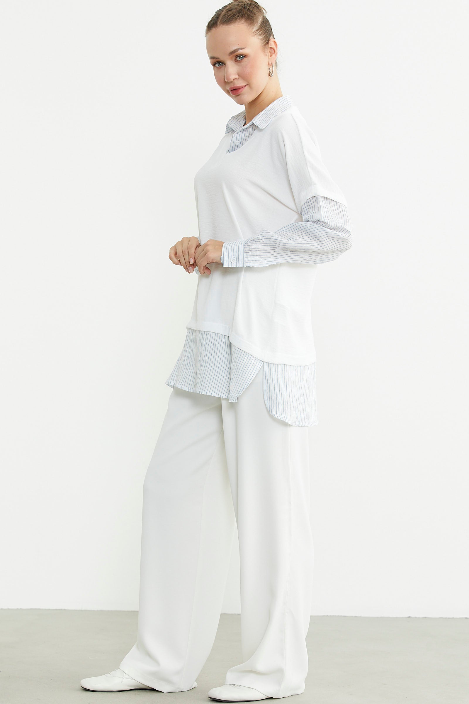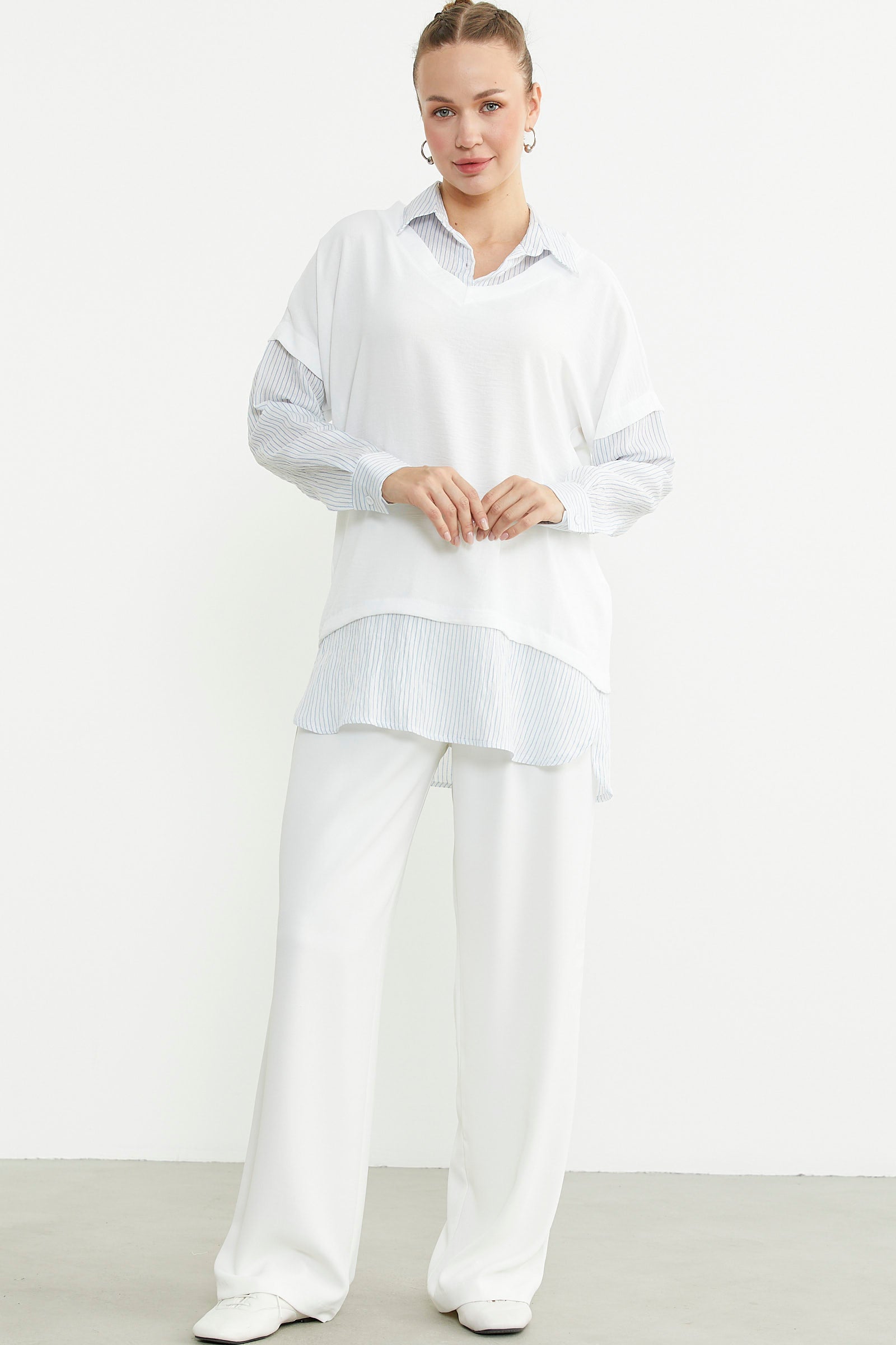 Oversize bluz kombinli uzun kollu çizgili gömlek, pastel renkleriyle öne çıkıyor. Casual tarzı sevenler için idealdir.