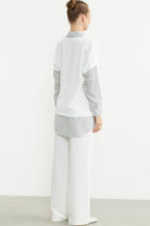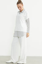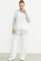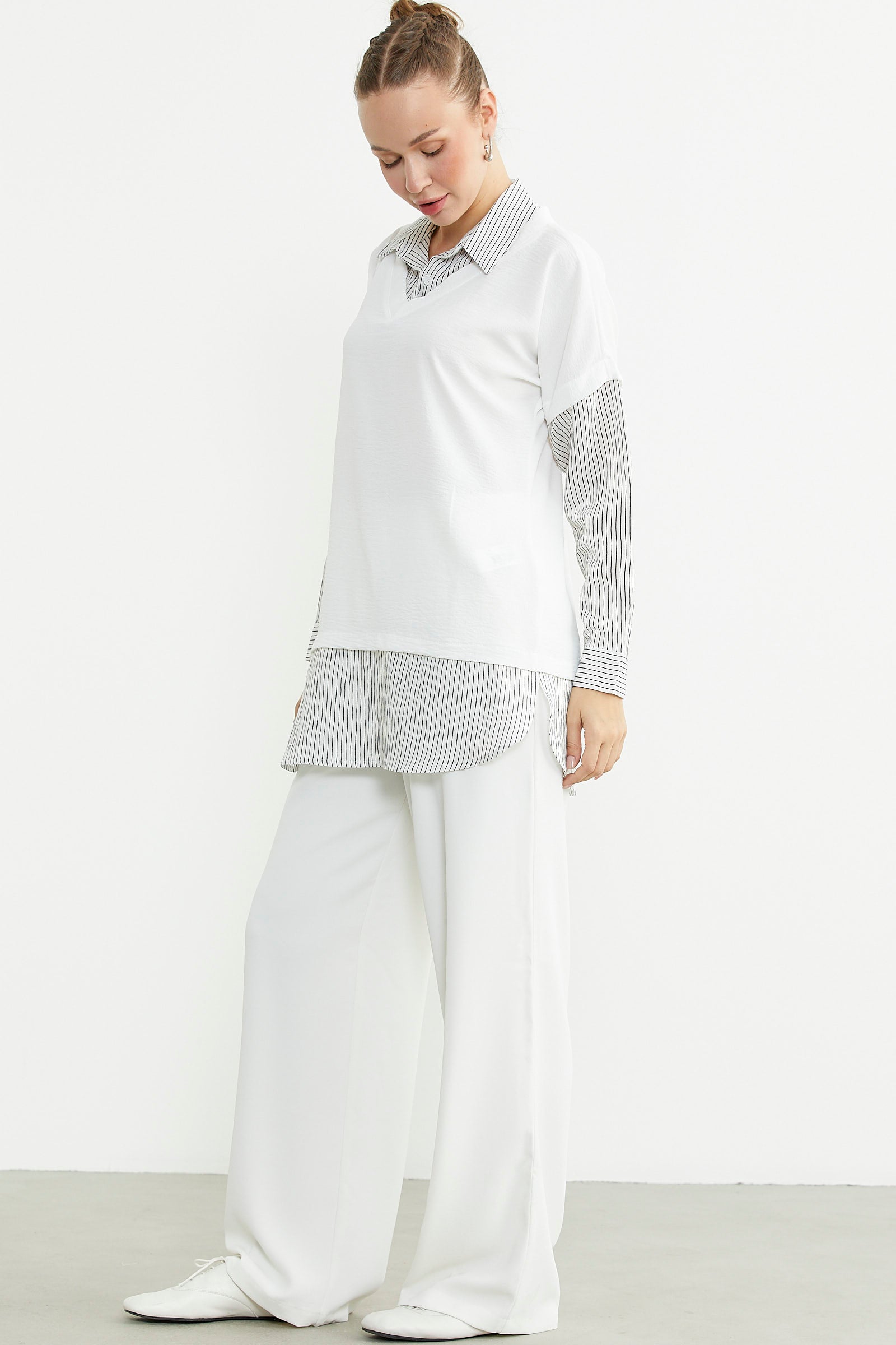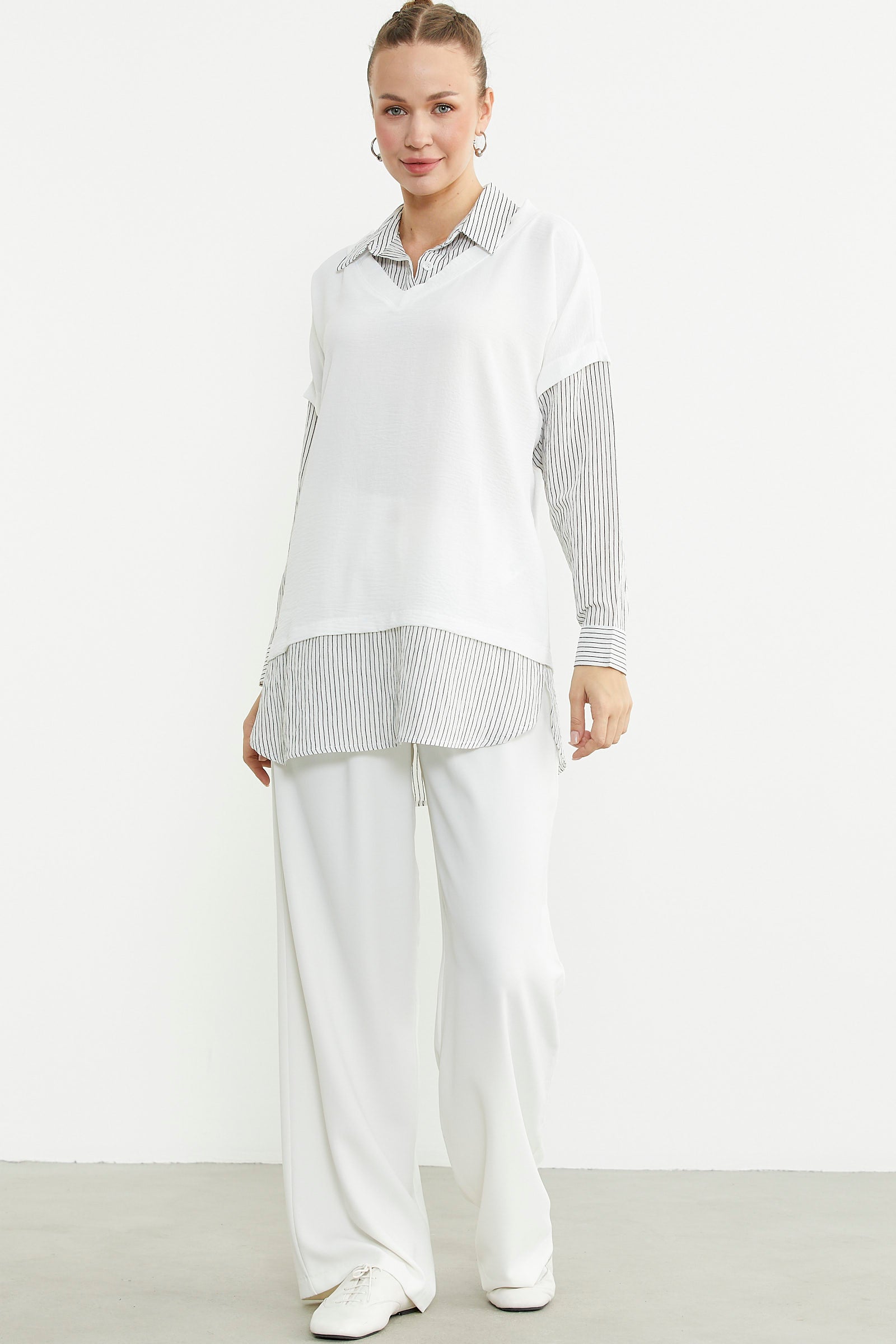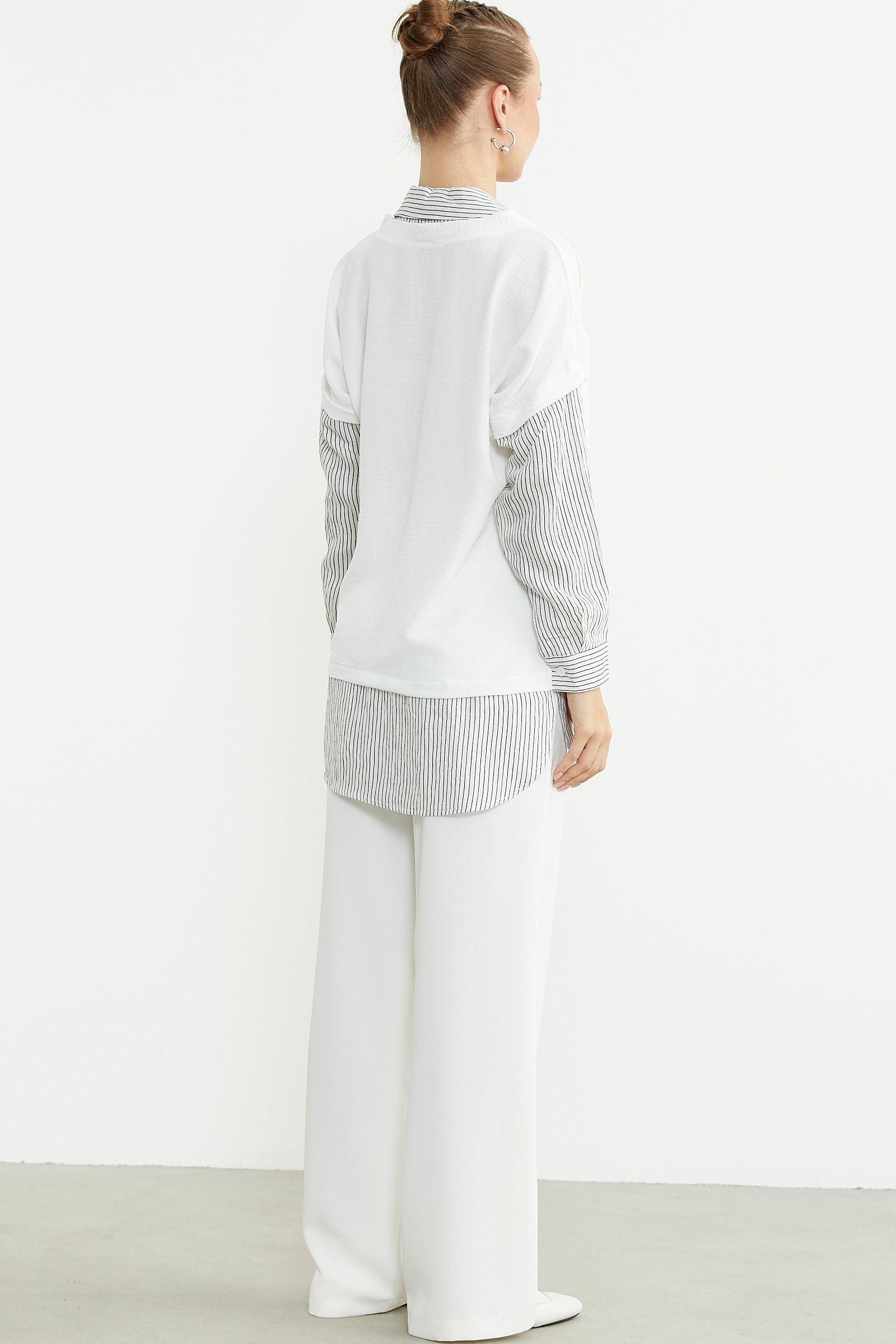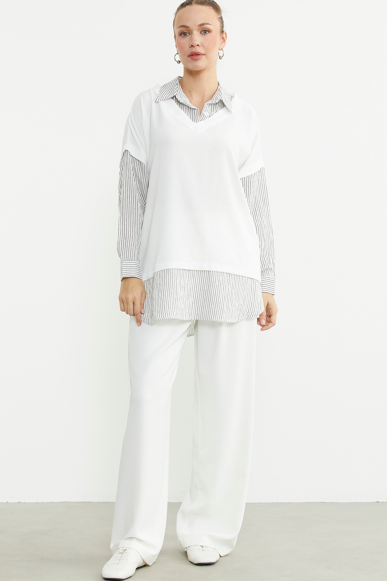 Oversize bluz kombinli uzun kollu çizgili gömlek, pastel renkleriyle öne çıkıyor. Casual tarzı sevenler için idealdir.