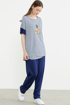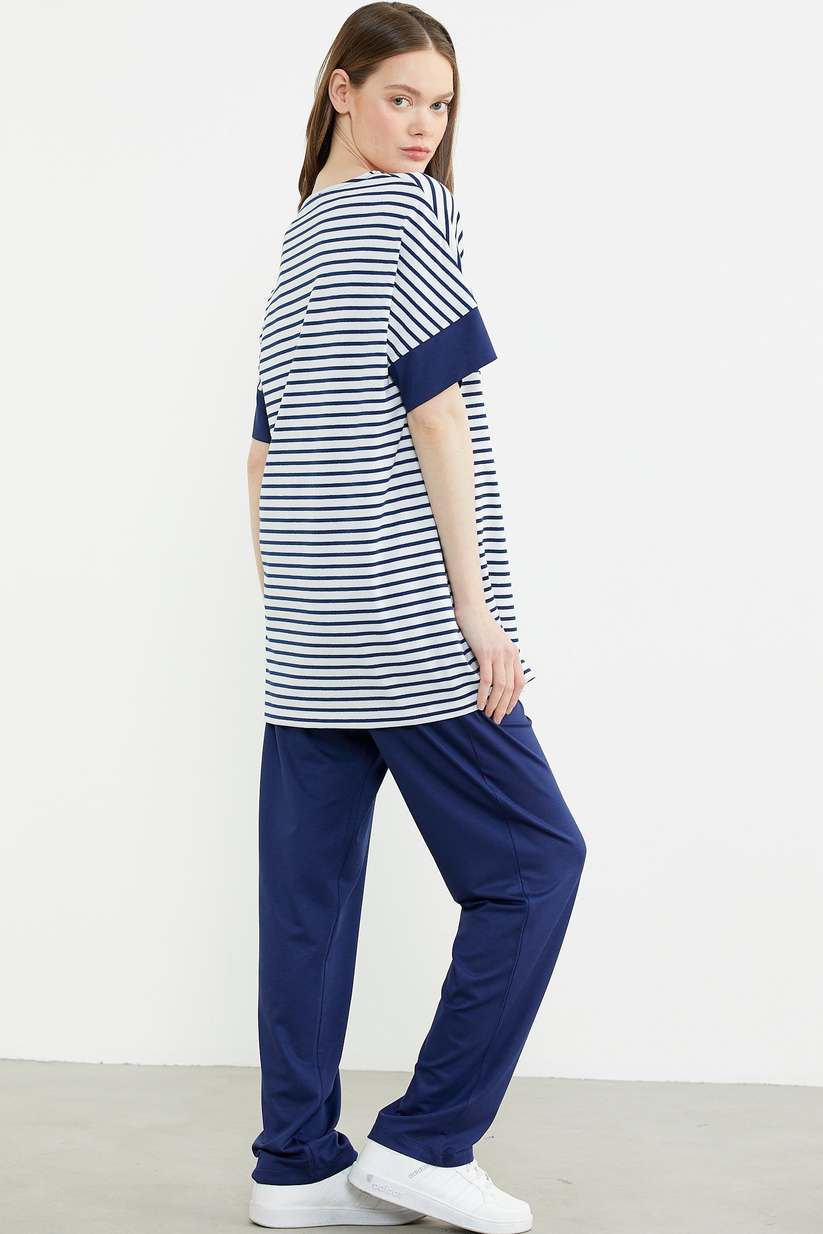 Büyük beden için örme kumaştan üretilmiş çizgili uzun tişört ve düz kombin pantolondan oluşmaktadır. Oversize ve baskılıdır.