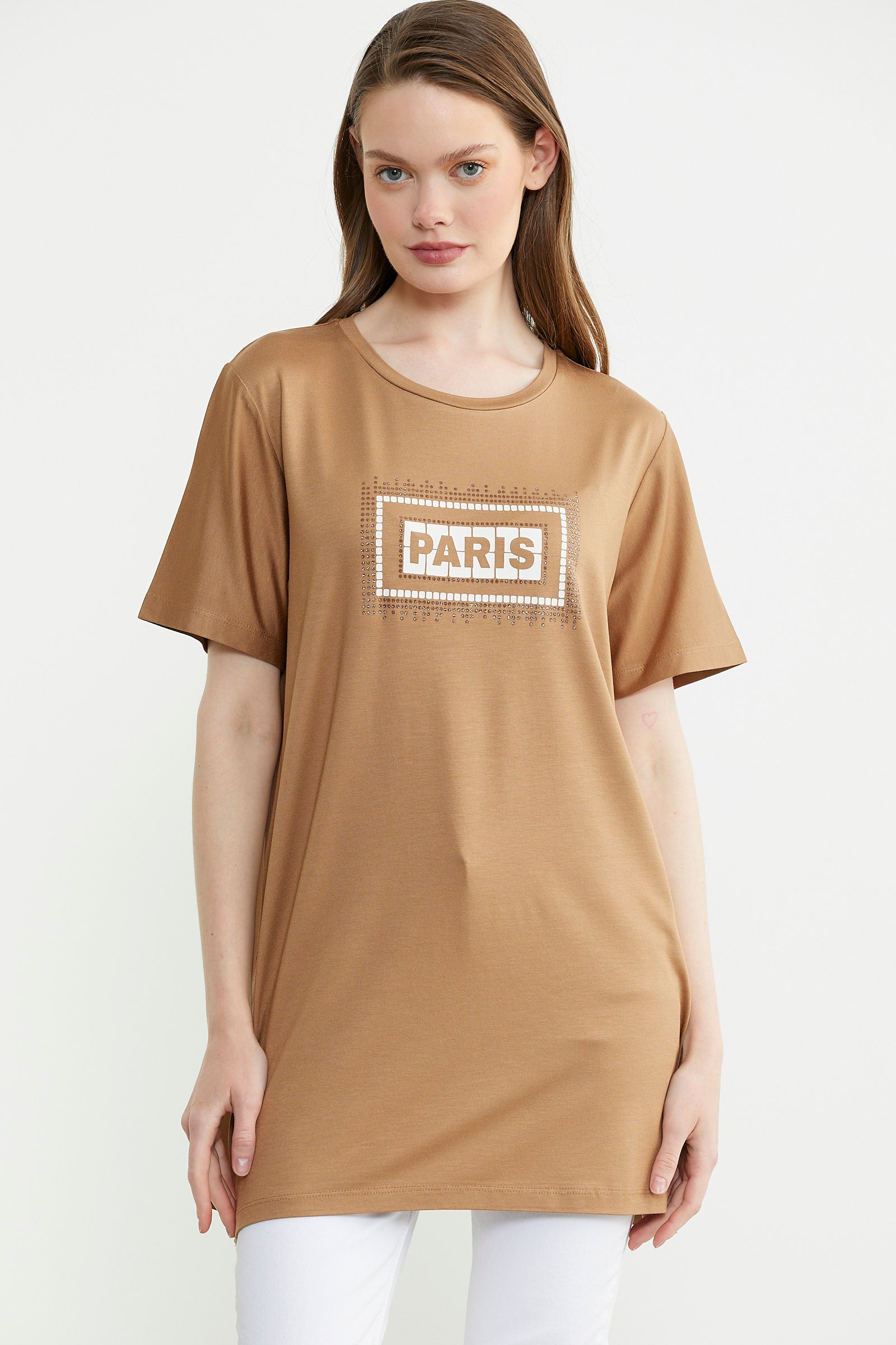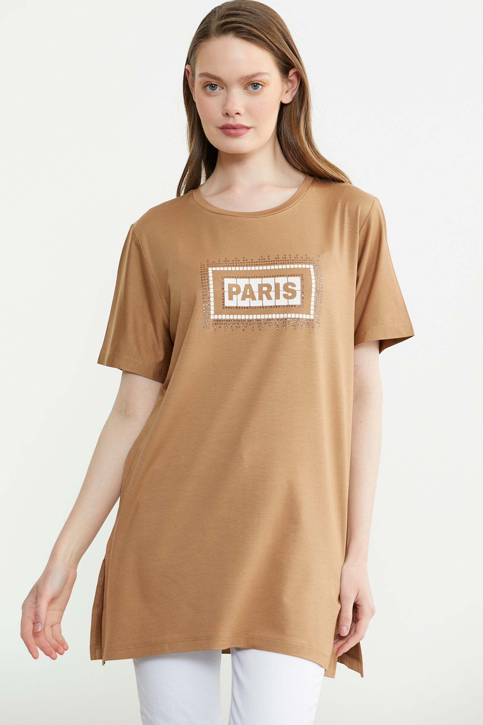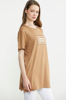Büyük Beden Baskılı Uzun Tunik Tişört - Kamel