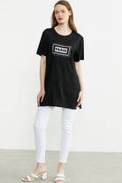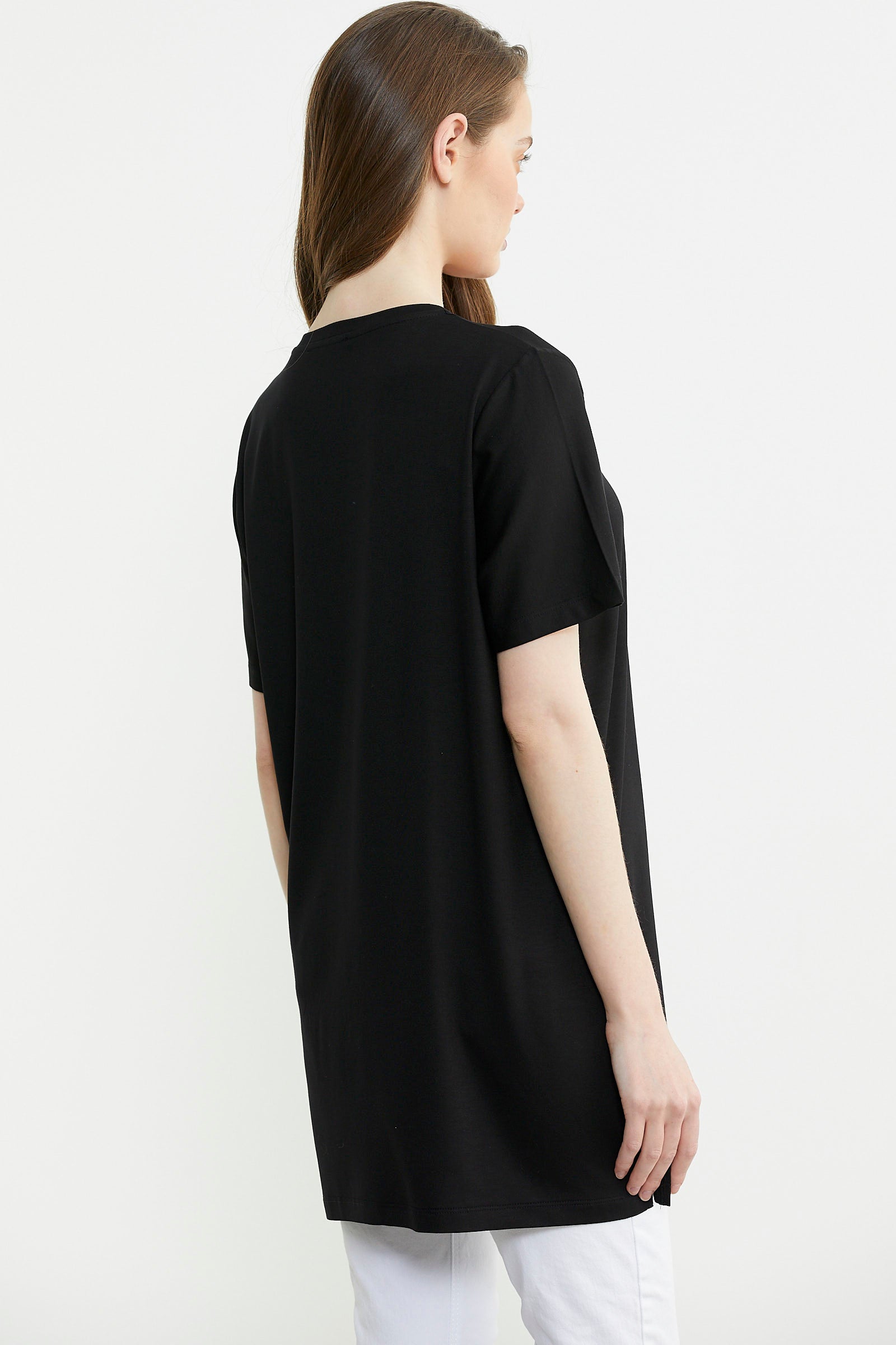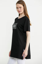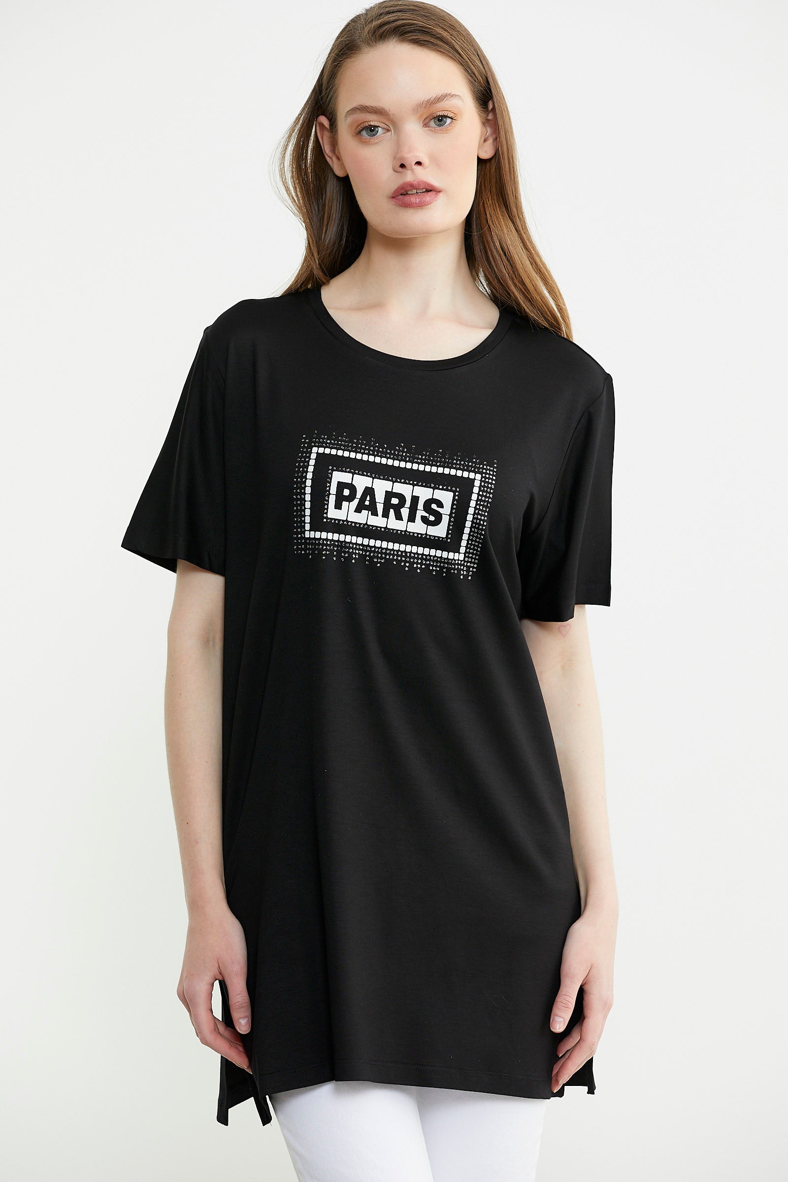 Büyük Beden Baskılı Uzun Tunik Tişört - Siyah
