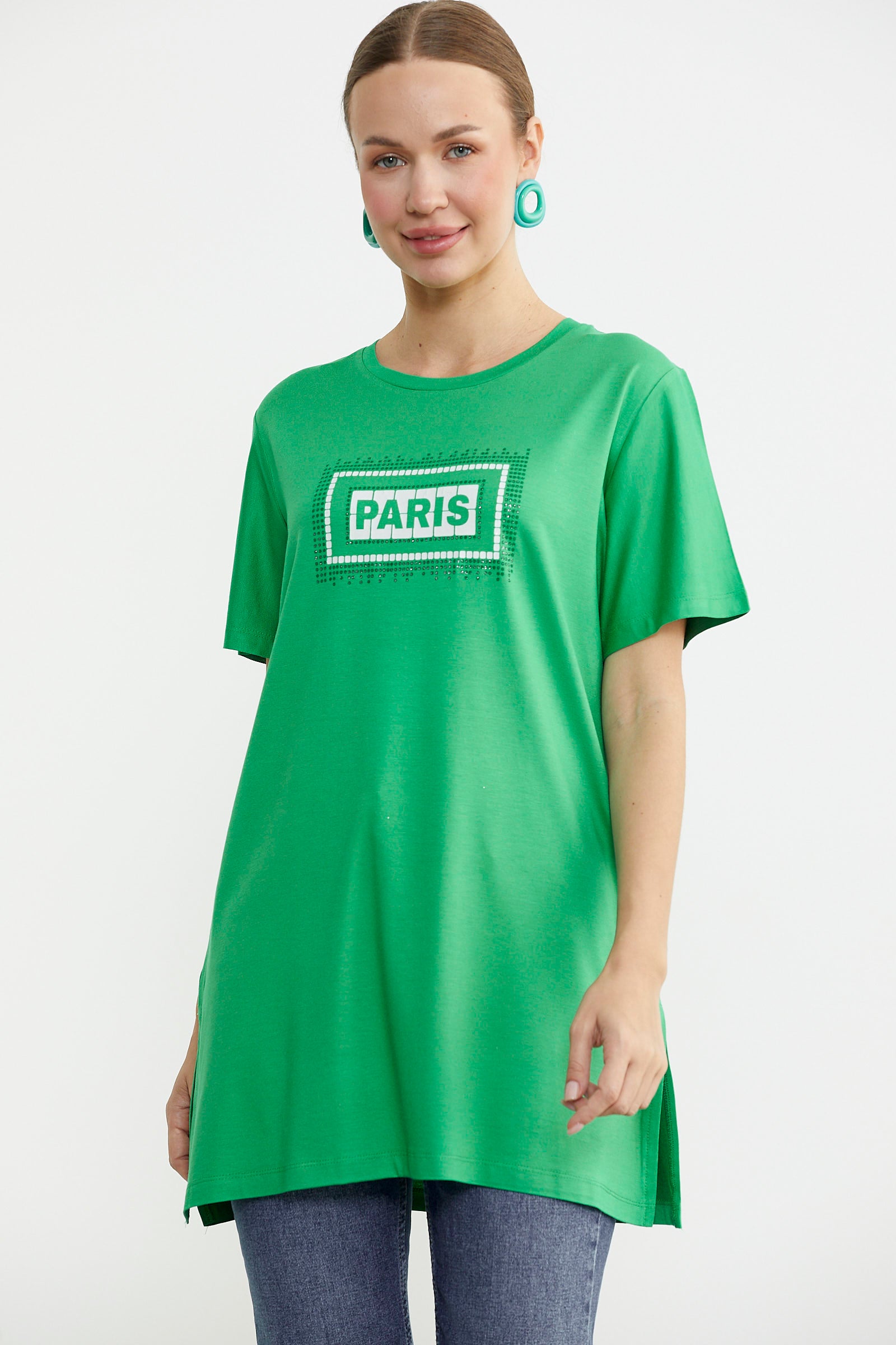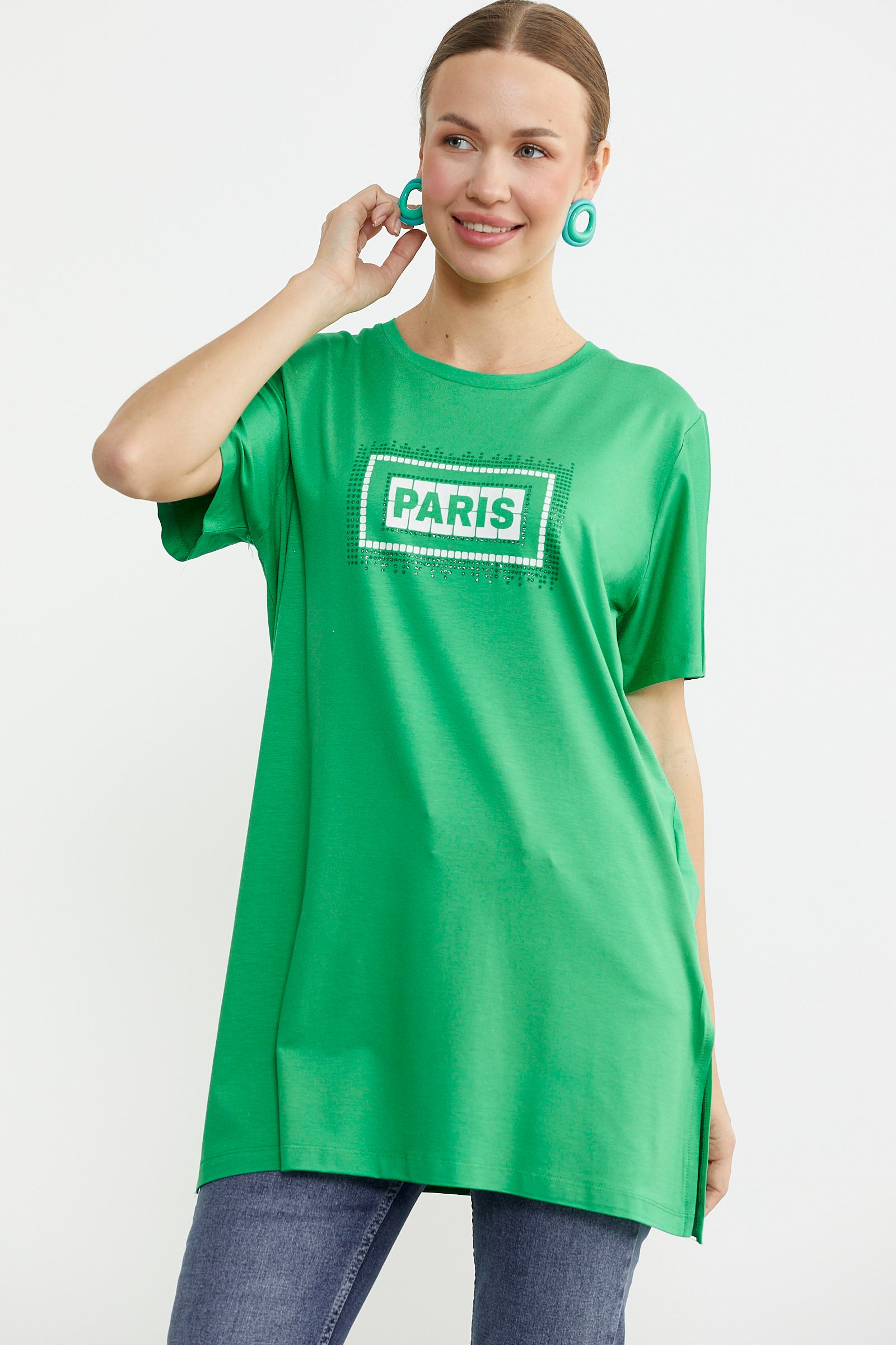 Büyük beden tunik tişört baskı ve taş detaylarıyla öne çıkıyor. Yumuşak dokusu, etek ucu yırtmacı ve bisiklet yaka detayıyla konforlu kullanım sağlar.