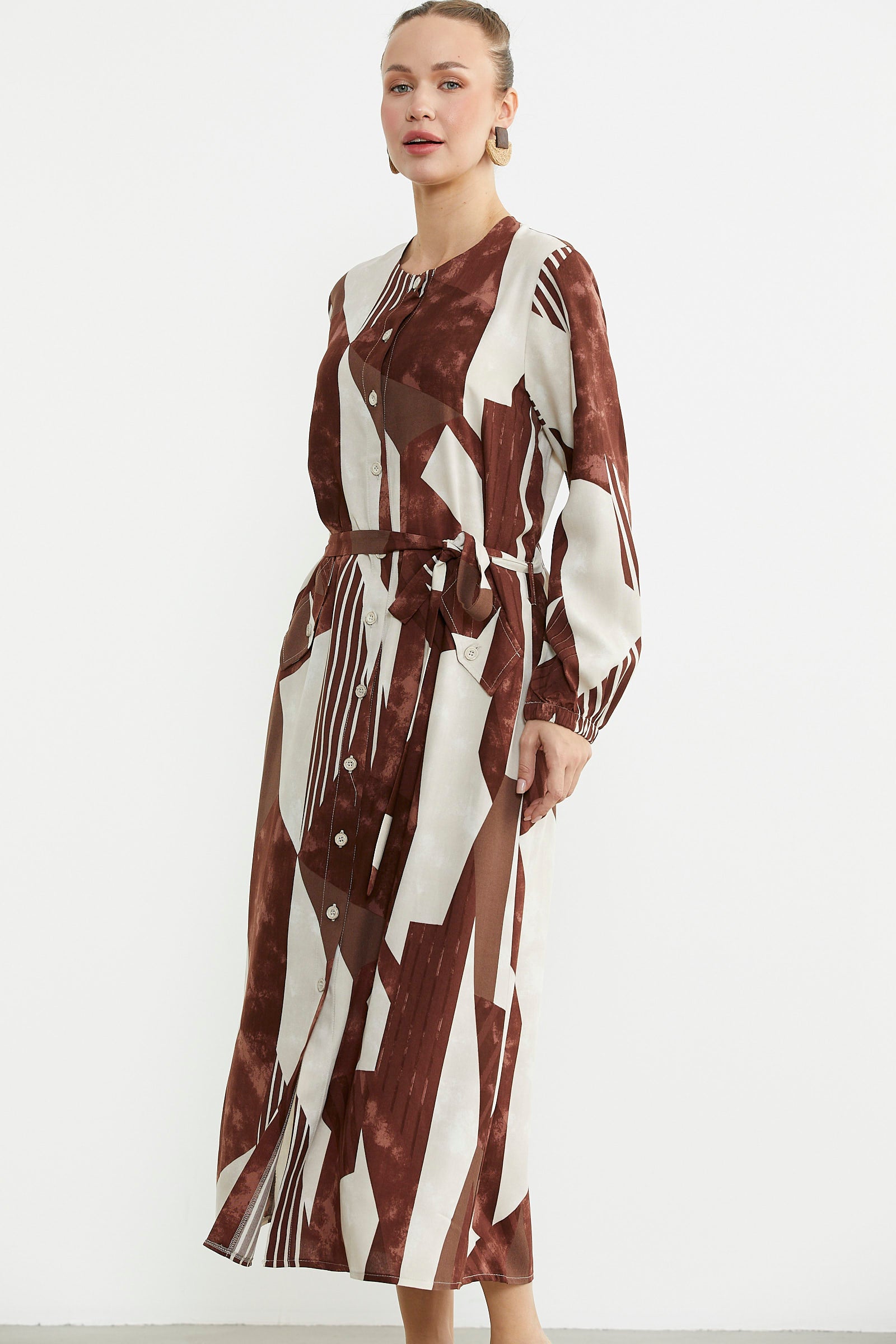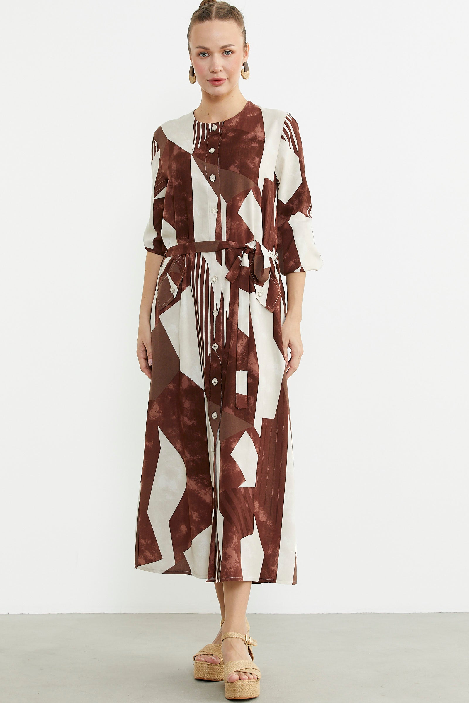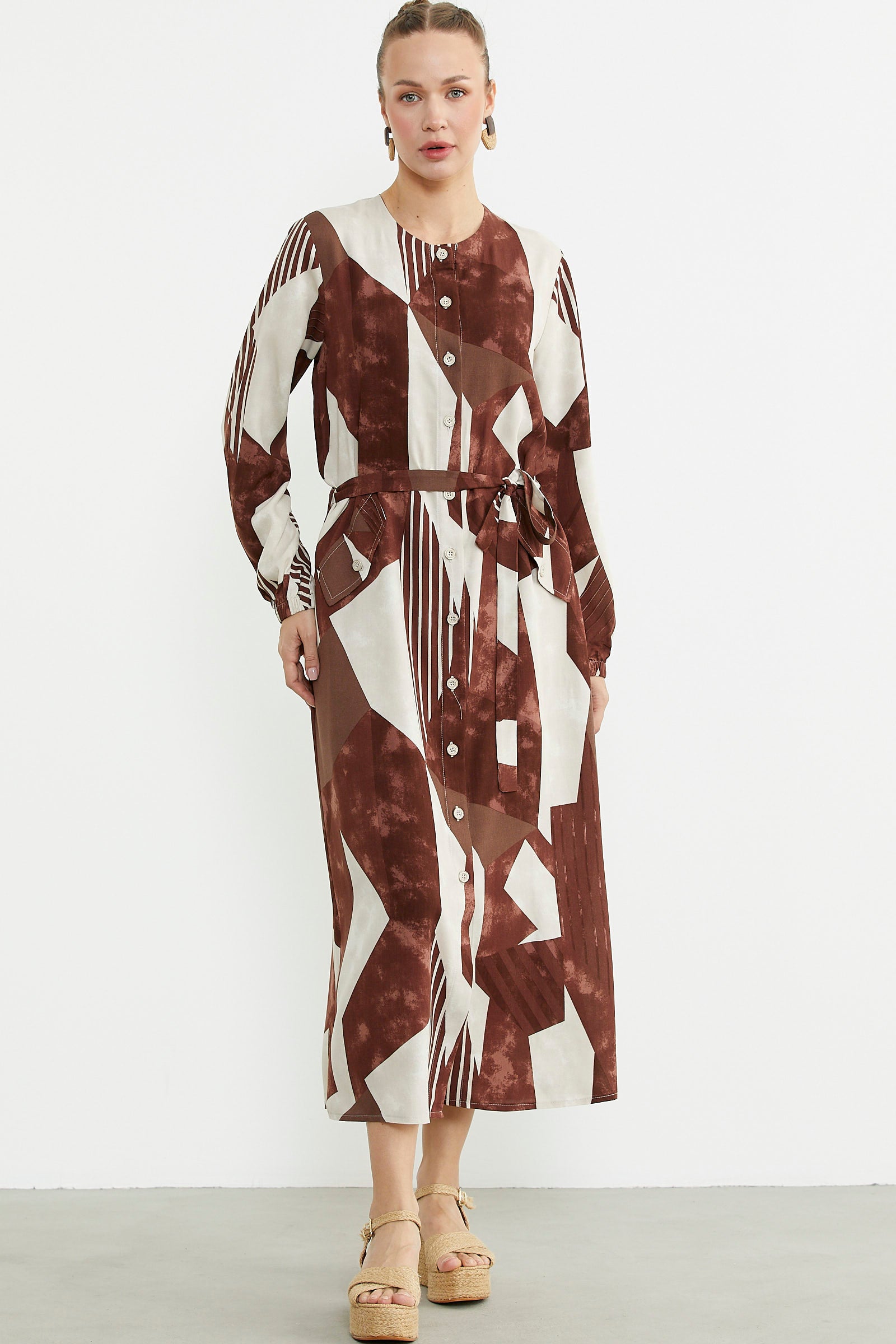 Büyük Beden Geometrik Desenli Uzun Elbise - Kahve