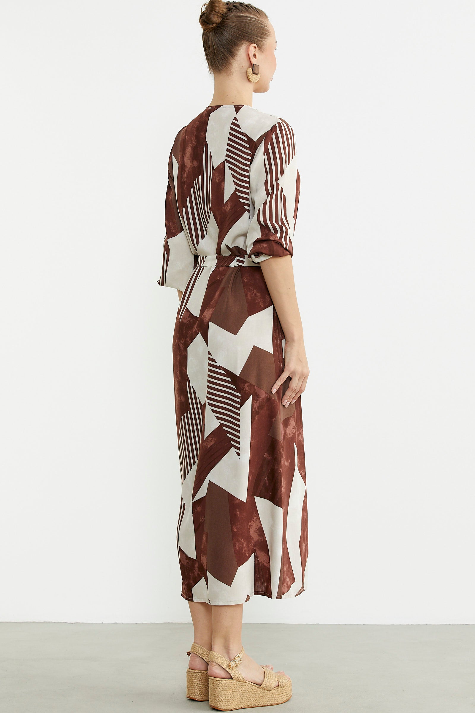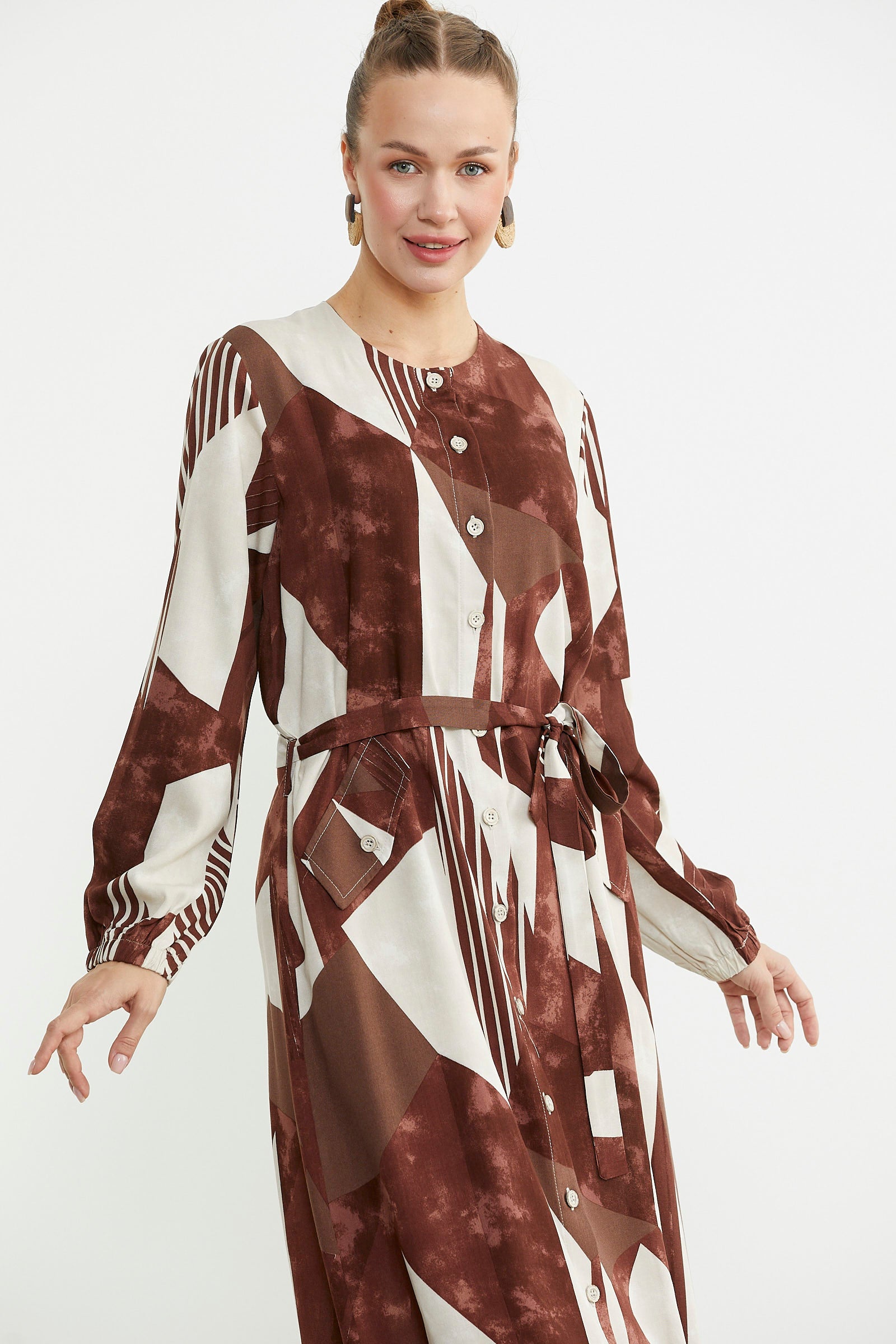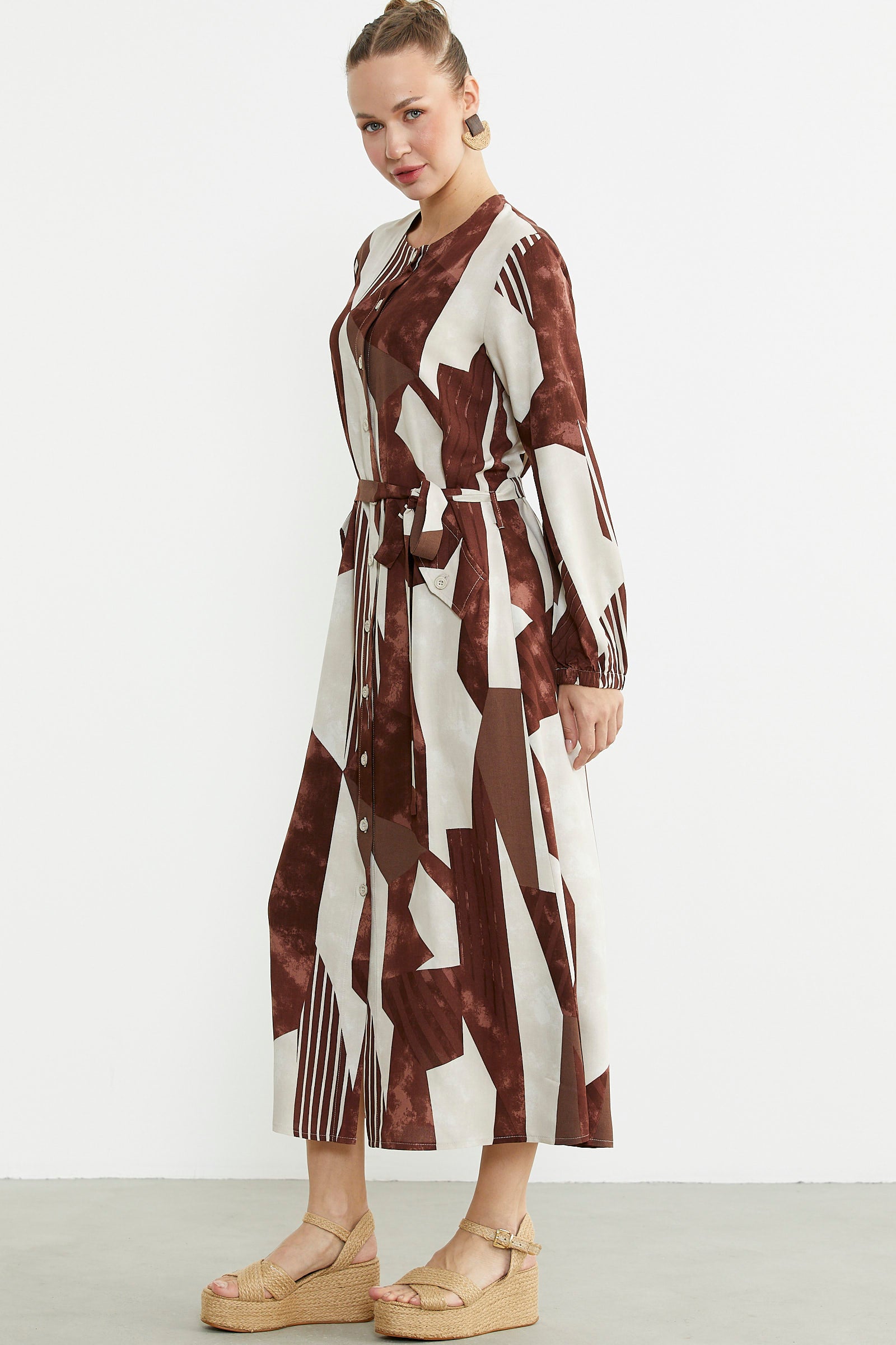 Büyük Beden Geometrik Desenli Uzun Elbise - Kahve