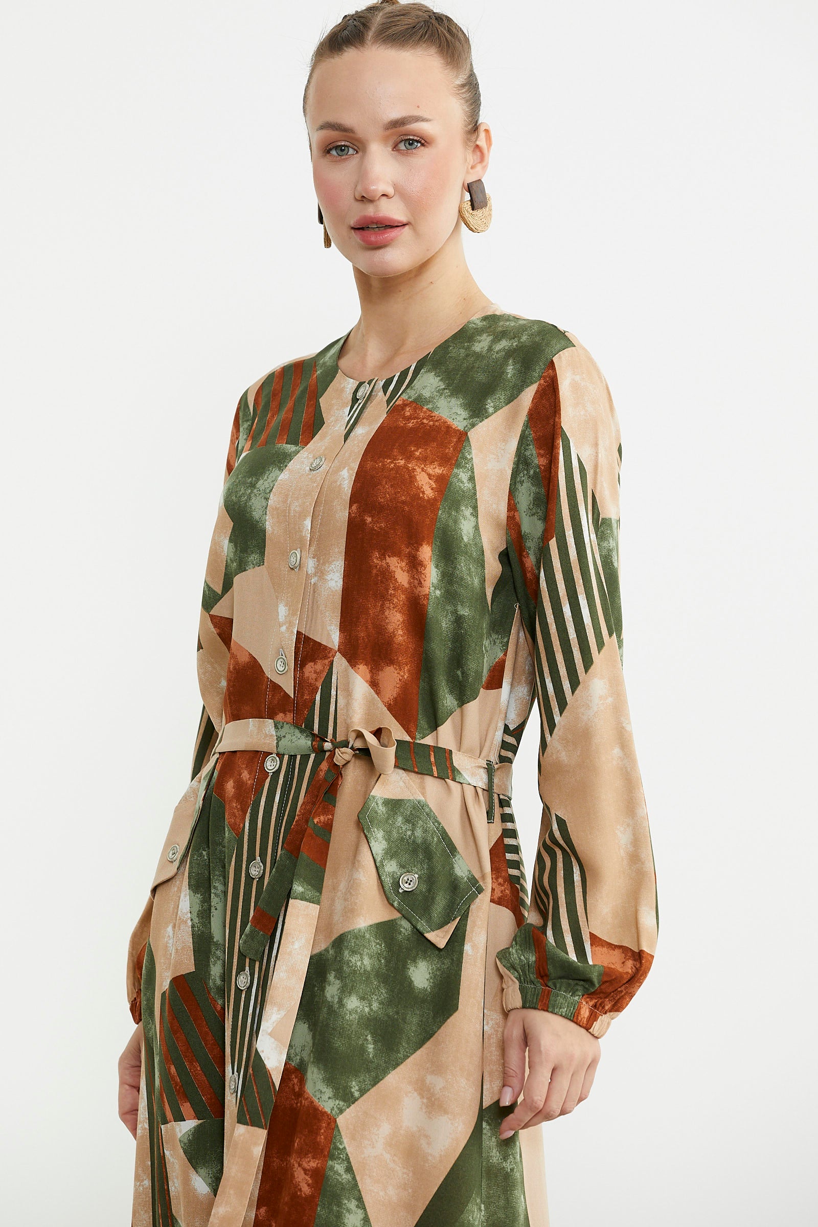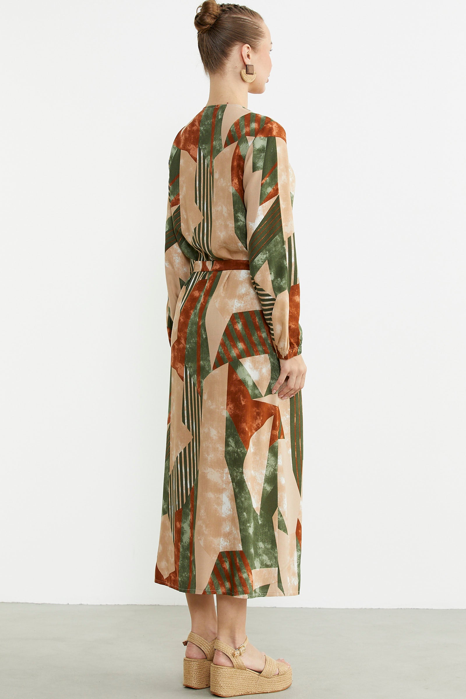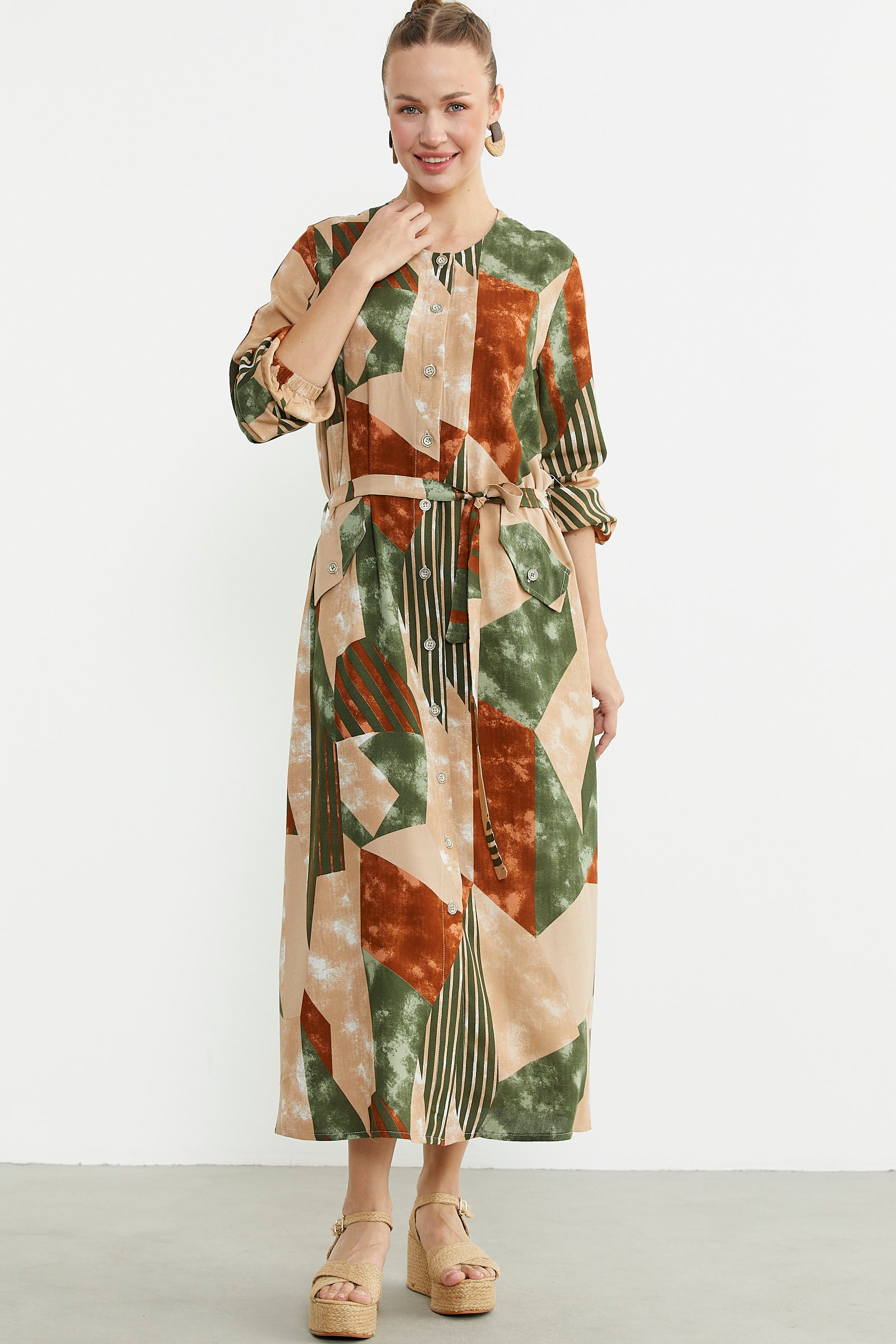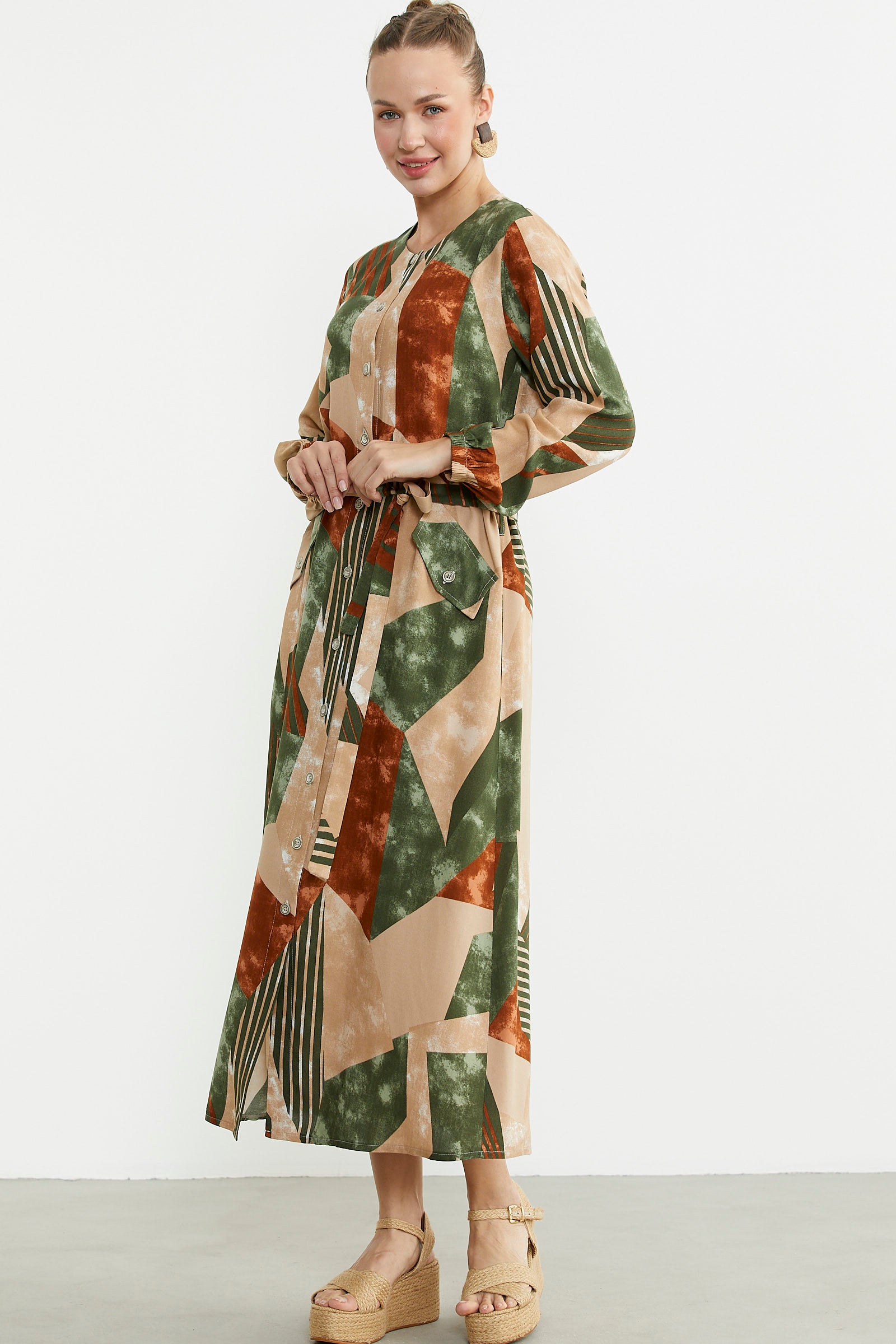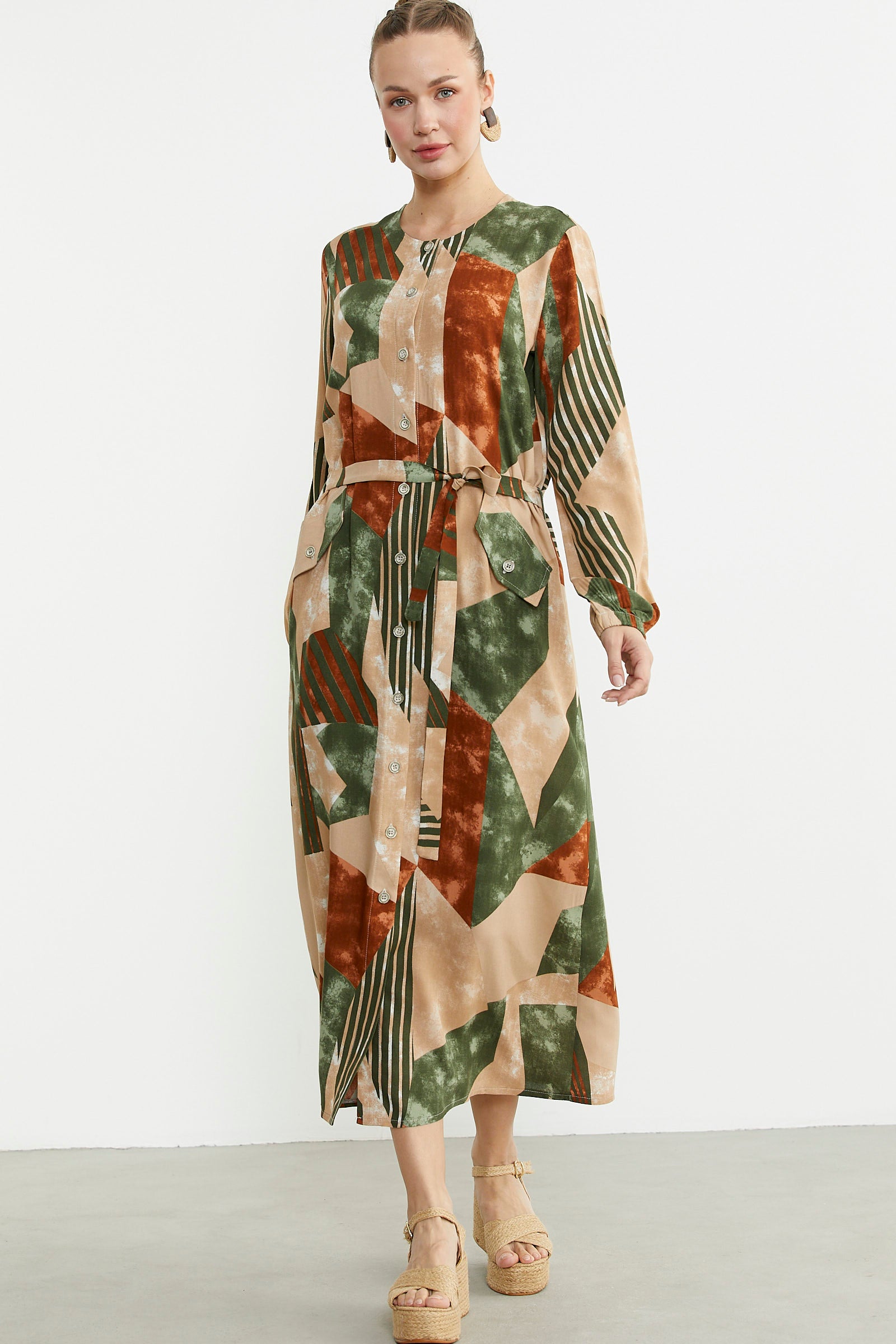 Büyük Beden Geometrik Desenli Uzun Elbise - Yeşil