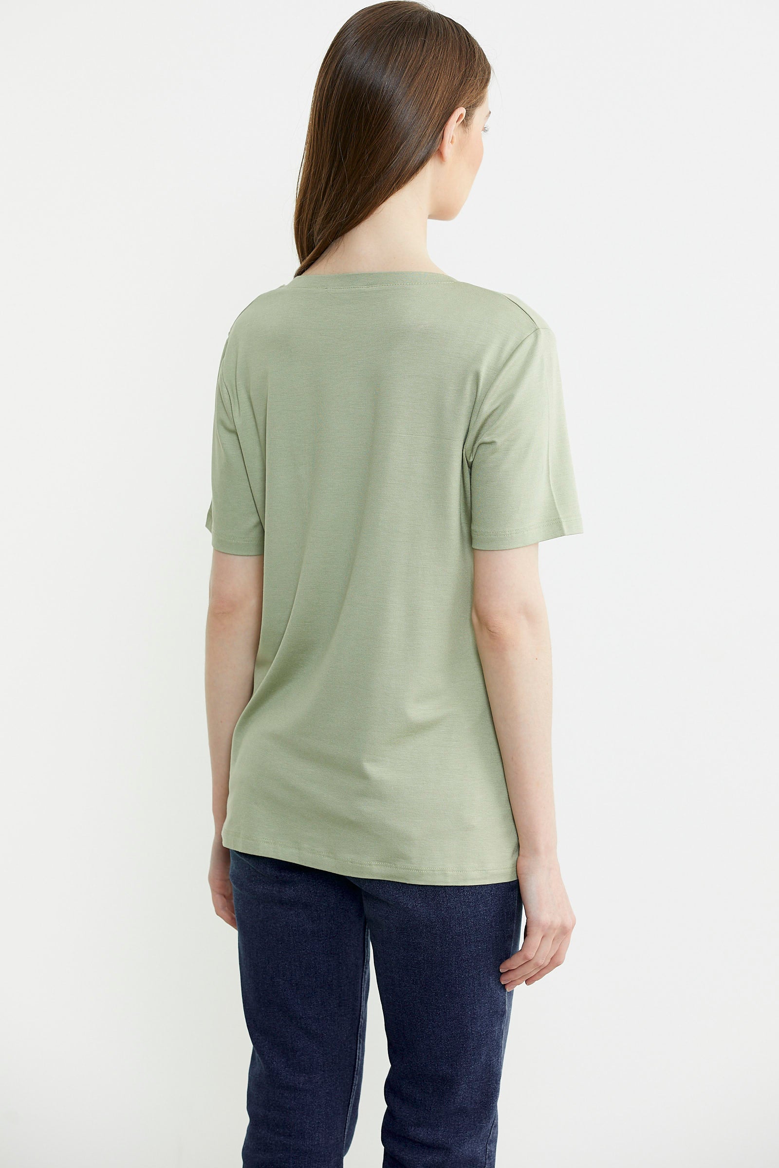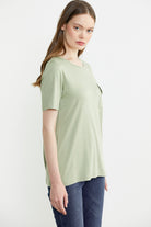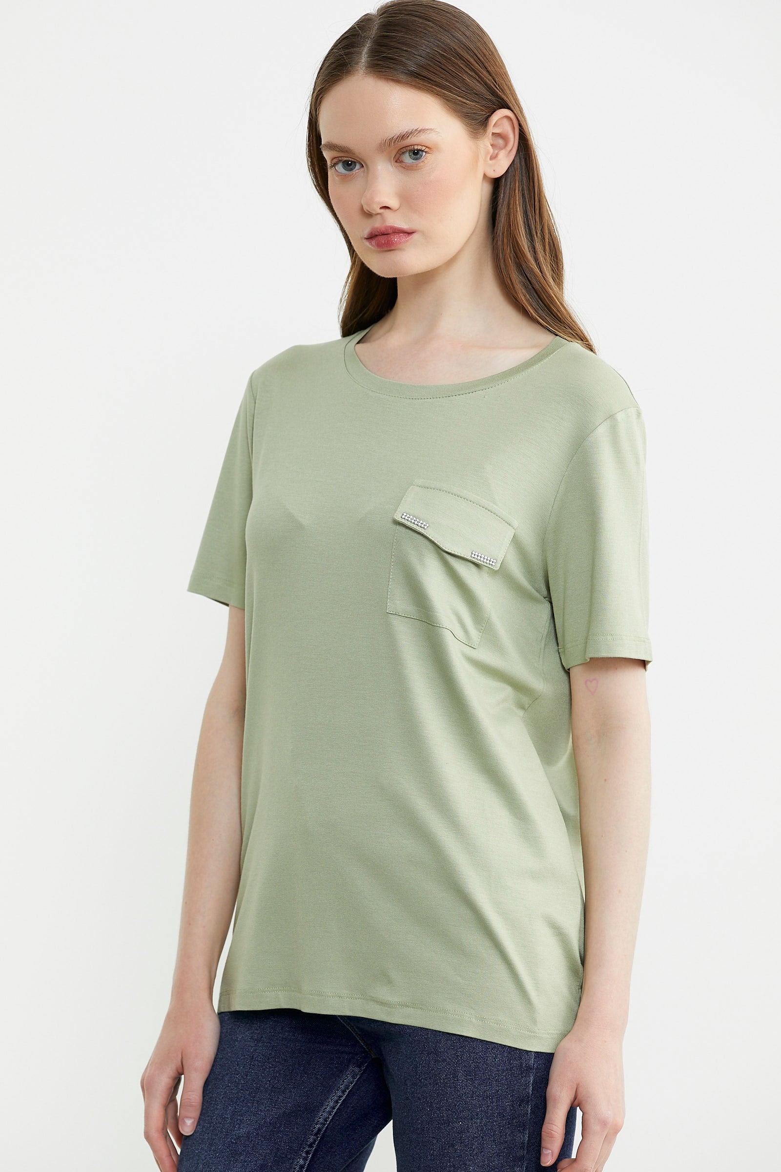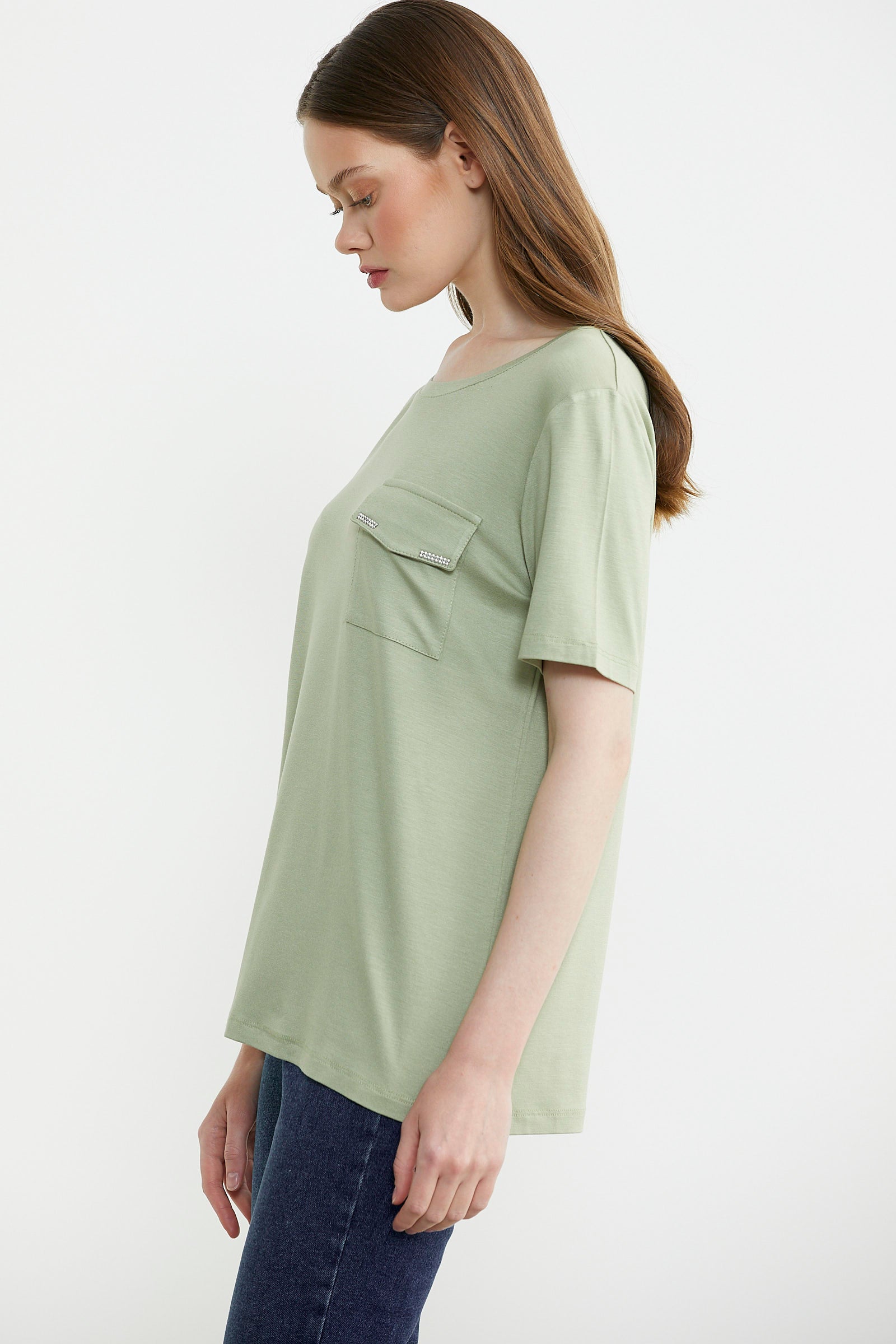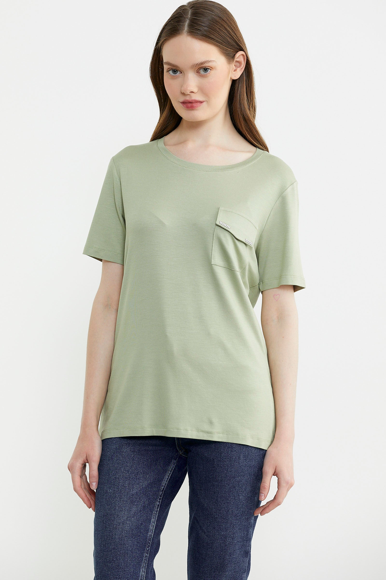 Cep Detaylı Sıfır Yaka Penye Tişört - Haki