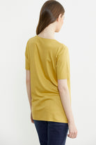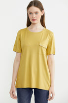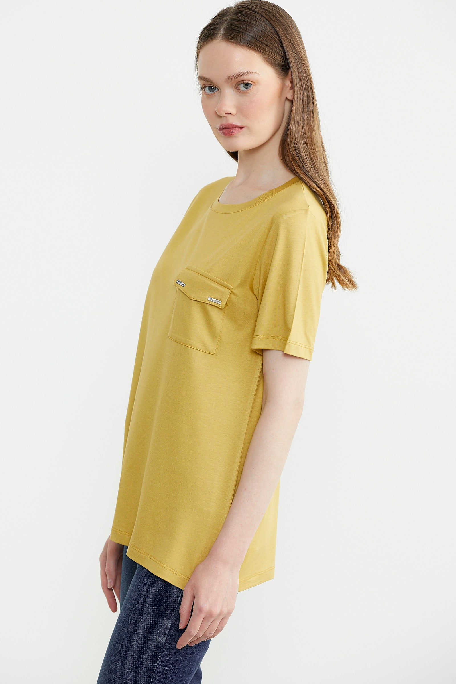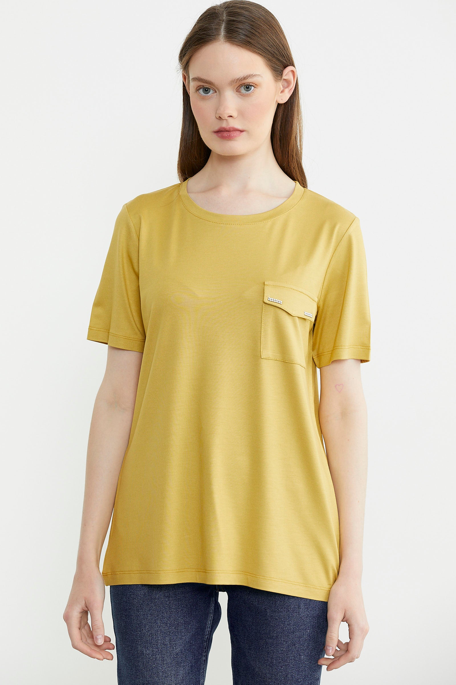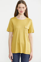 Cep Detaylı Sıfır Yaka Penye Tişört - Hardal