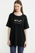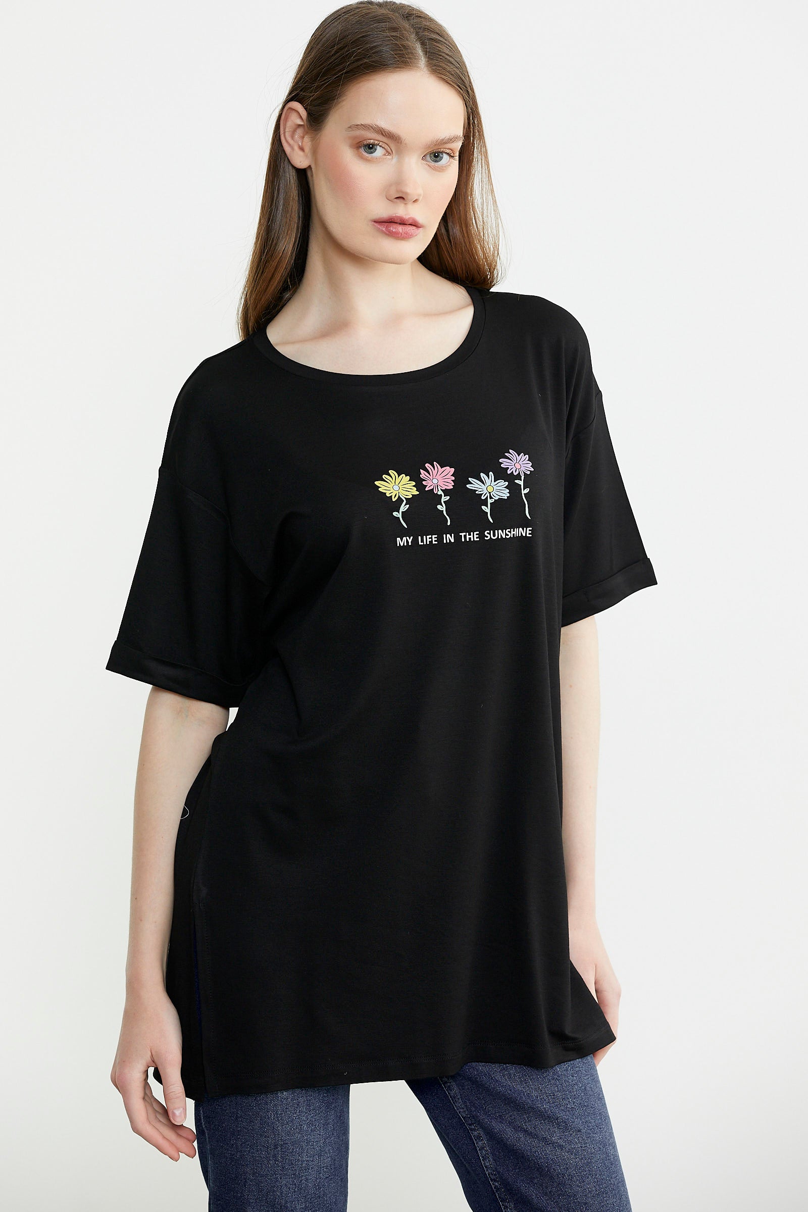 Çiçek Baskılı Bisiklet Yaka Tişört - Siyah