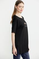 Zarif baskı detayıyla hareket kazanan kısa kollu tişört, tunik boydur. Yuvarlak yakalı modern görünümlü bir modeldir.