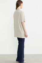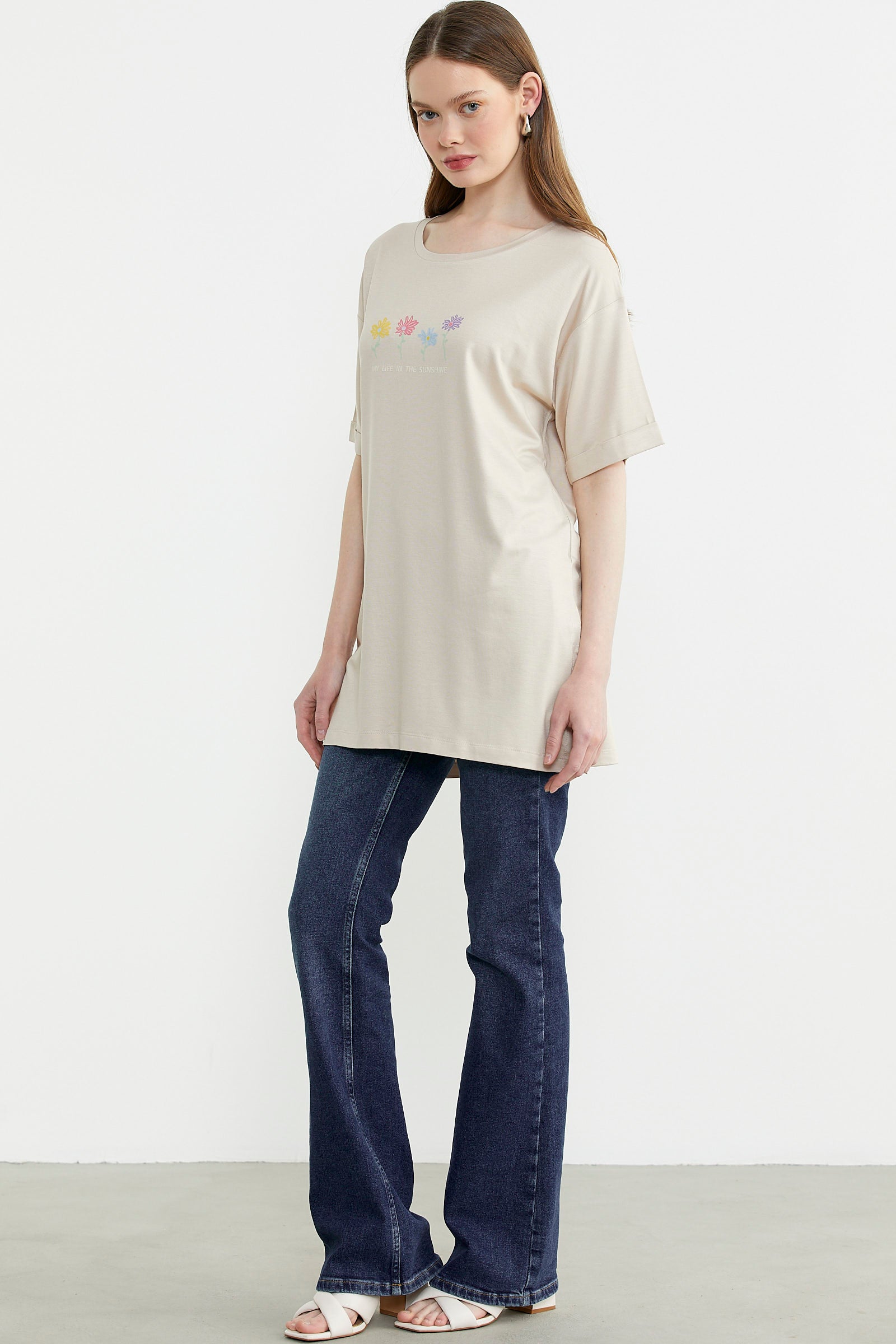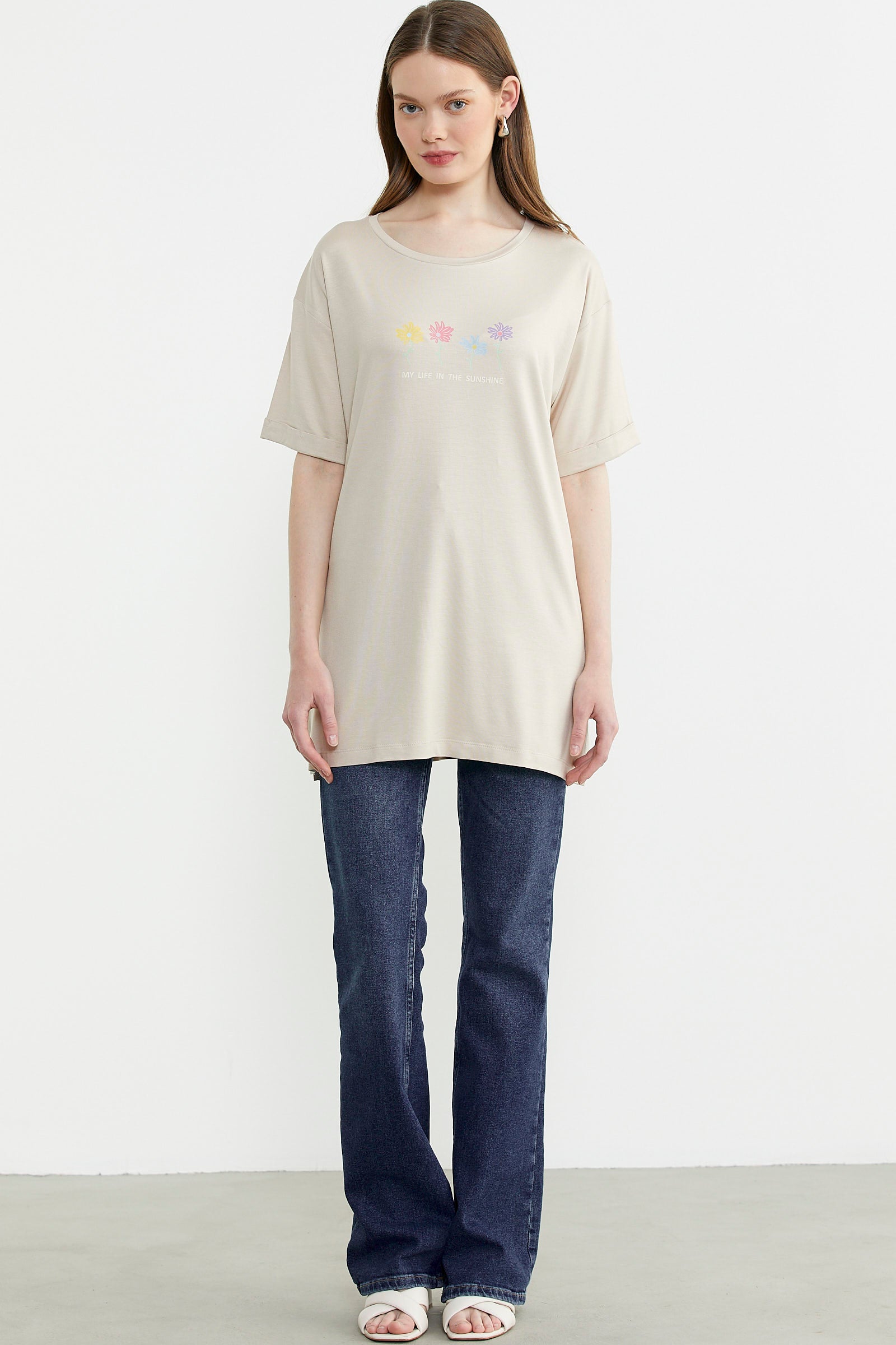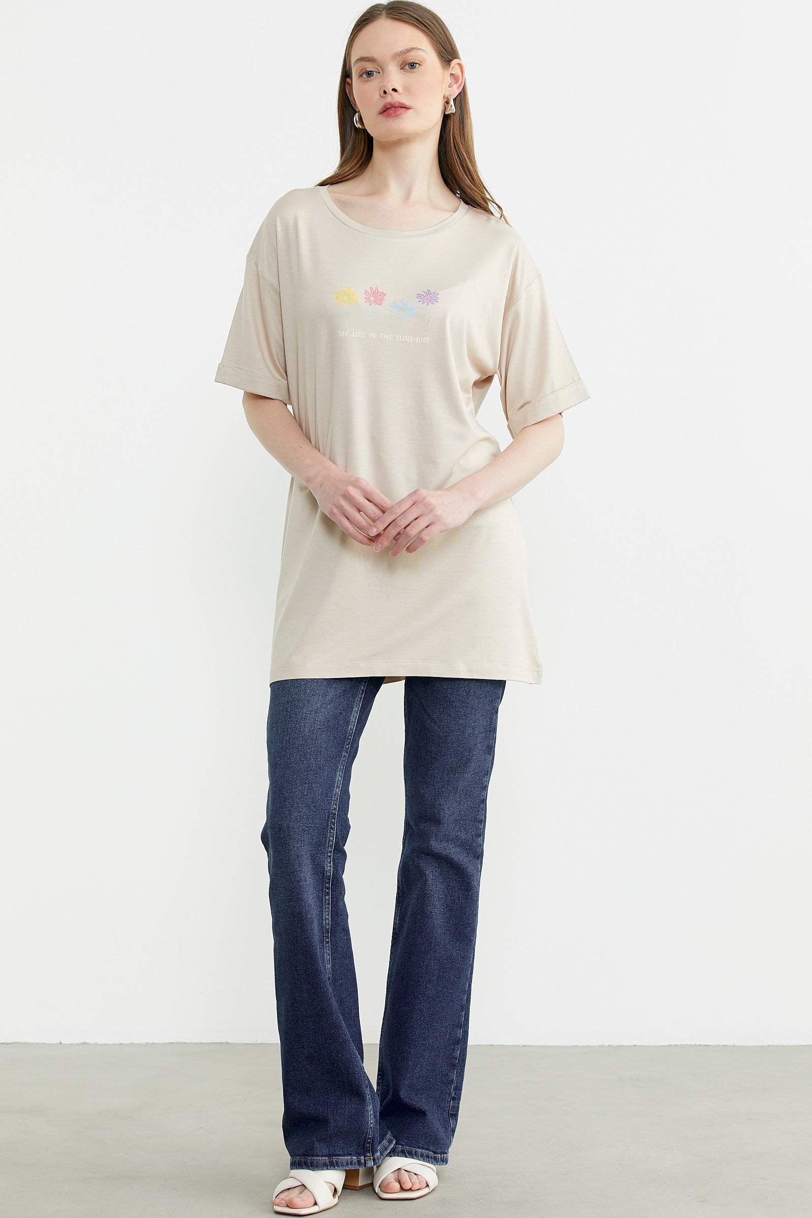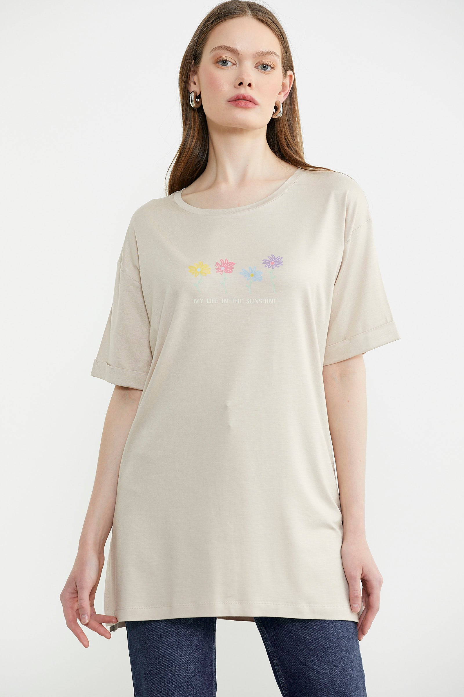 Zarif baskı detayıyla hareket kazanan kısa kollu tişört, tunik boydur. Yuvarlak yakalı modern görünümlü bir modeldir.