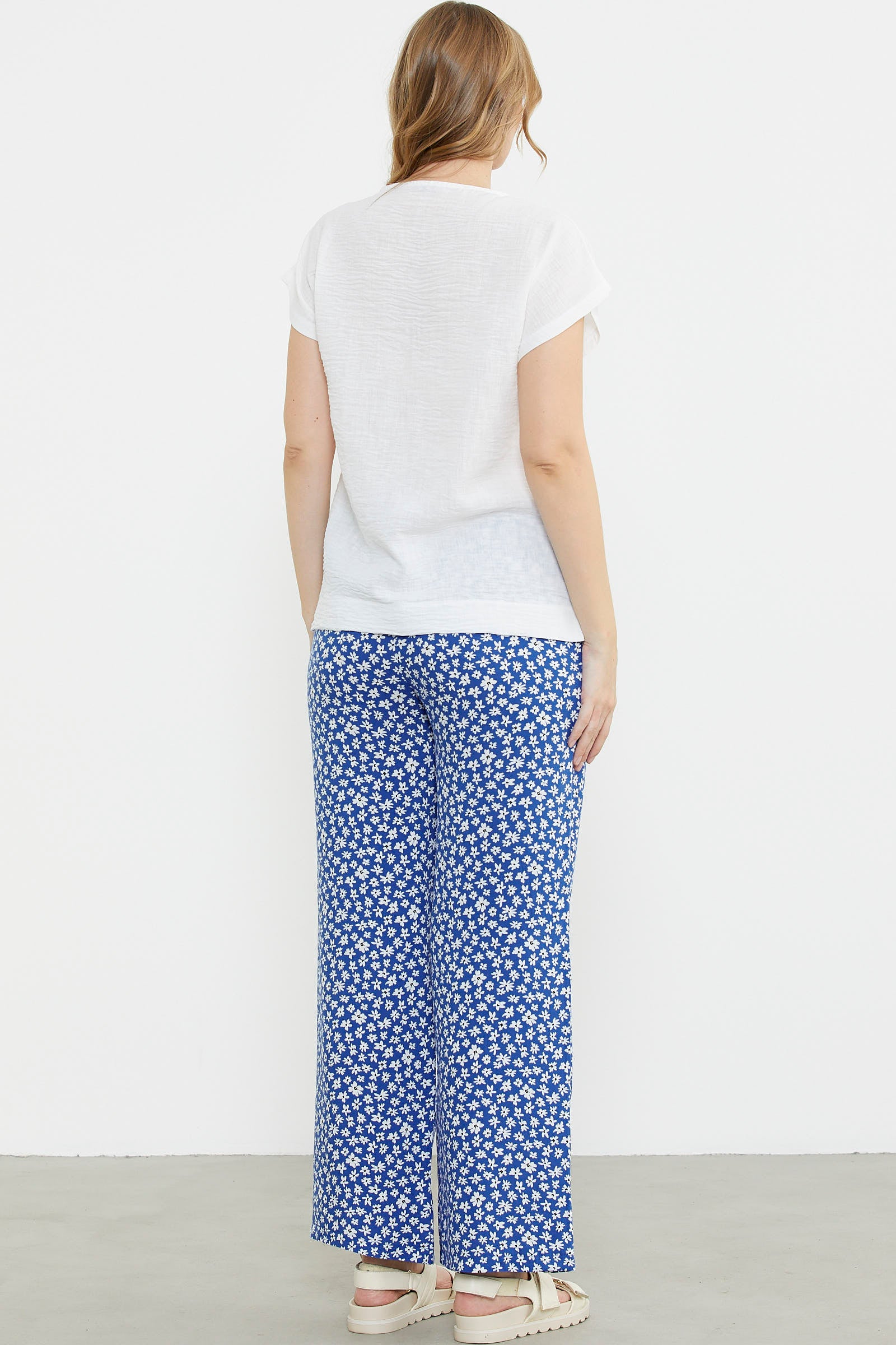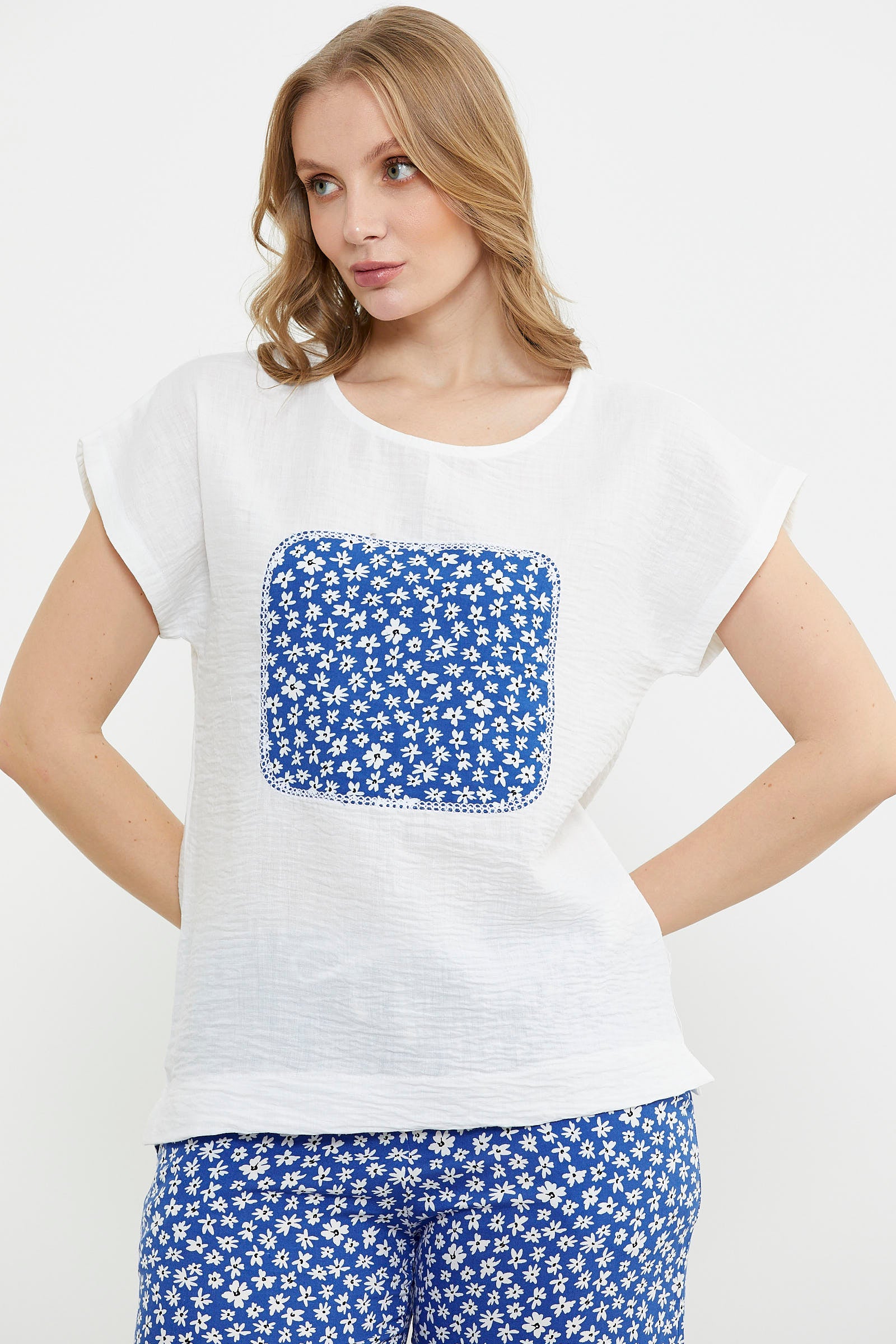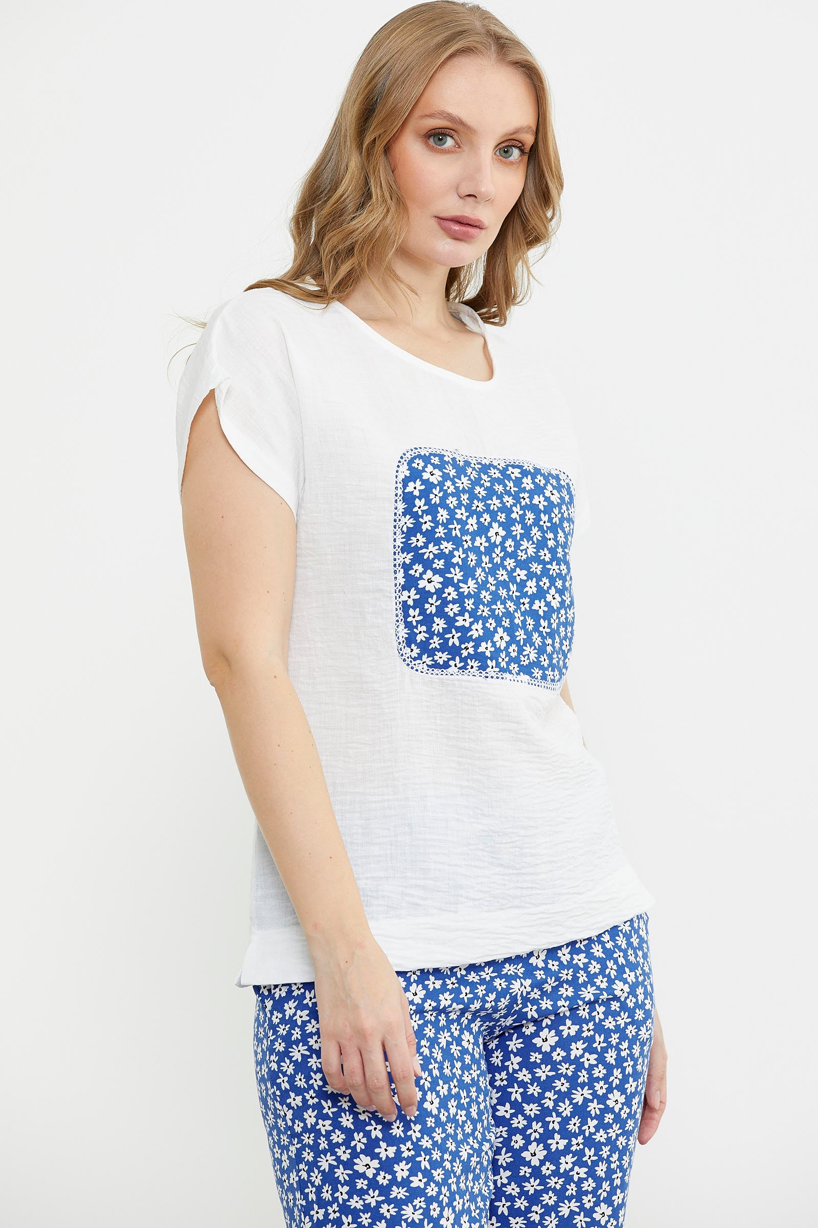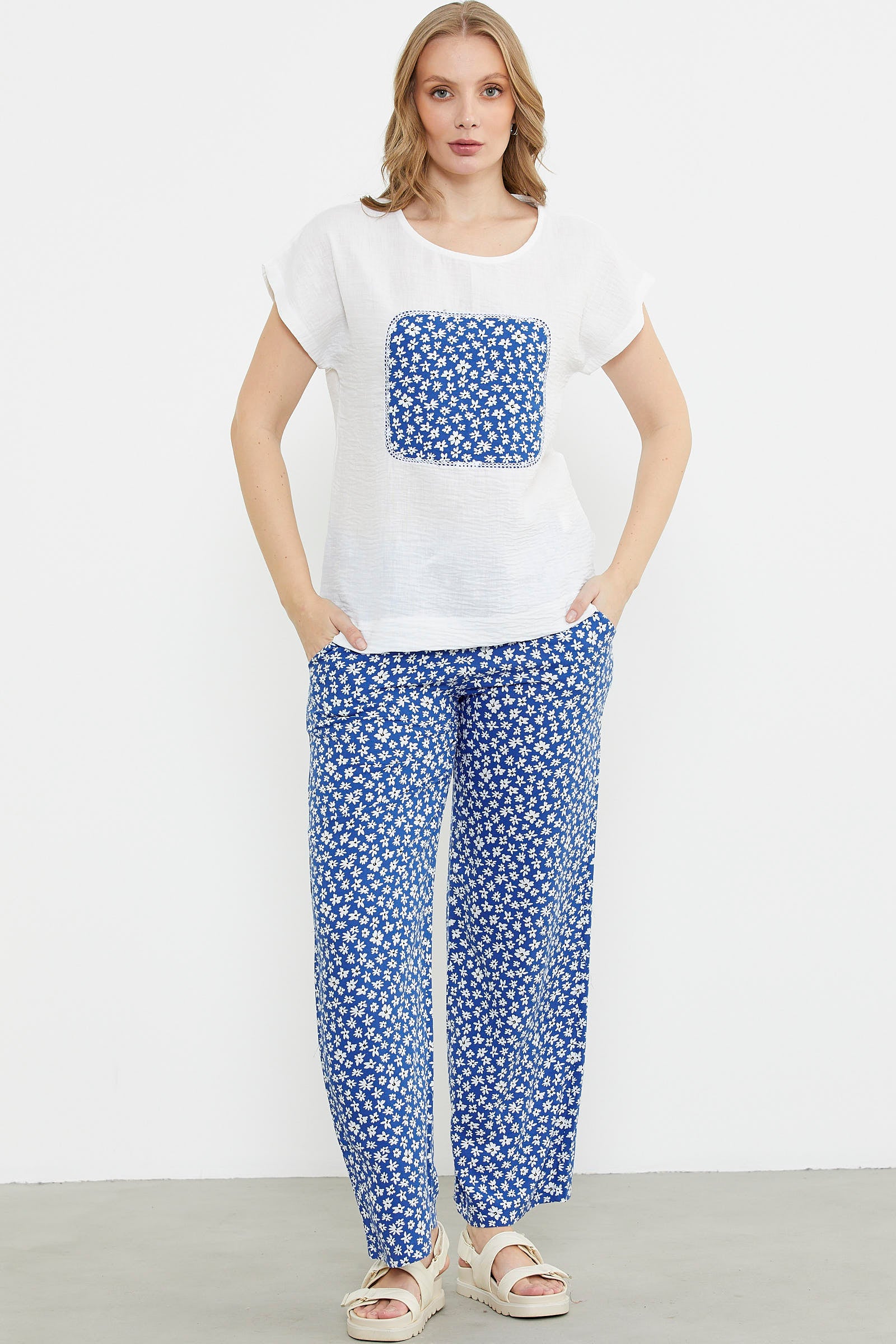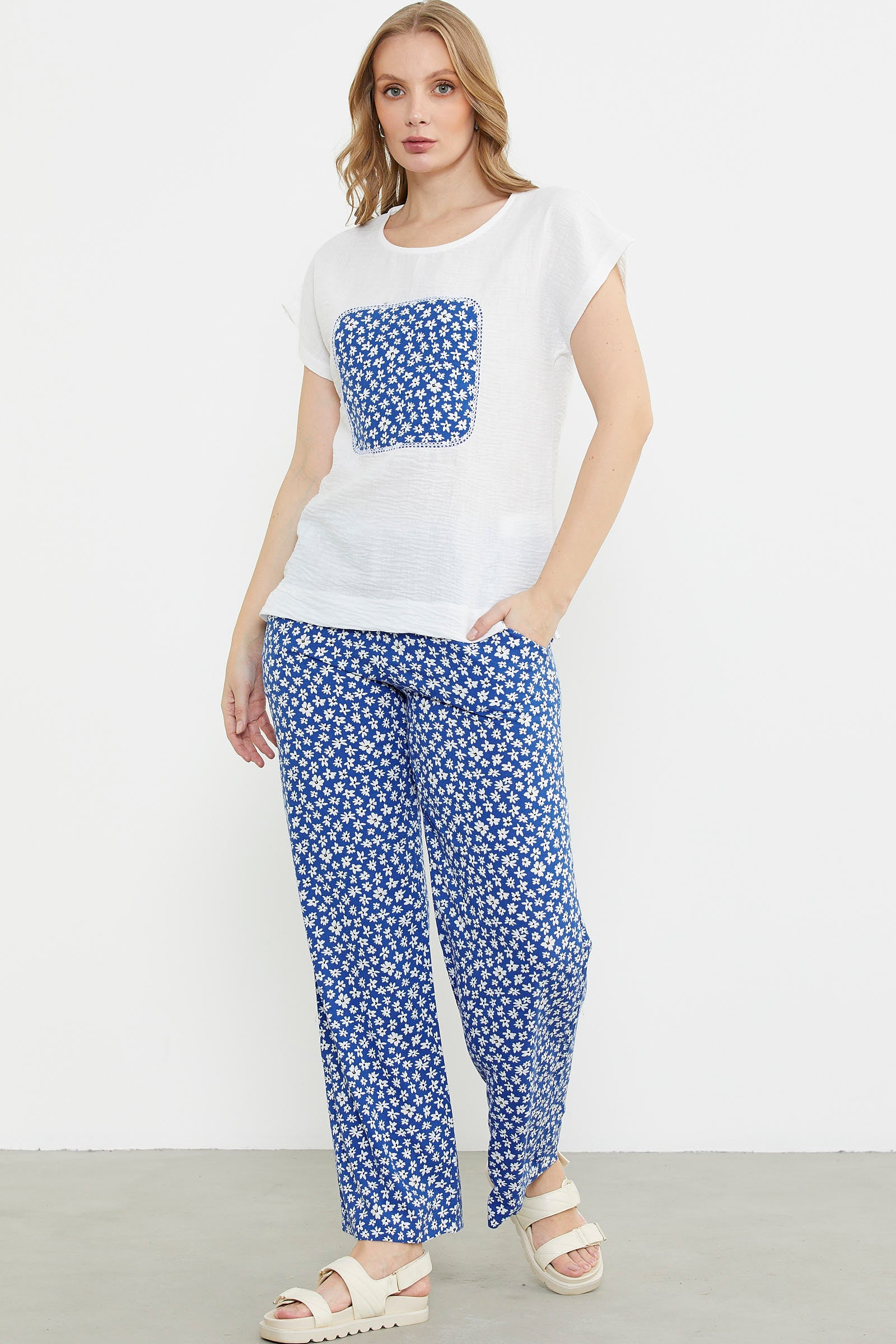 Viskon ve krep jarseden üst ve pantolon içeren takım. Yuvarlak yakalı, kısa kollu. Alt çiçekli ve bol paça pantolon.