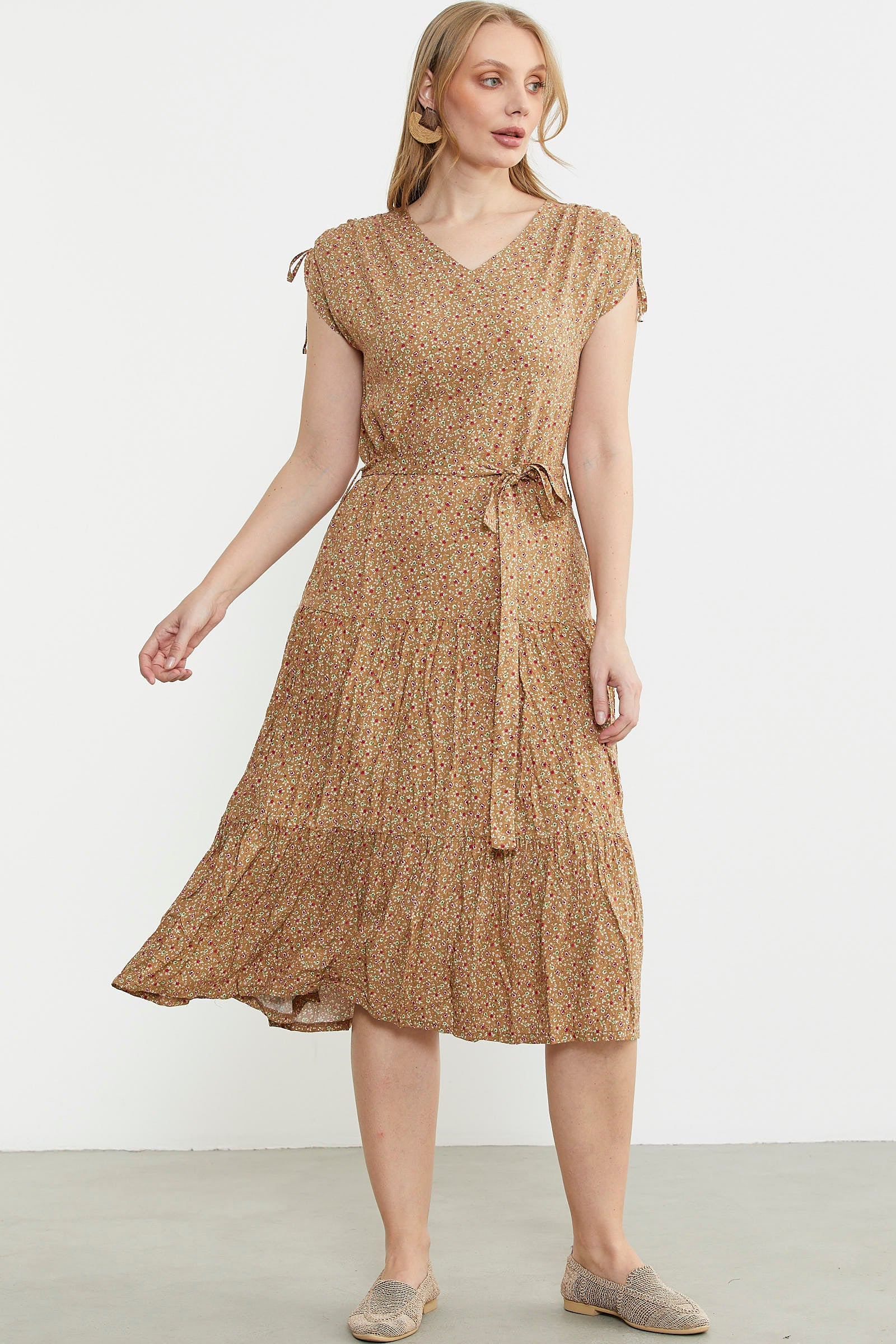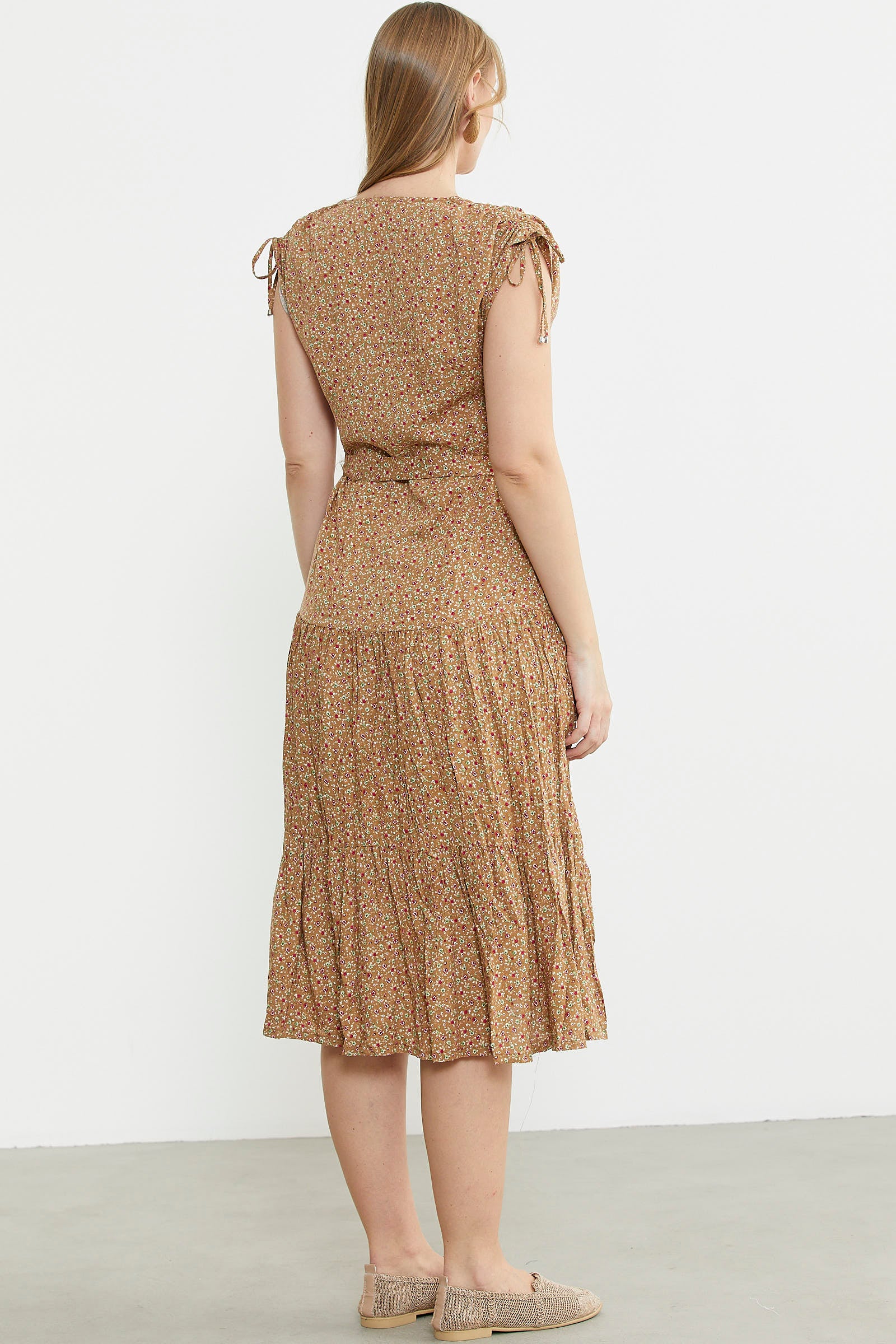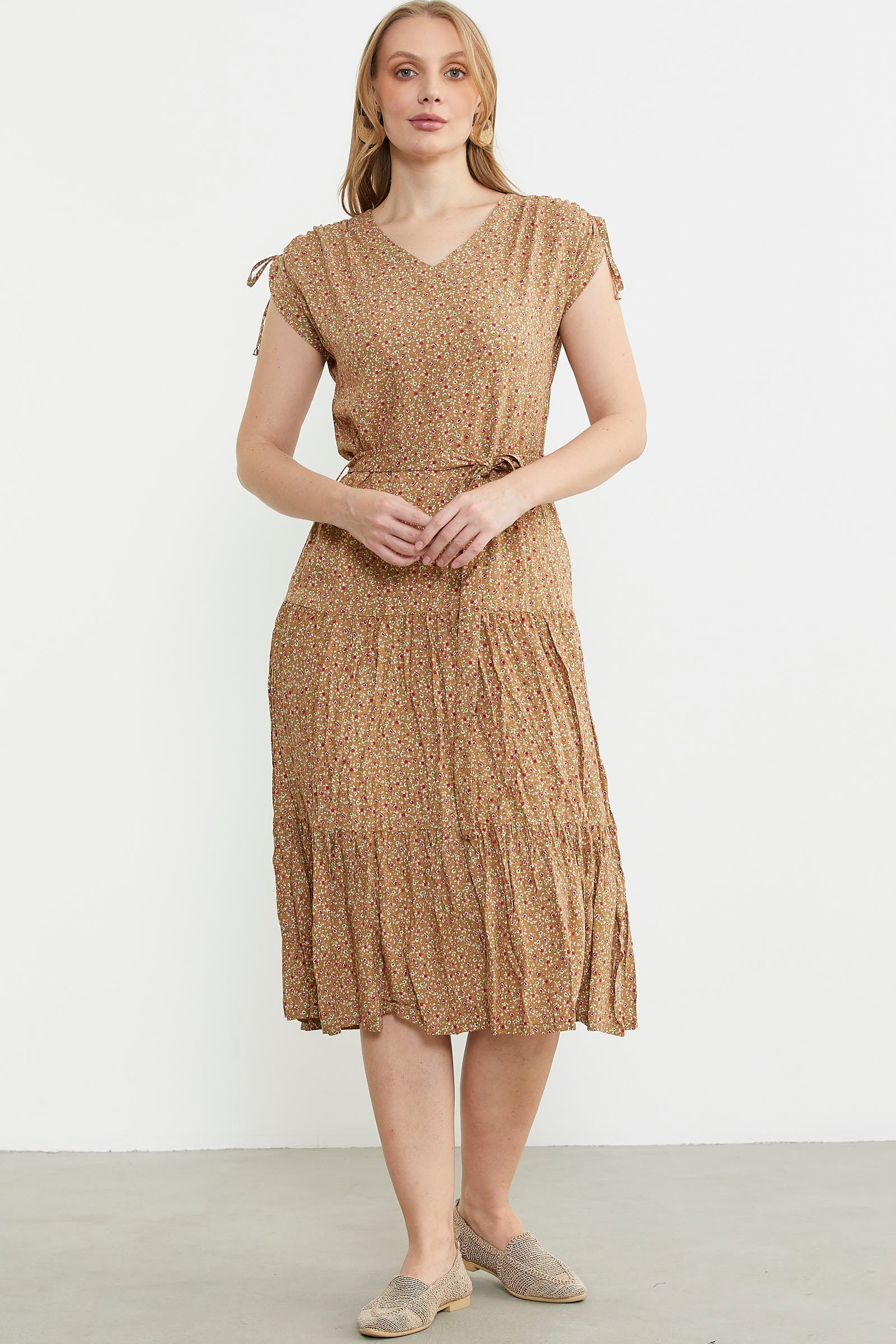 Omuzları ayarlanabilir. V yaka, çiçekli elbise. Midi boy, rahat kalıp ve beli kuşaklıdır.
