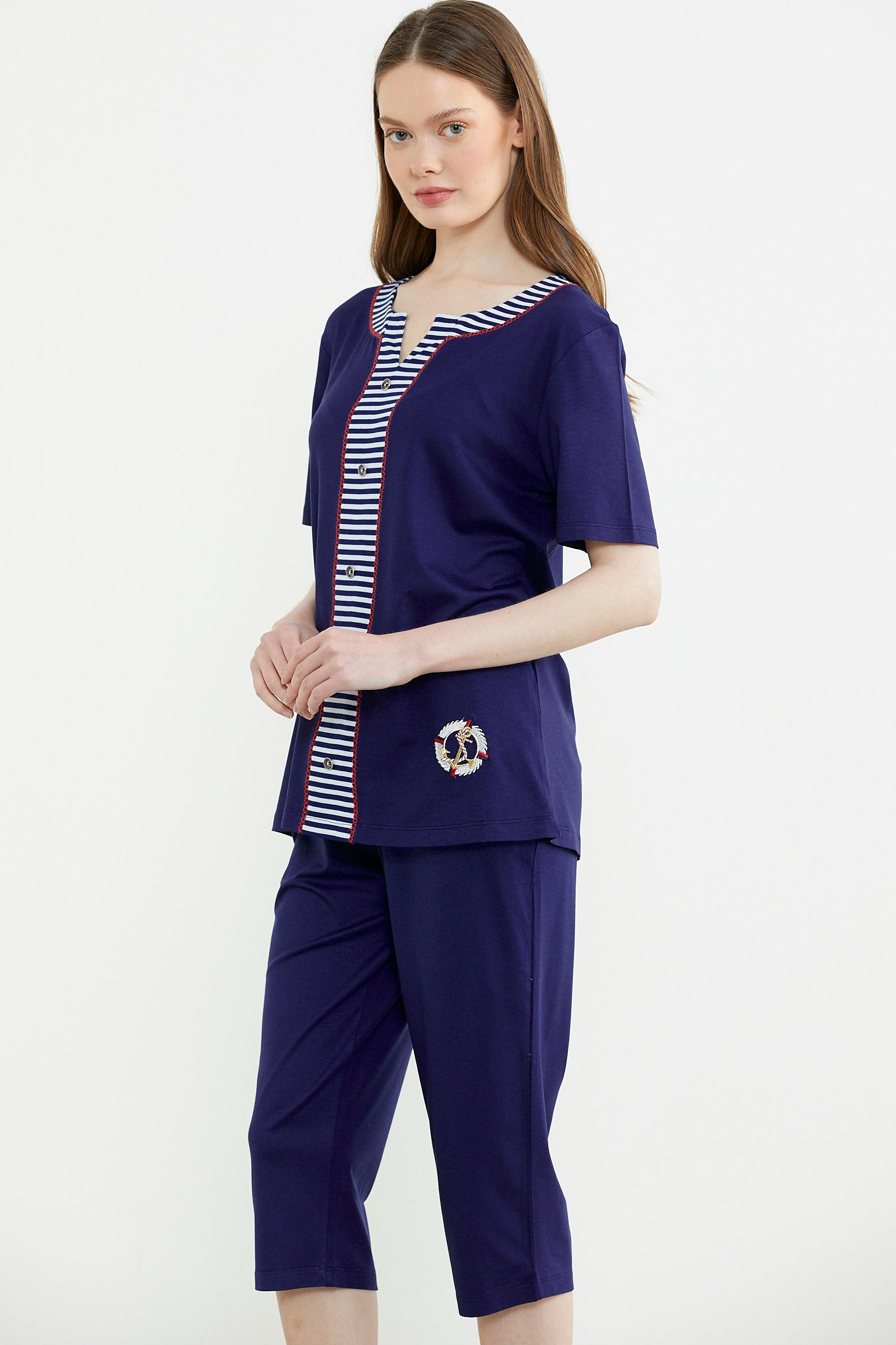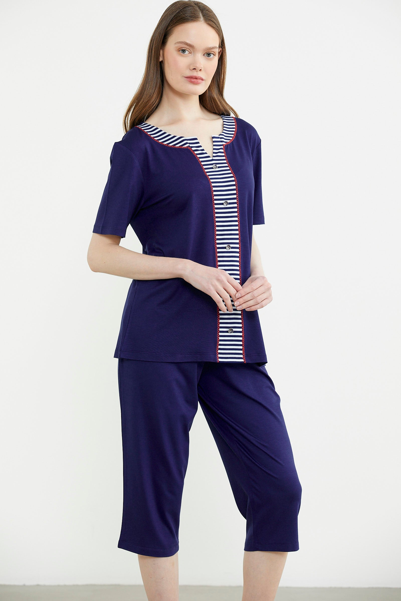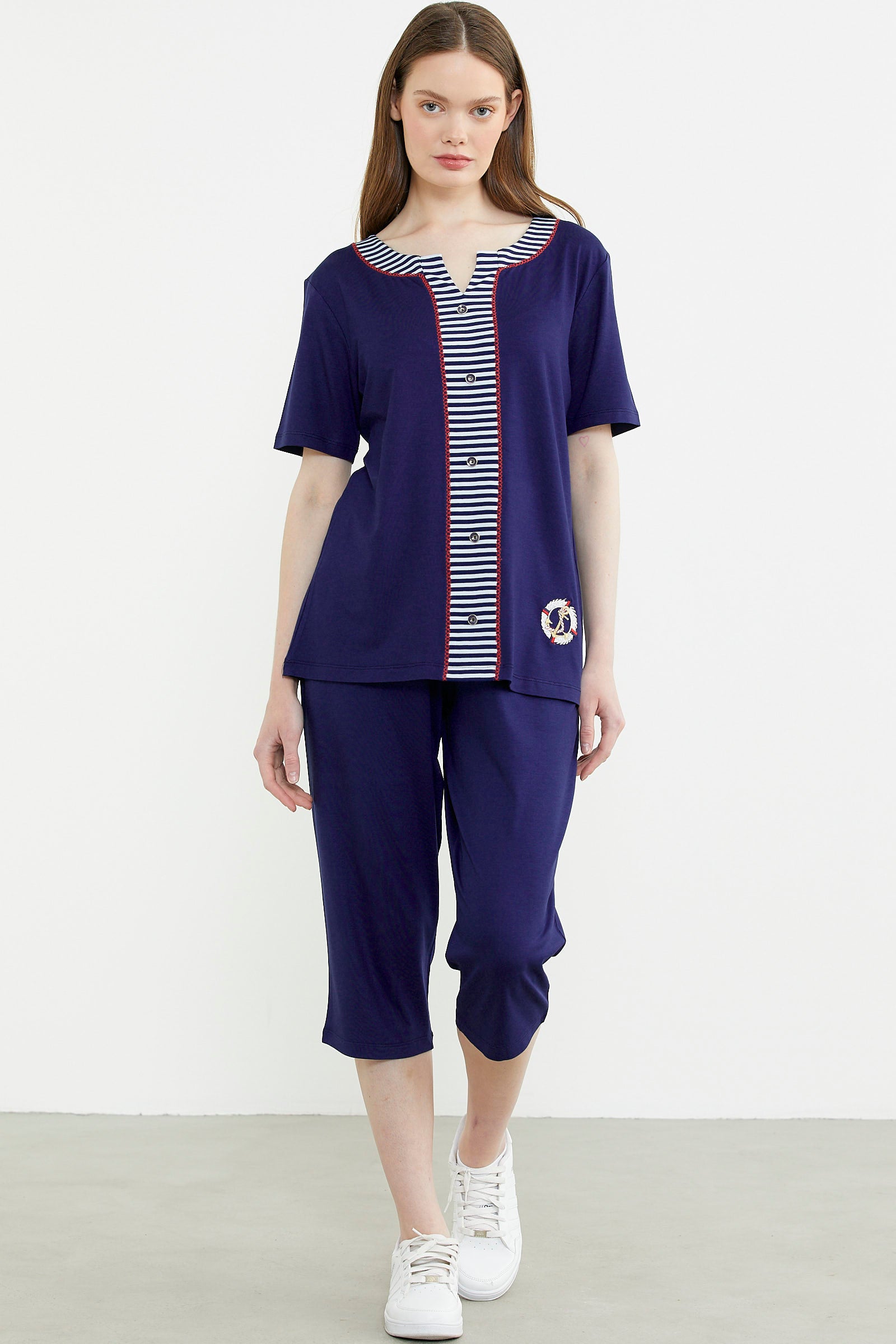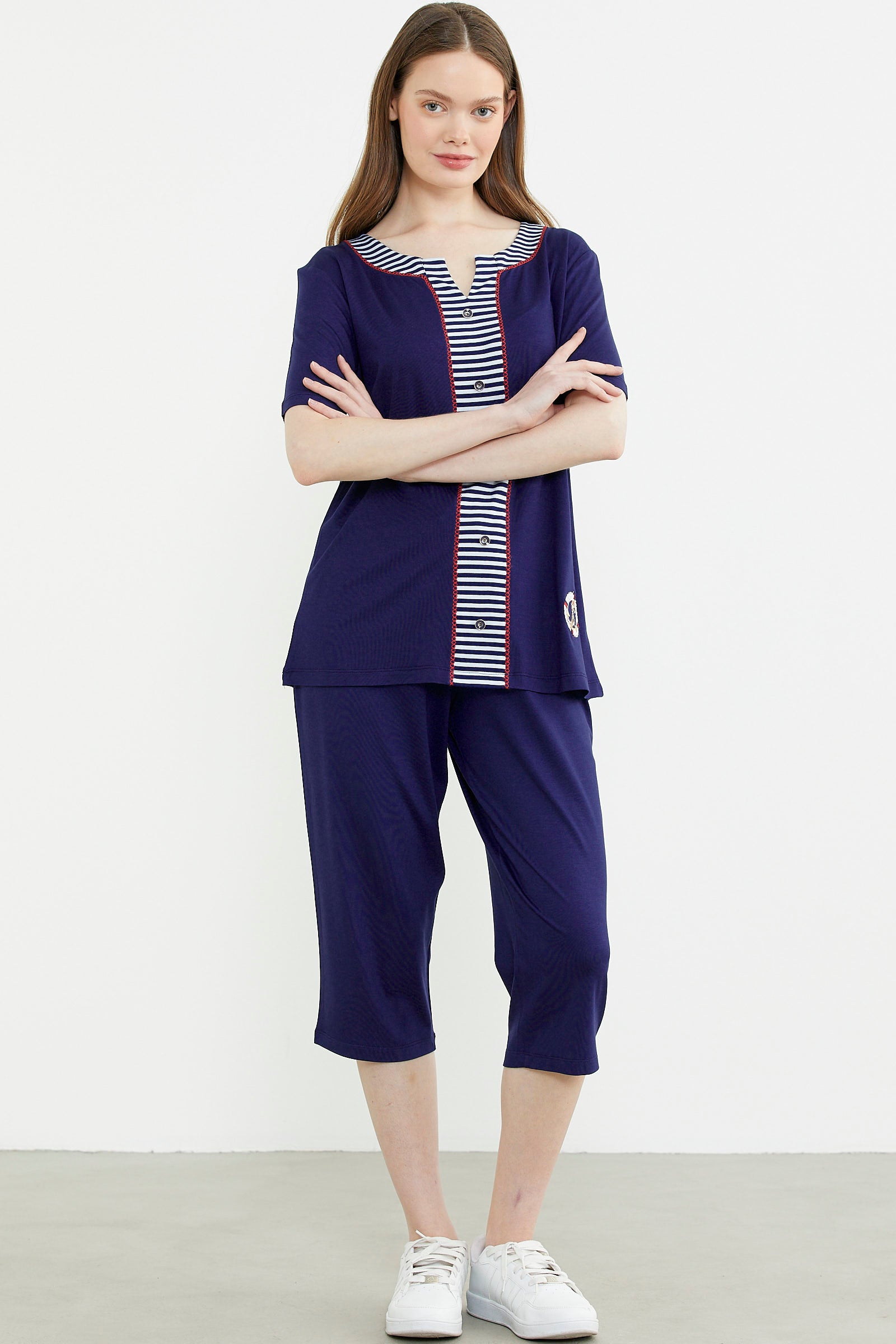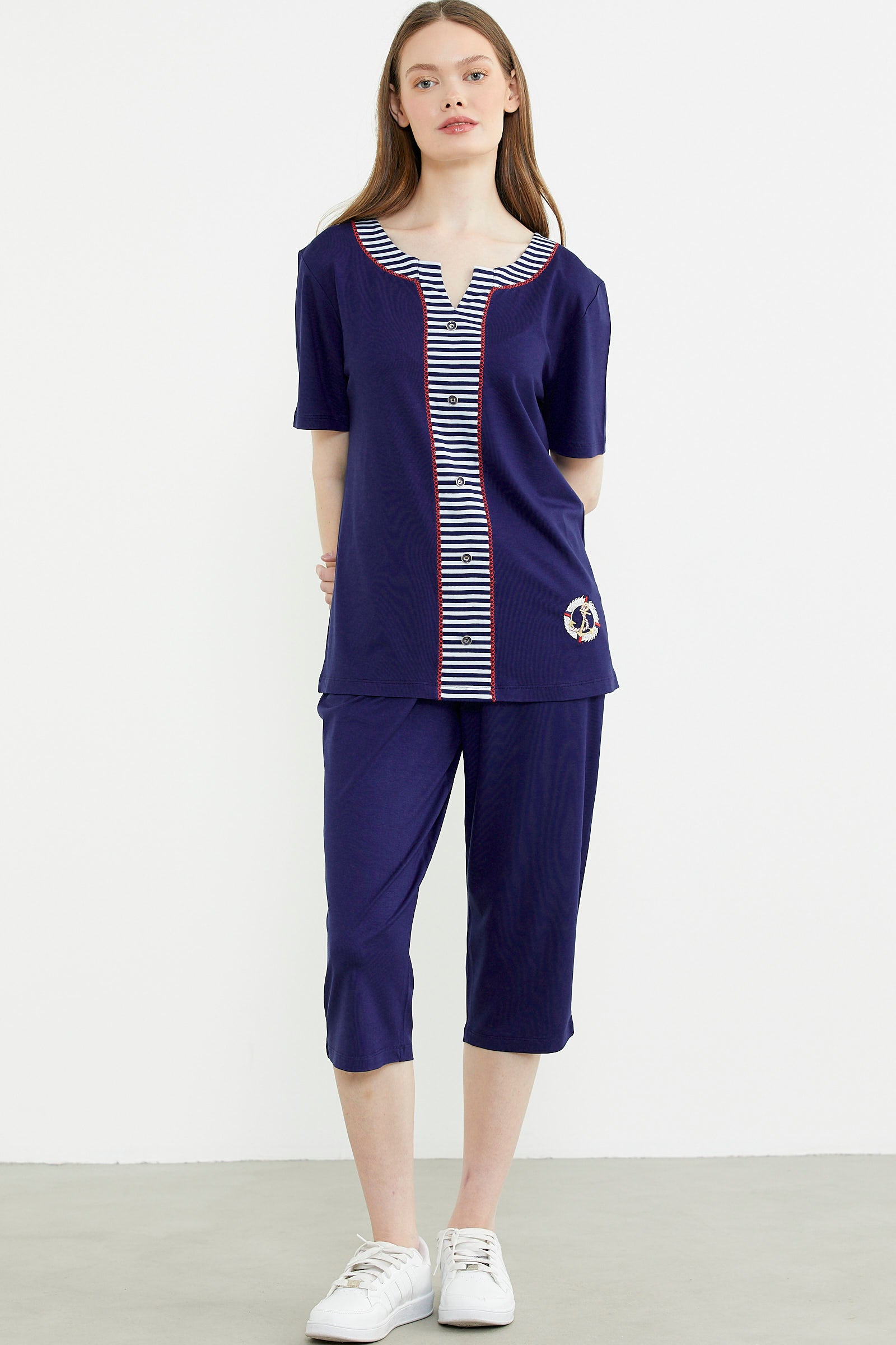 Marin detaylı rahat kalıp kapri takım geniş yaka ve kontrast dikiş detayıyla öne çıkıyor. Yumuşak dokusuyla günlük kullanım için idealdir.