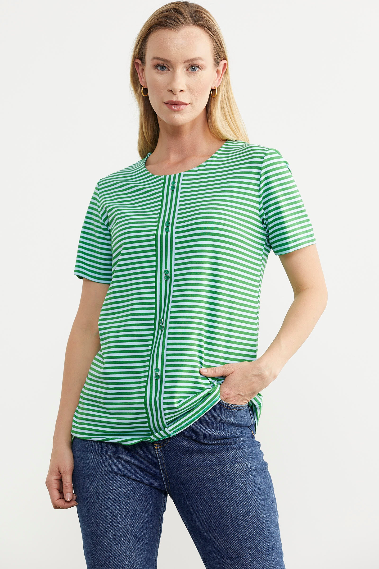 Çizgili Düğme Detaylı Tişört - Yeşil