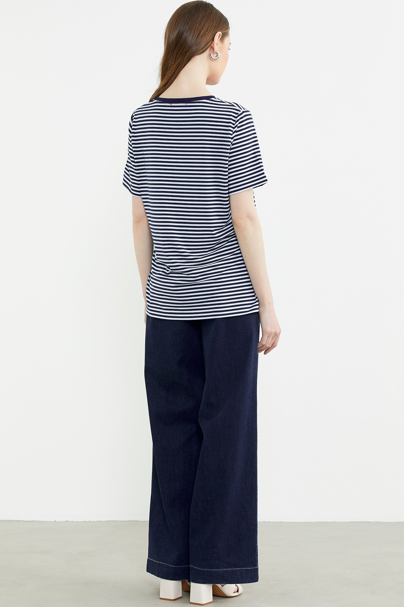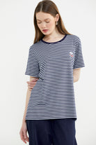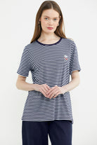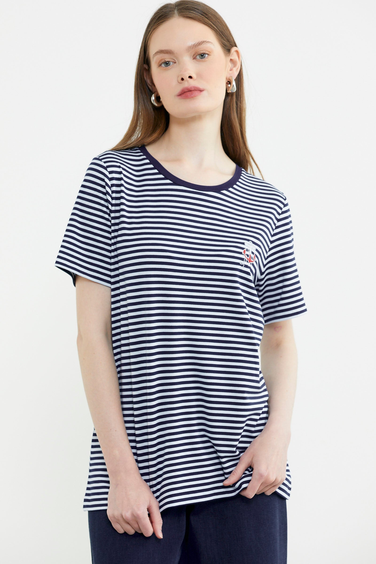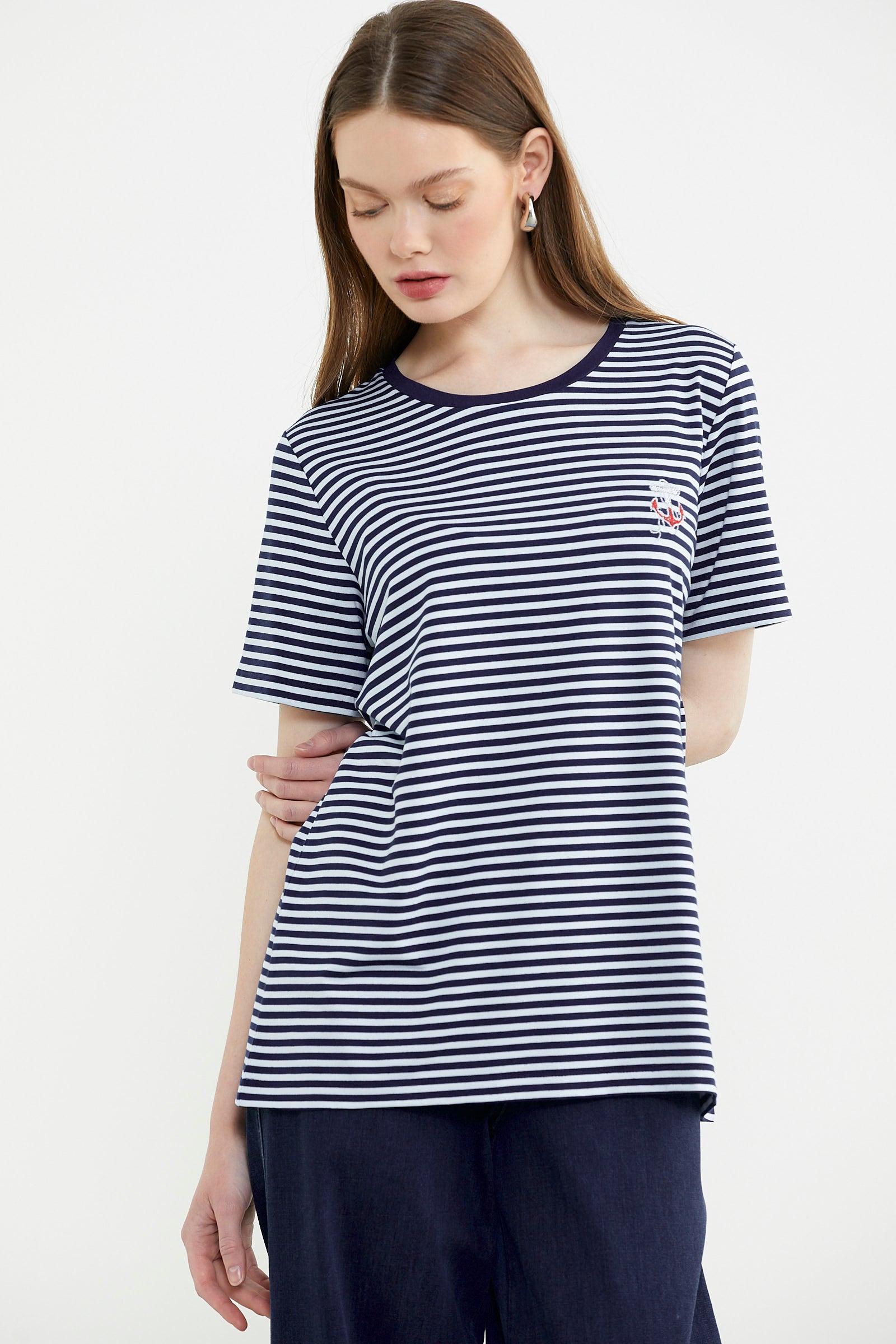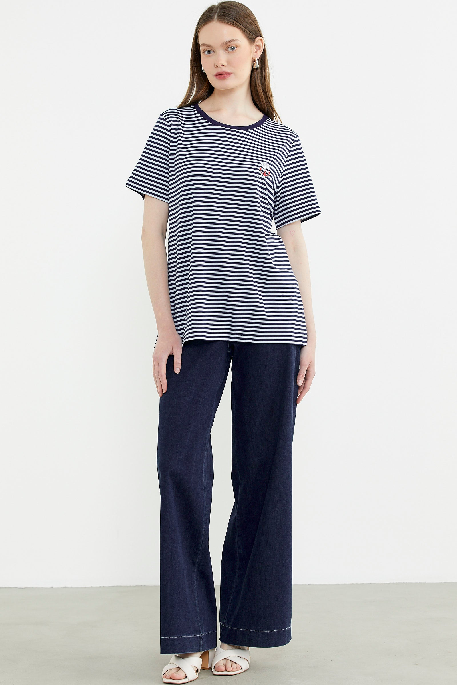 Çizgili Nakış Detaylı Penye Tişört - Lacivert