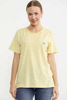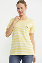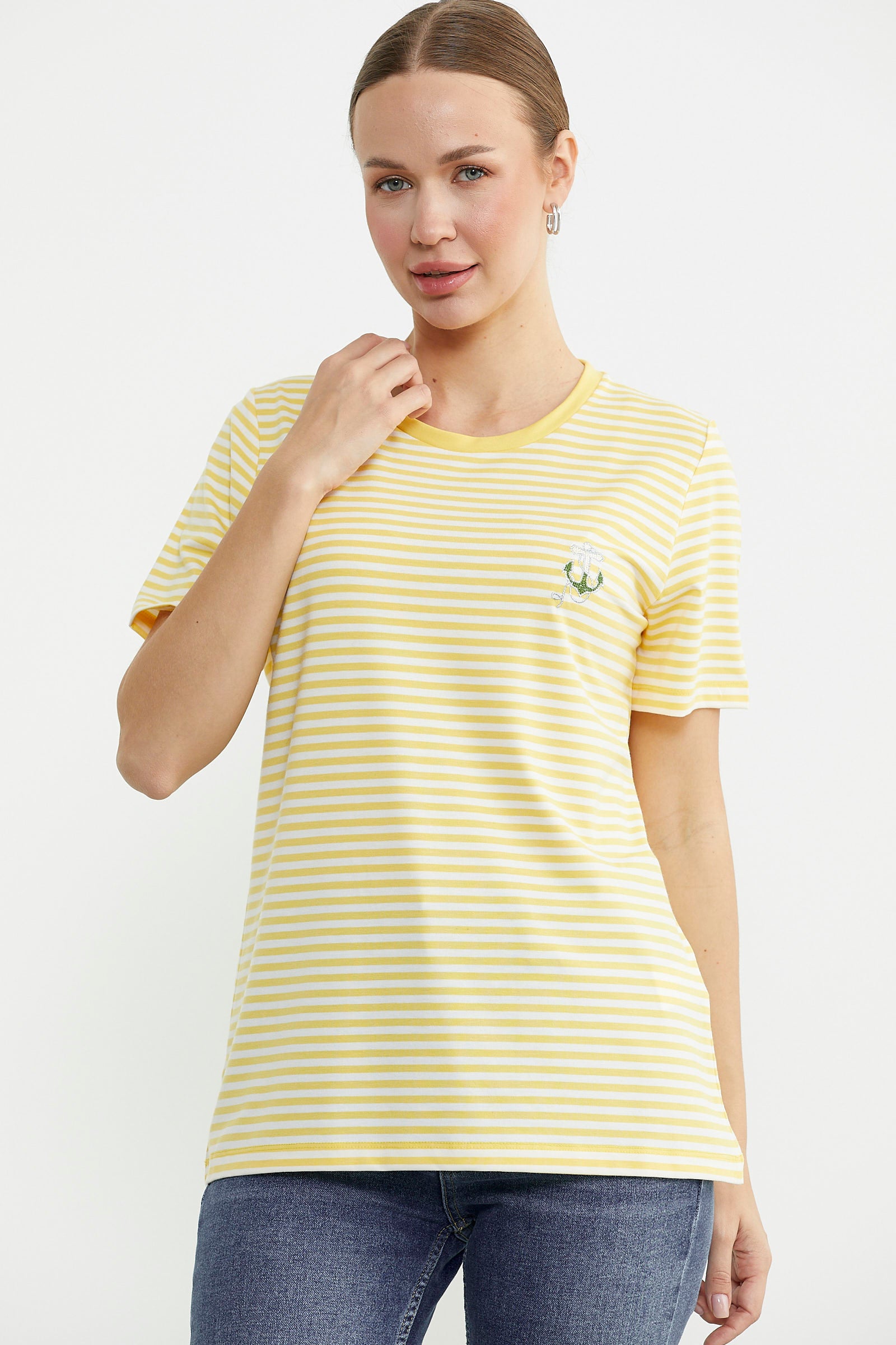 Çizgili Nakış Detaylı Penye Tişört - Sarı