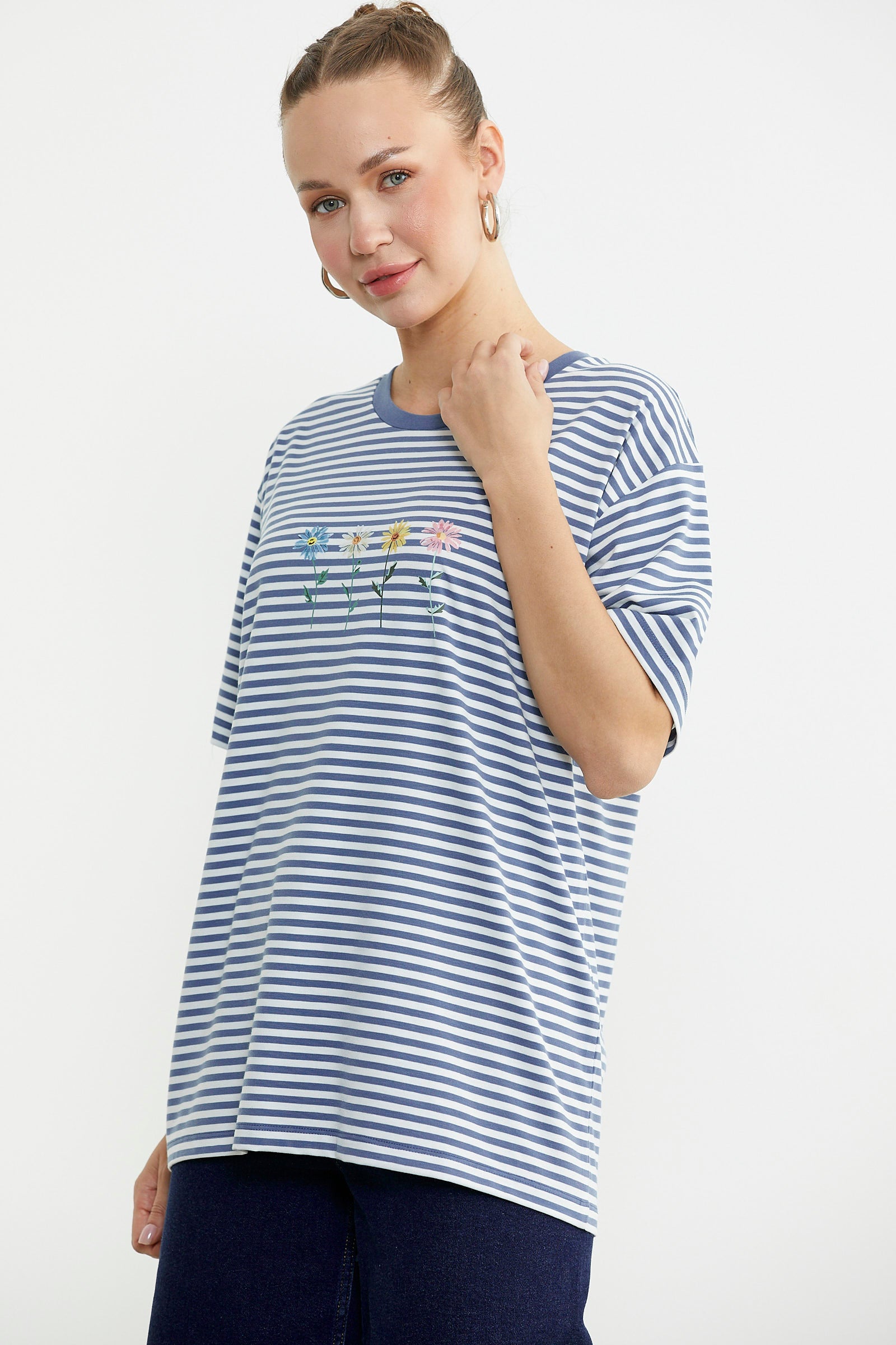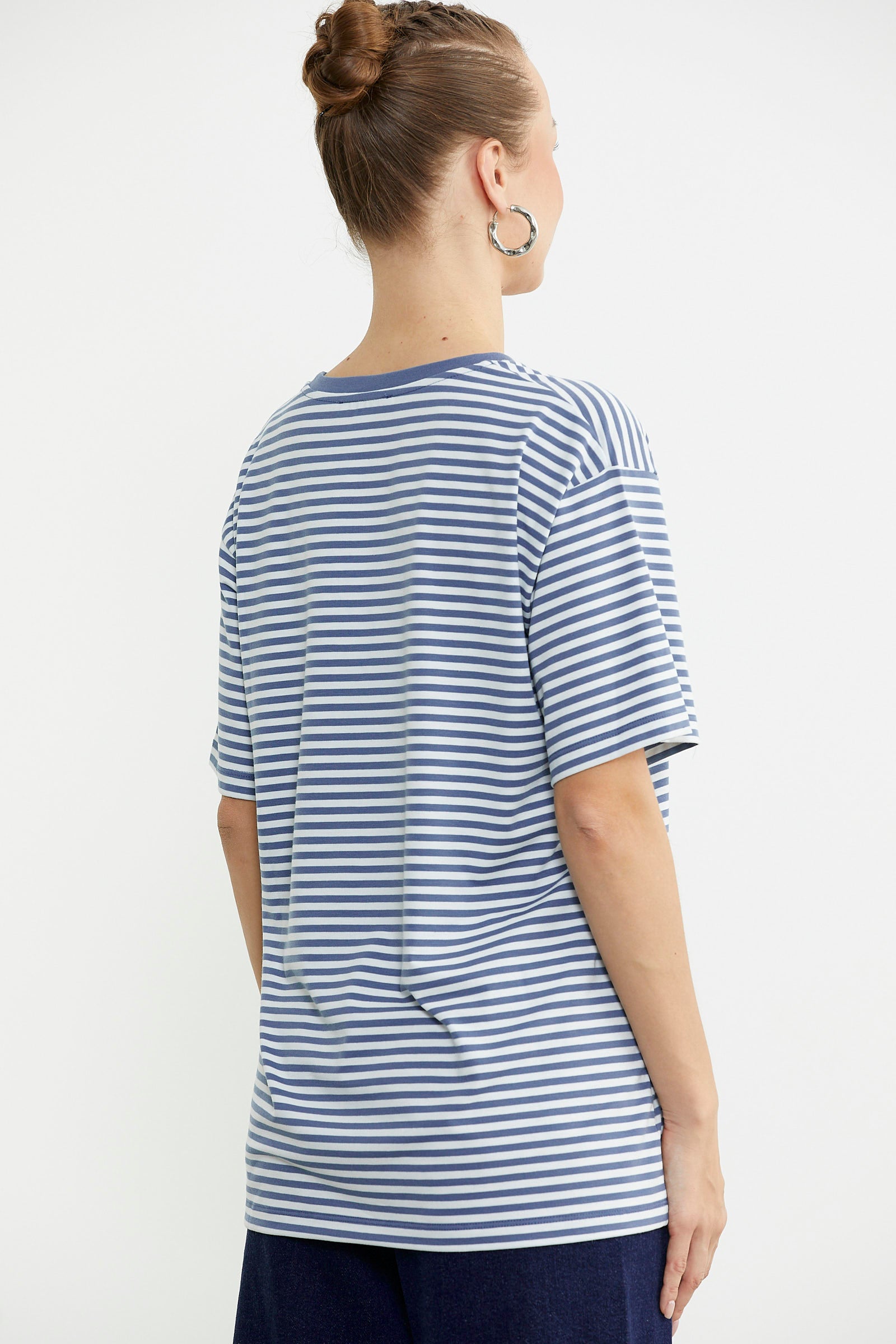 İlkbahar/ Yaz sezonunun ikonik marin trendini günlük stilinize taşımanızı sağlayacak tişört, dokusu sayesinde konforu da beraberinde getiriyor. Baskı detayıyla öne çıkıyor.