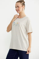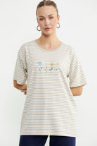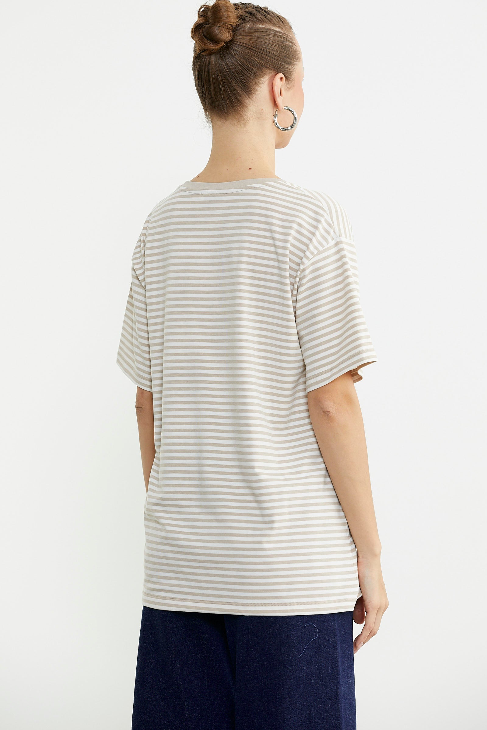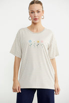 İlkbahar/ Yaz sezonunun ikonik marin trendini günlük stilinize taşımanızı sağlayacak tişört, dokusu sayesinde konforu da beraberinde getiriyor. Baskı detayıyla öne çıkıyor.