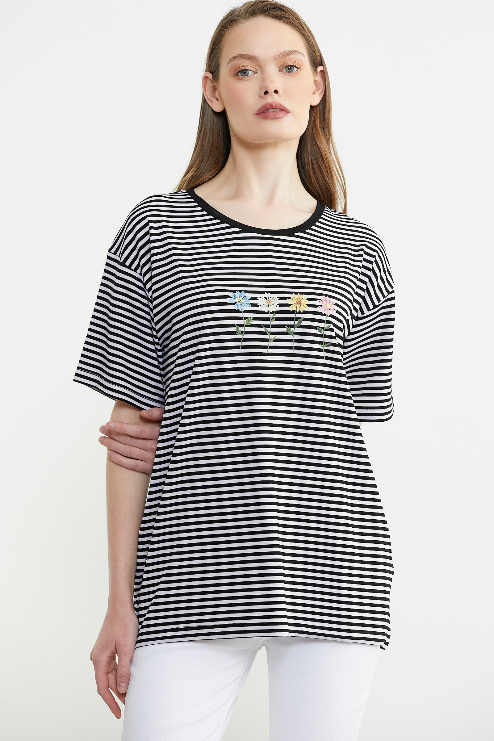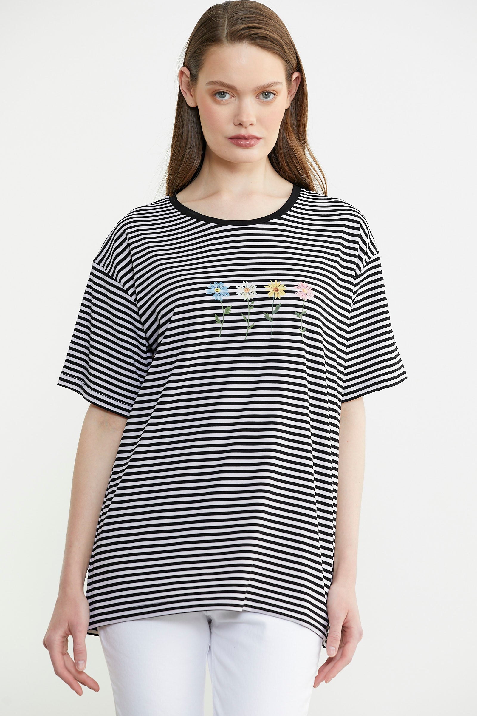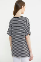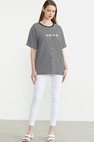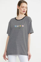 Çizgili Nakış Detaylı Tişört - Siyah