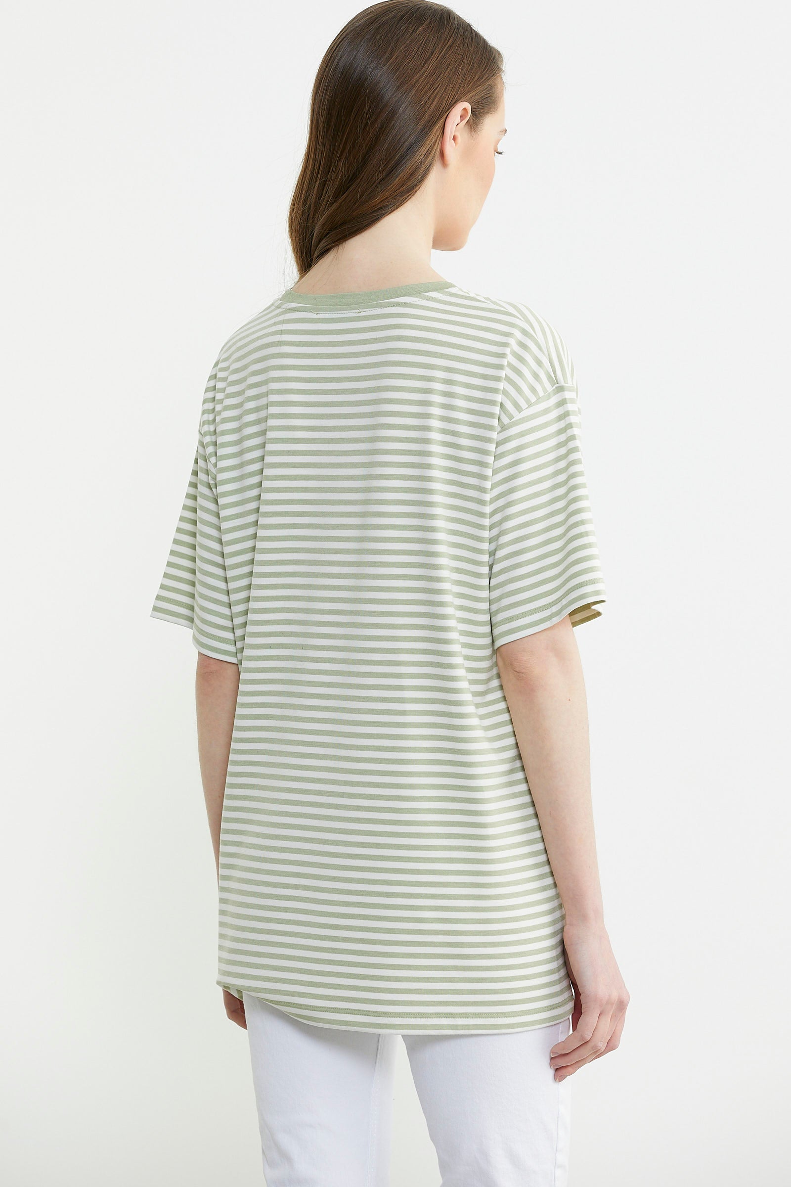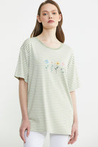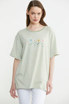 Çizgili Nakış Detaylı Tişört - Yeşil
