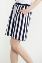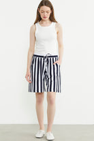Beli lastikli bermuda pamuk şort, çizgili kumaştan üretilmiştir. Cepli ve rahat kalıptır.