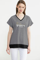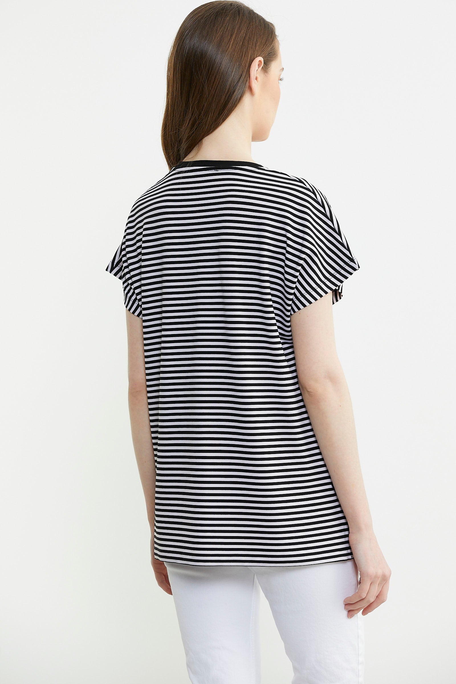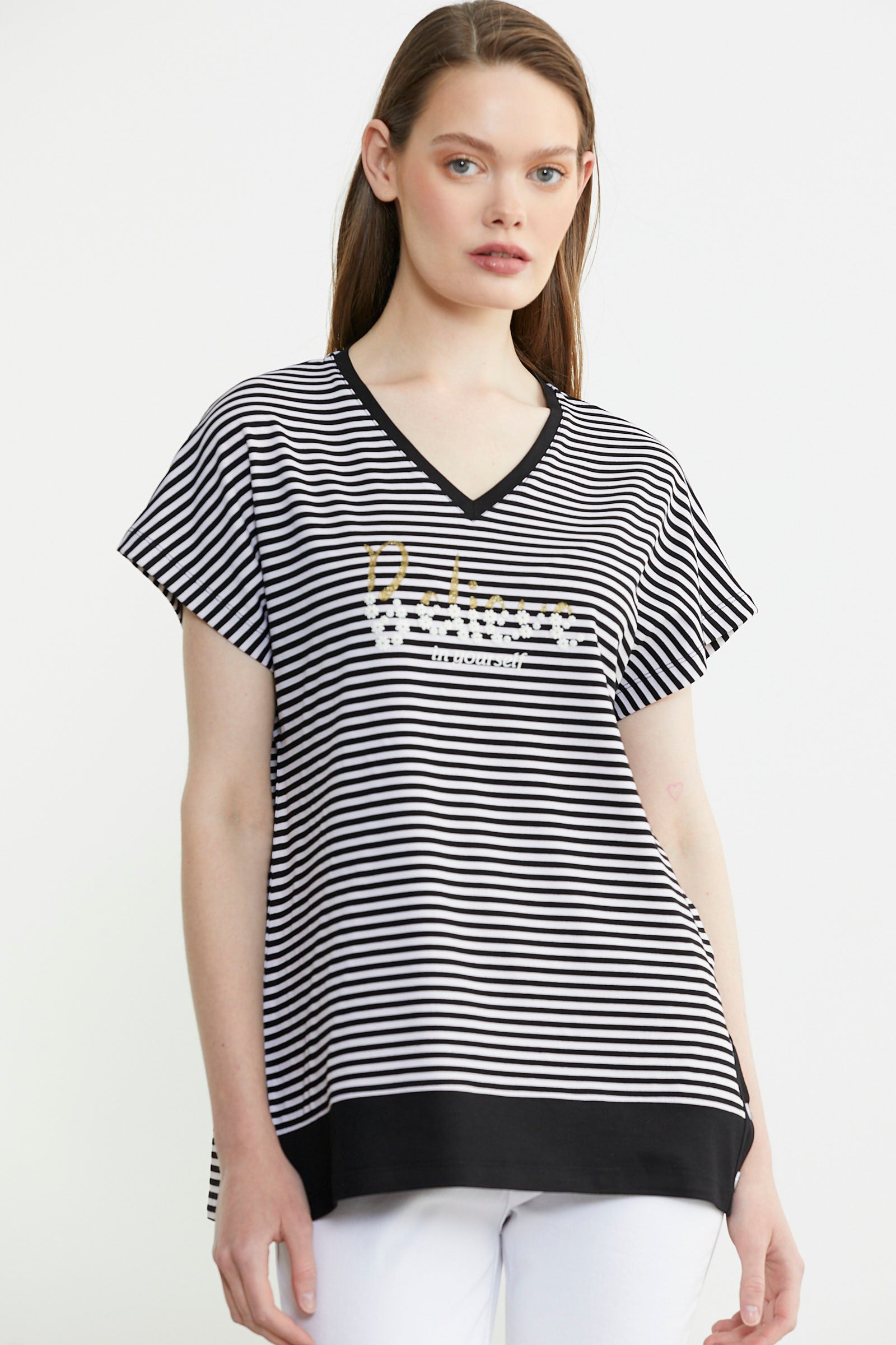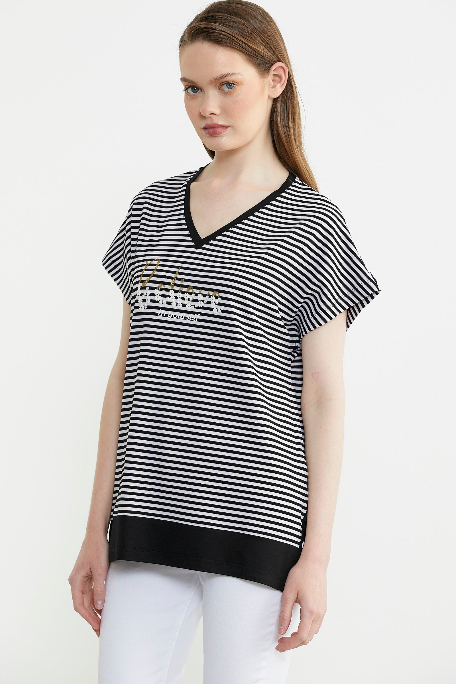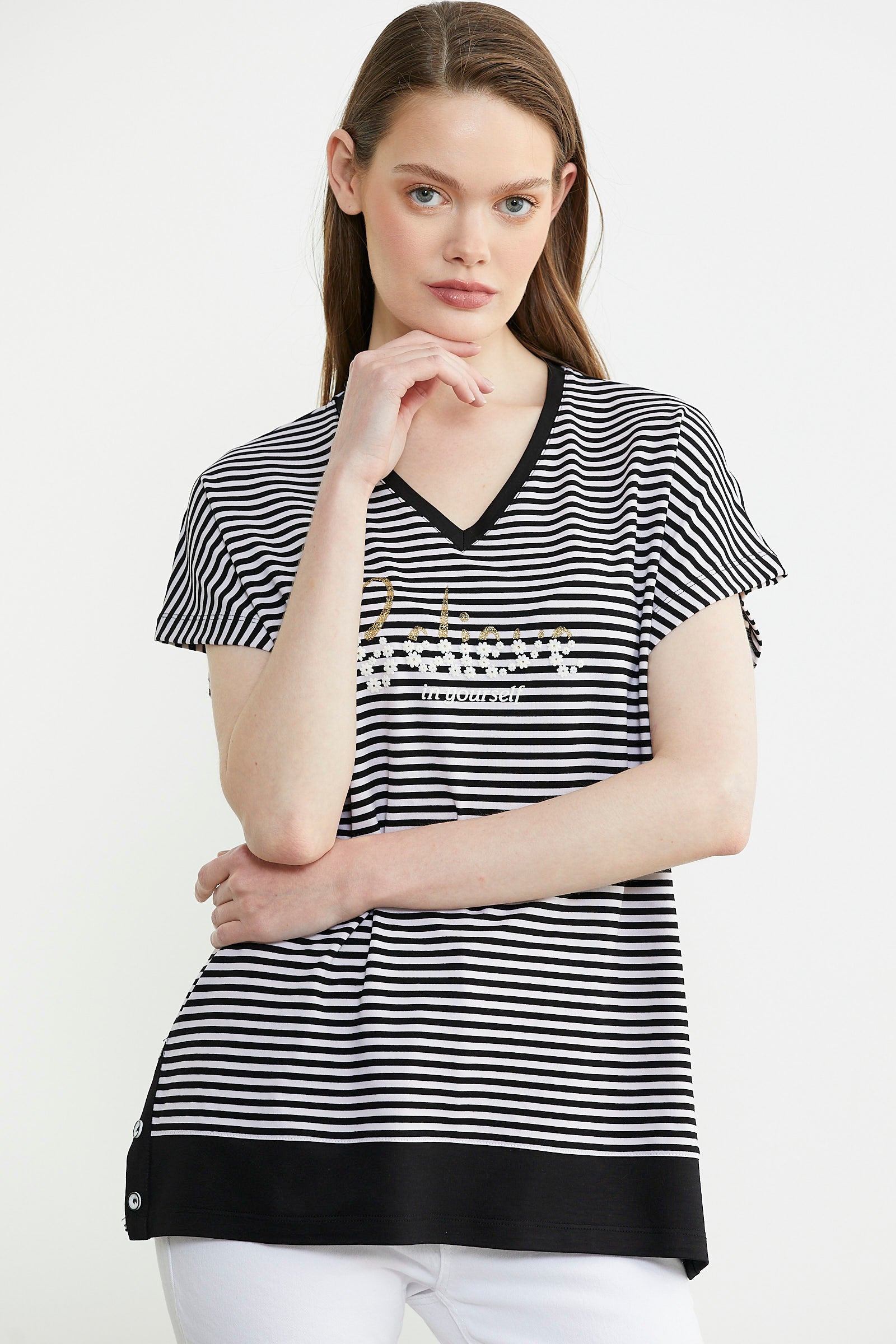 Konforlu yapısını kesimine borçlu olan V yaka tişörtün etek ucunda yırtmaç ve düğme detayı bulunmaktadır. Çizgili ve payet nakışlıdır.