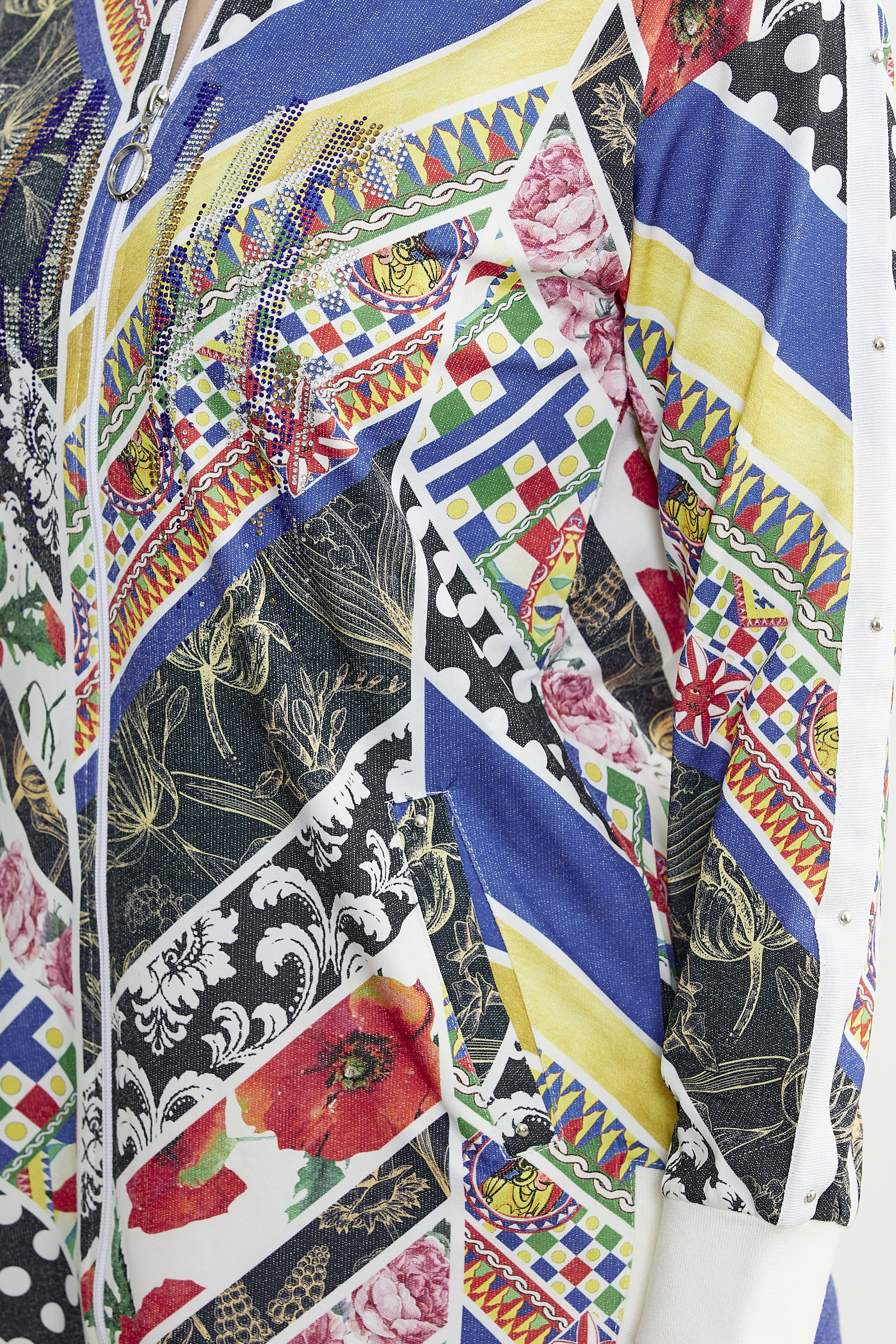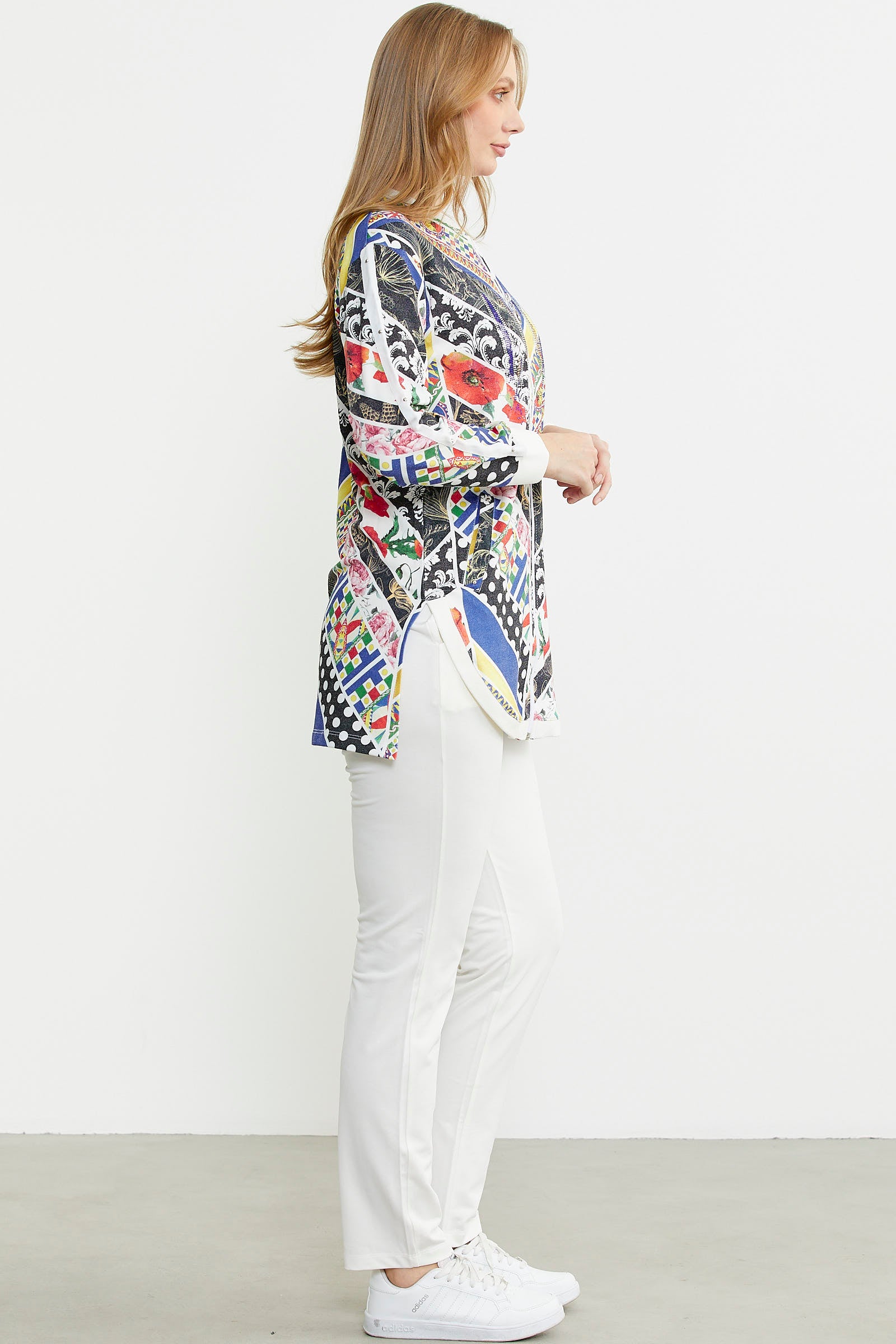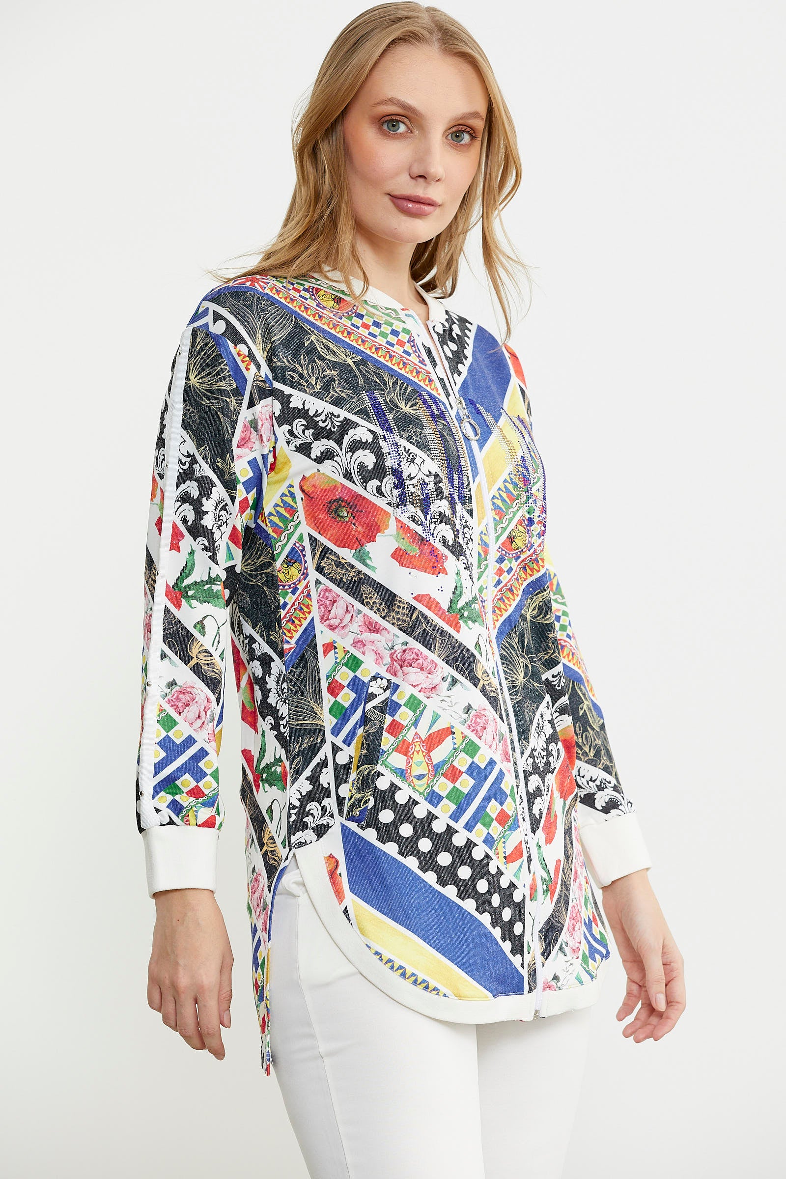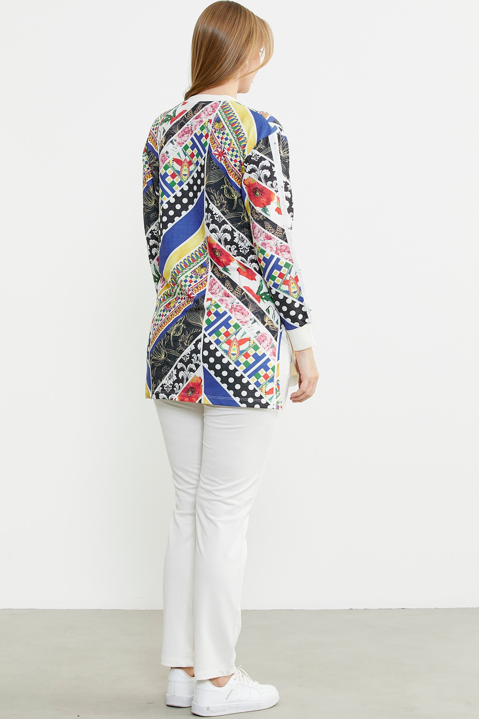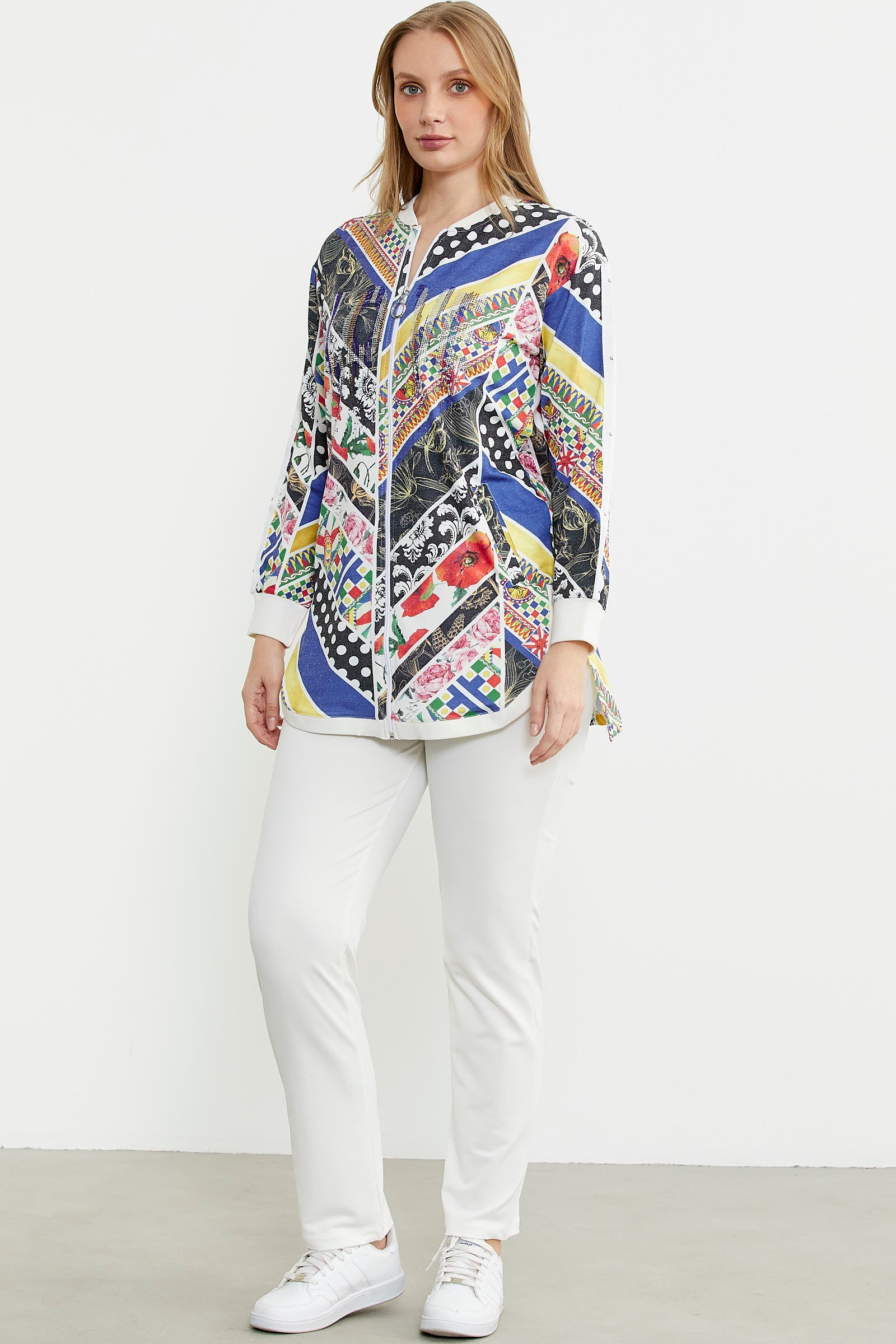 Renkli ve desenli tunik üste, düz renk pantolon eşlik ediyor. Taş detayıyla hareketlenen şık takım, her zaman dikkat çekici görünüm sunar.