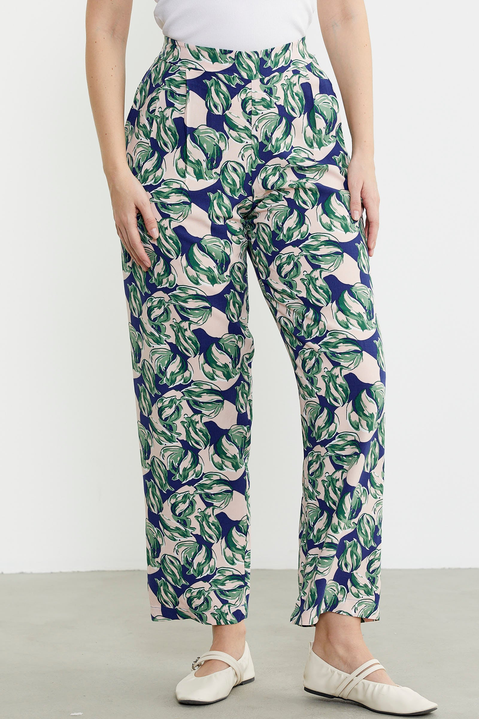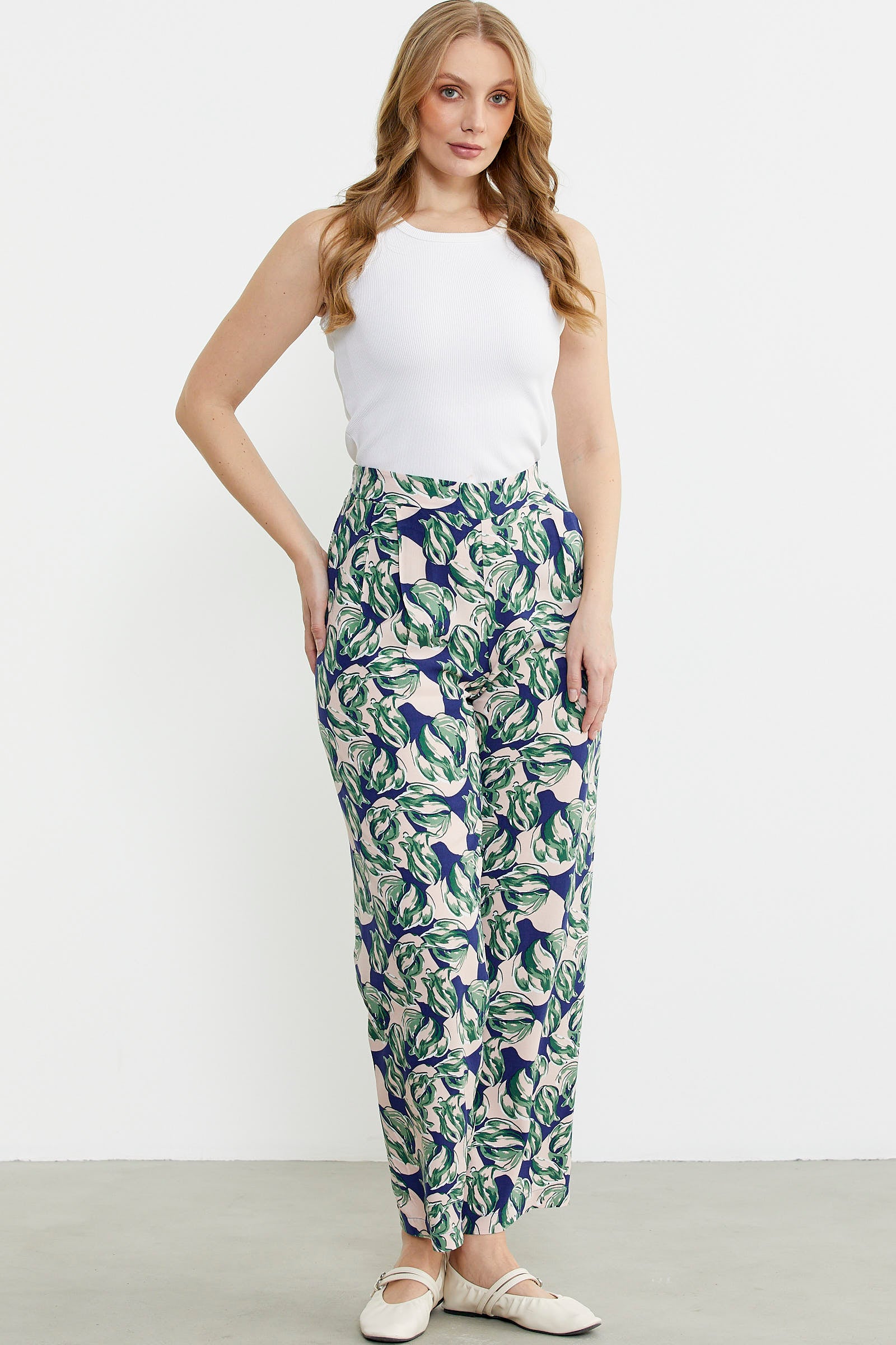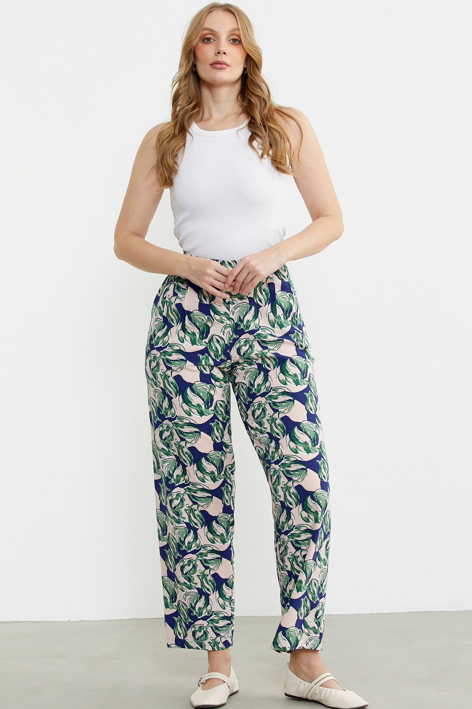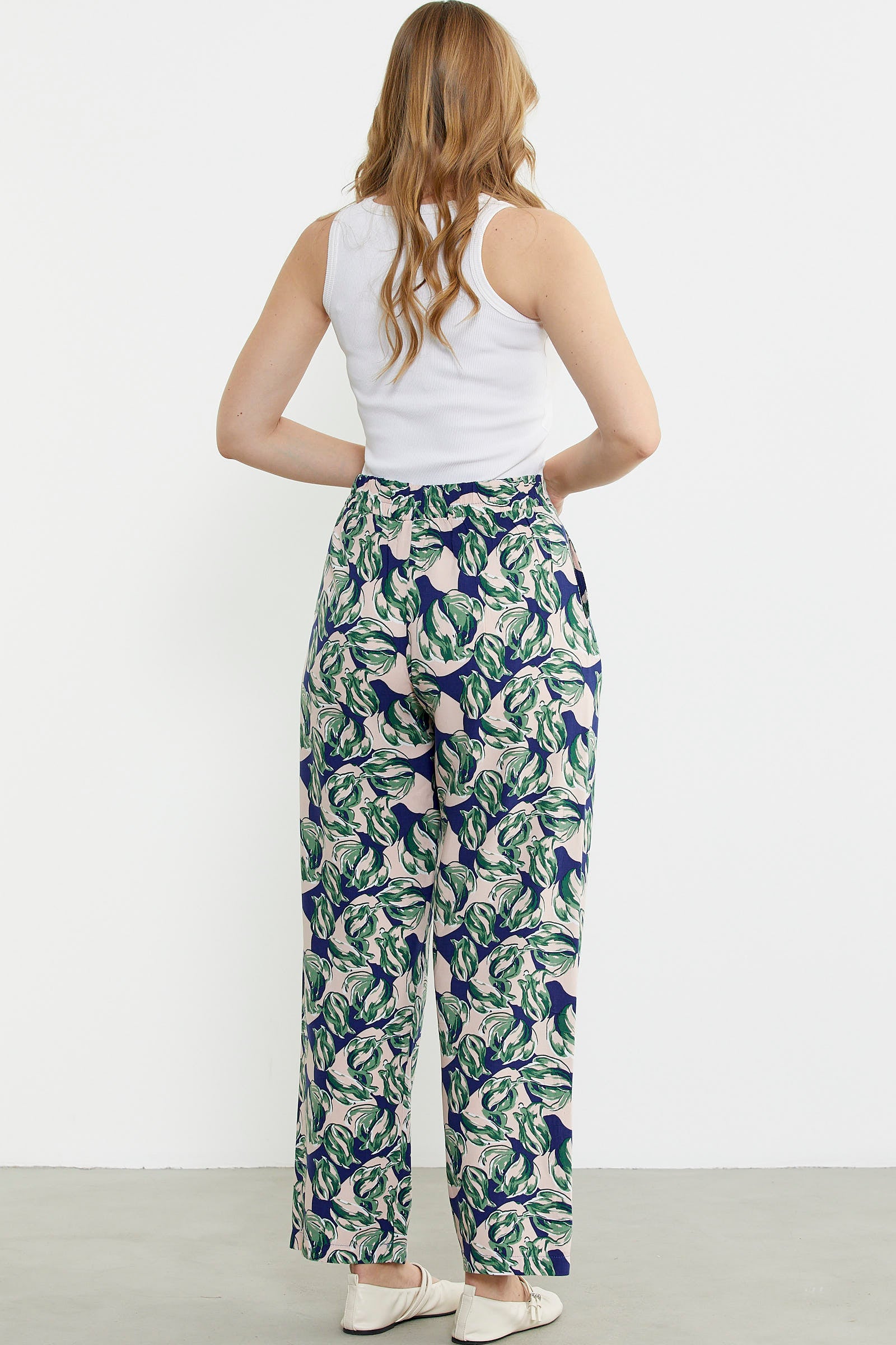 Viskon dokuma kumaştan üretilmiş palazzo pantolon. Bel arkası lastikli ve ceplidir. Geniş kalıptır.