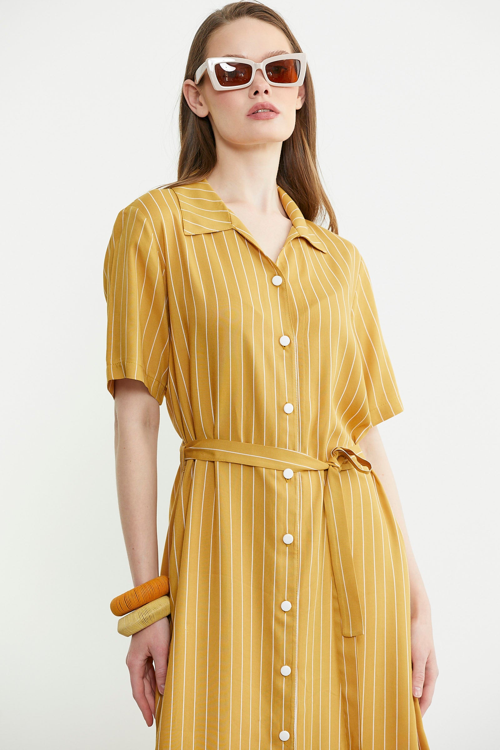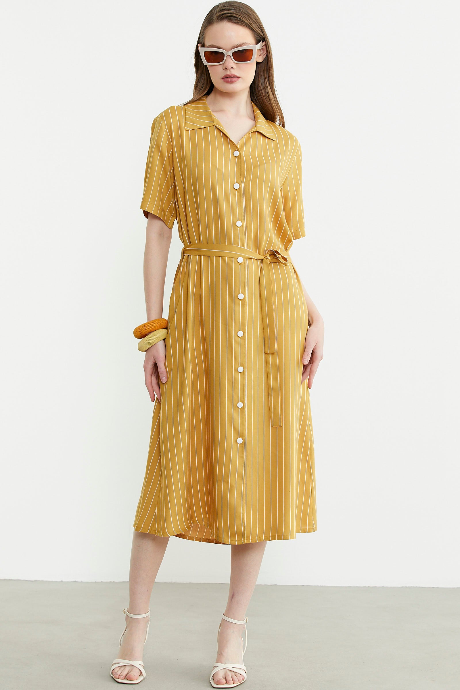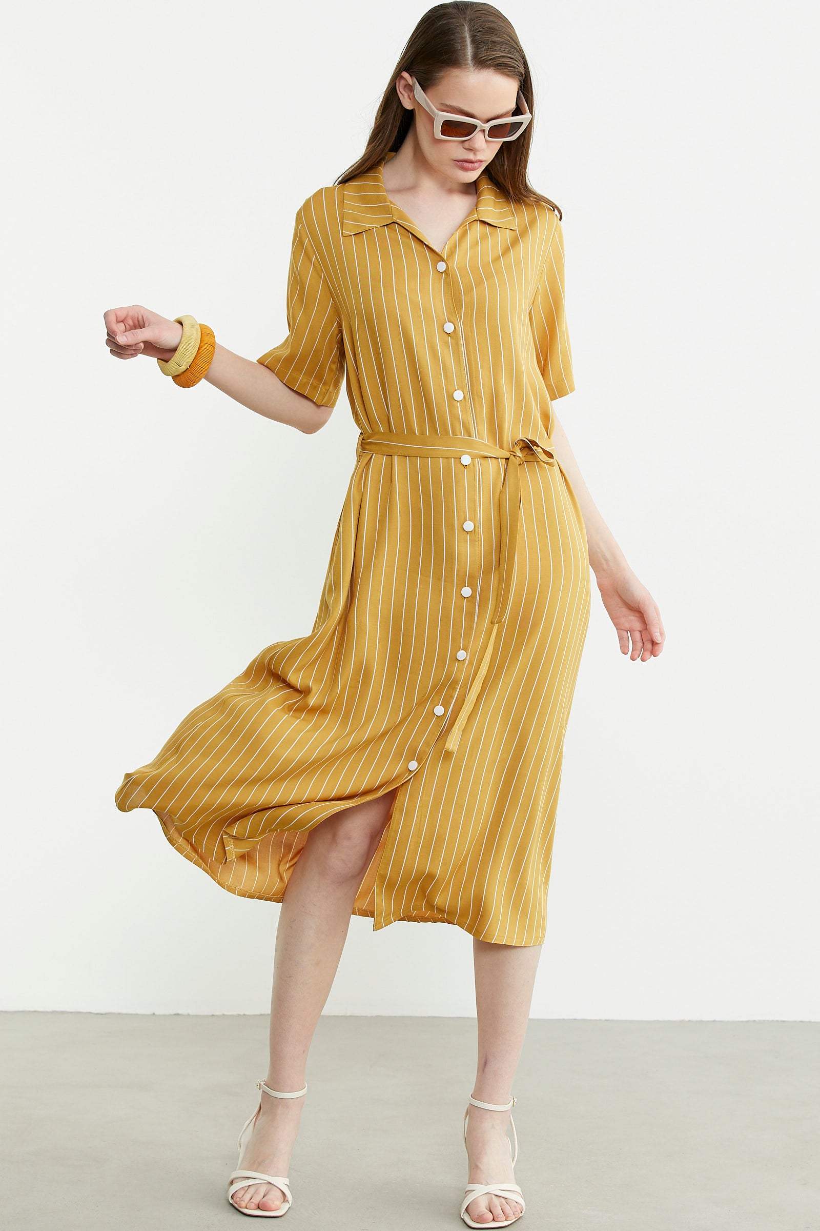 Düğmeli Midi Boy Gömlek Elbise - Hardal