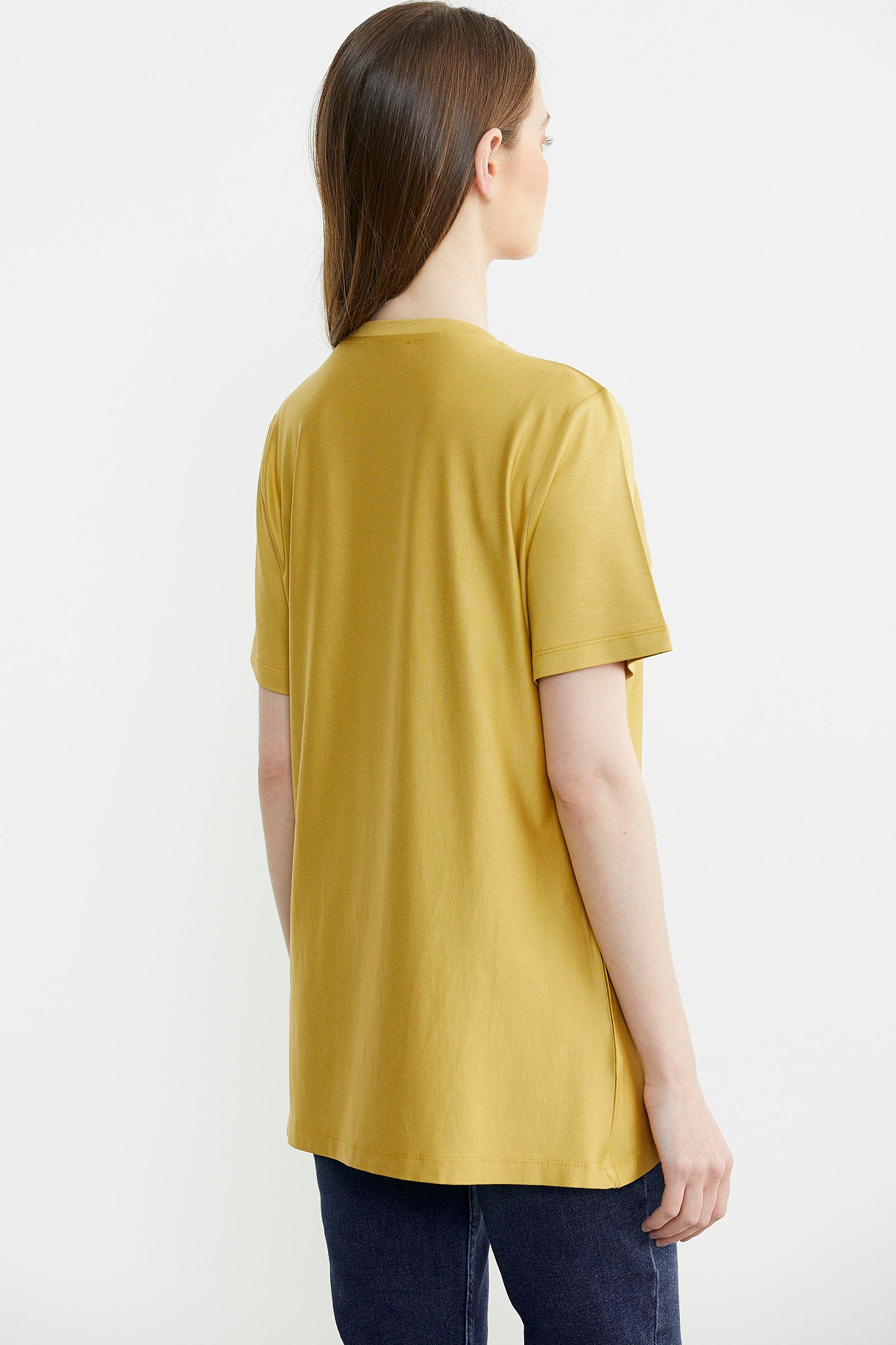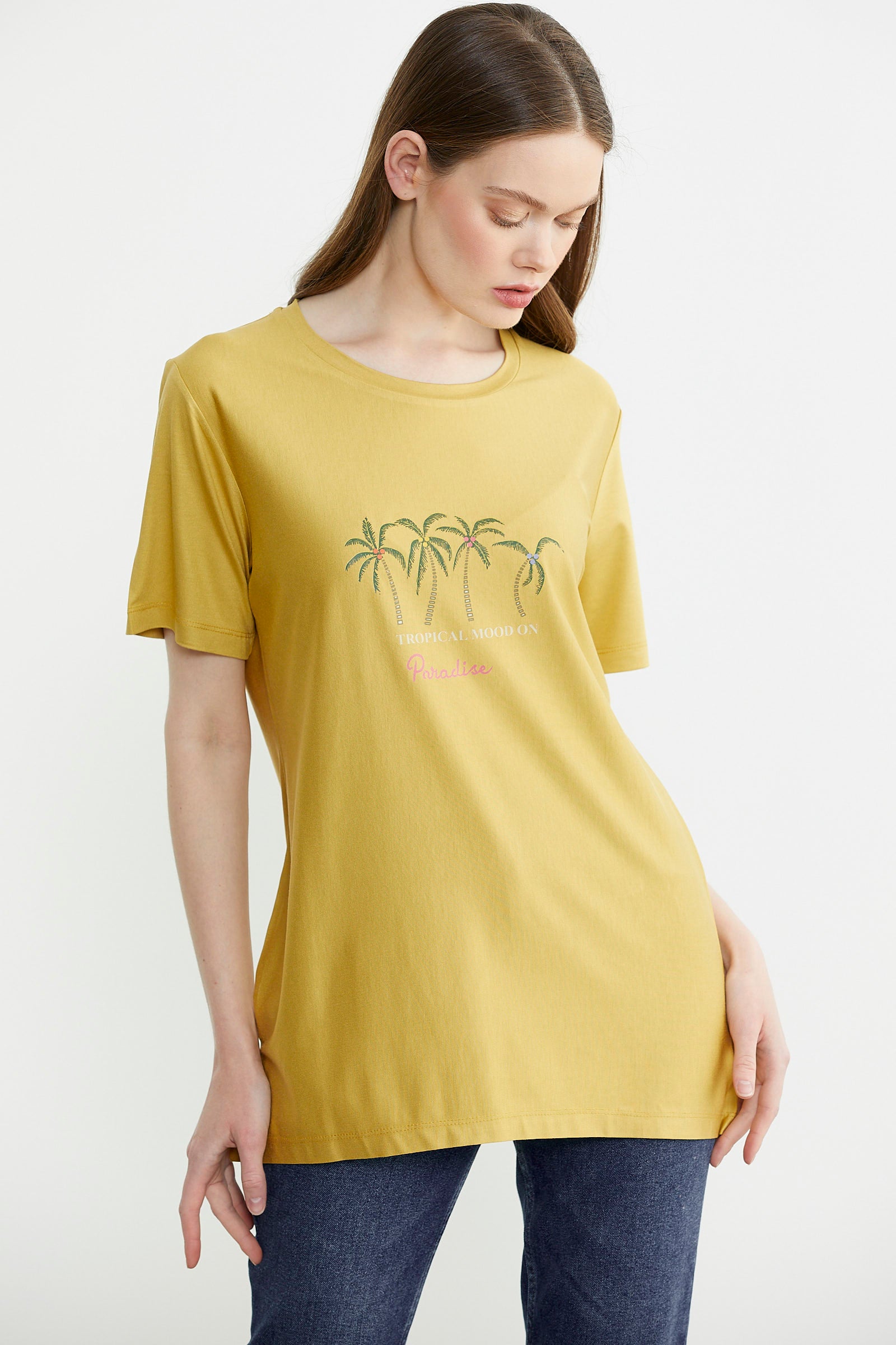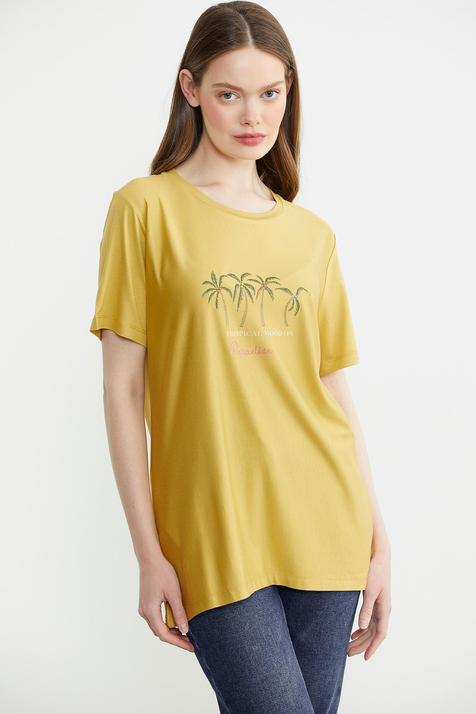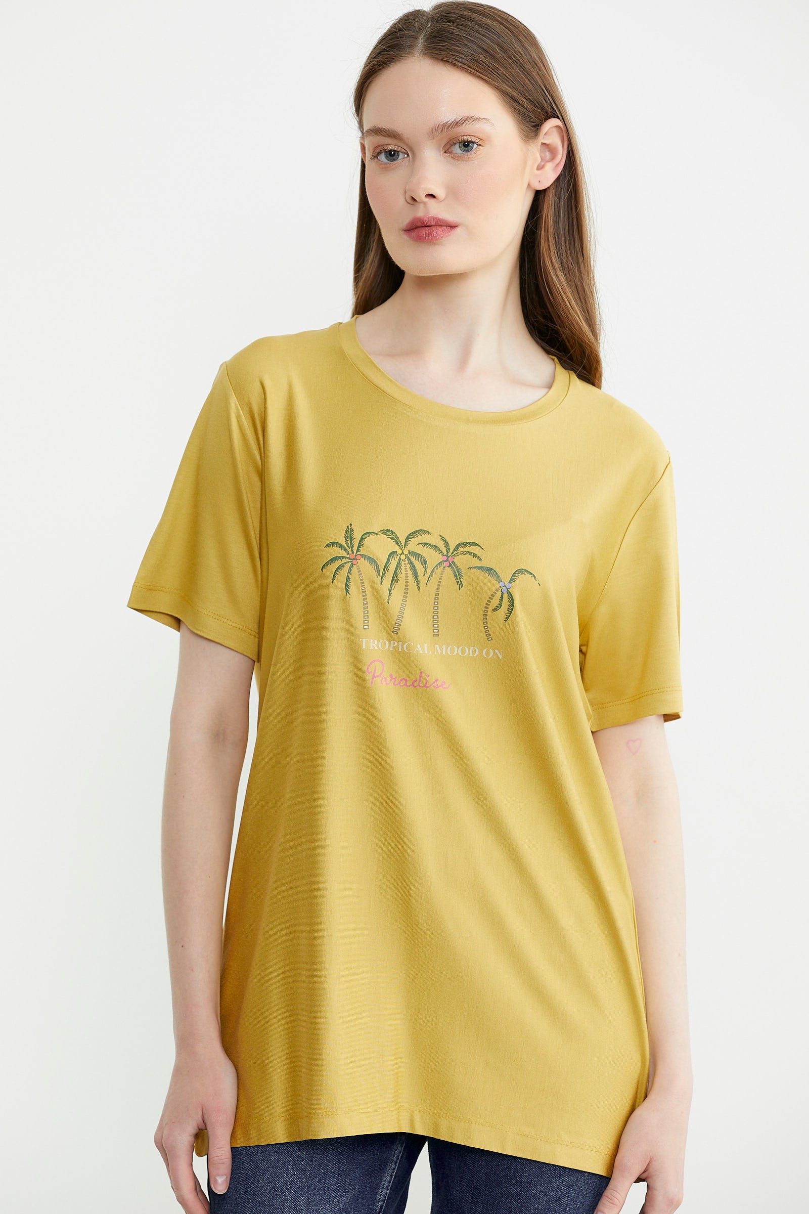 Egzotik Baskılı Rahat Kalıp Tişört - Hardal