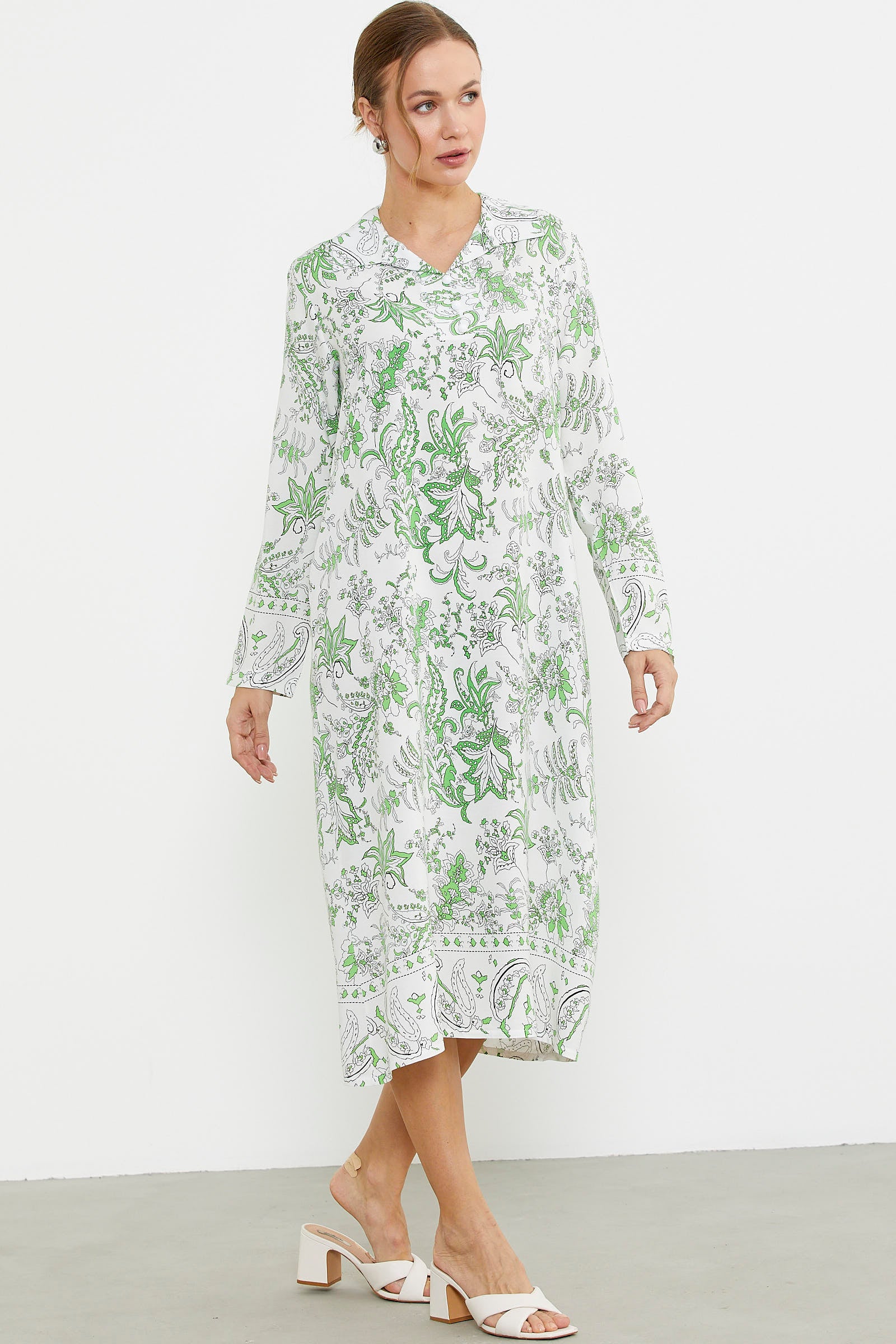 Gömlek Yaka Desenli Uzun Kol Elbise - Yeşil