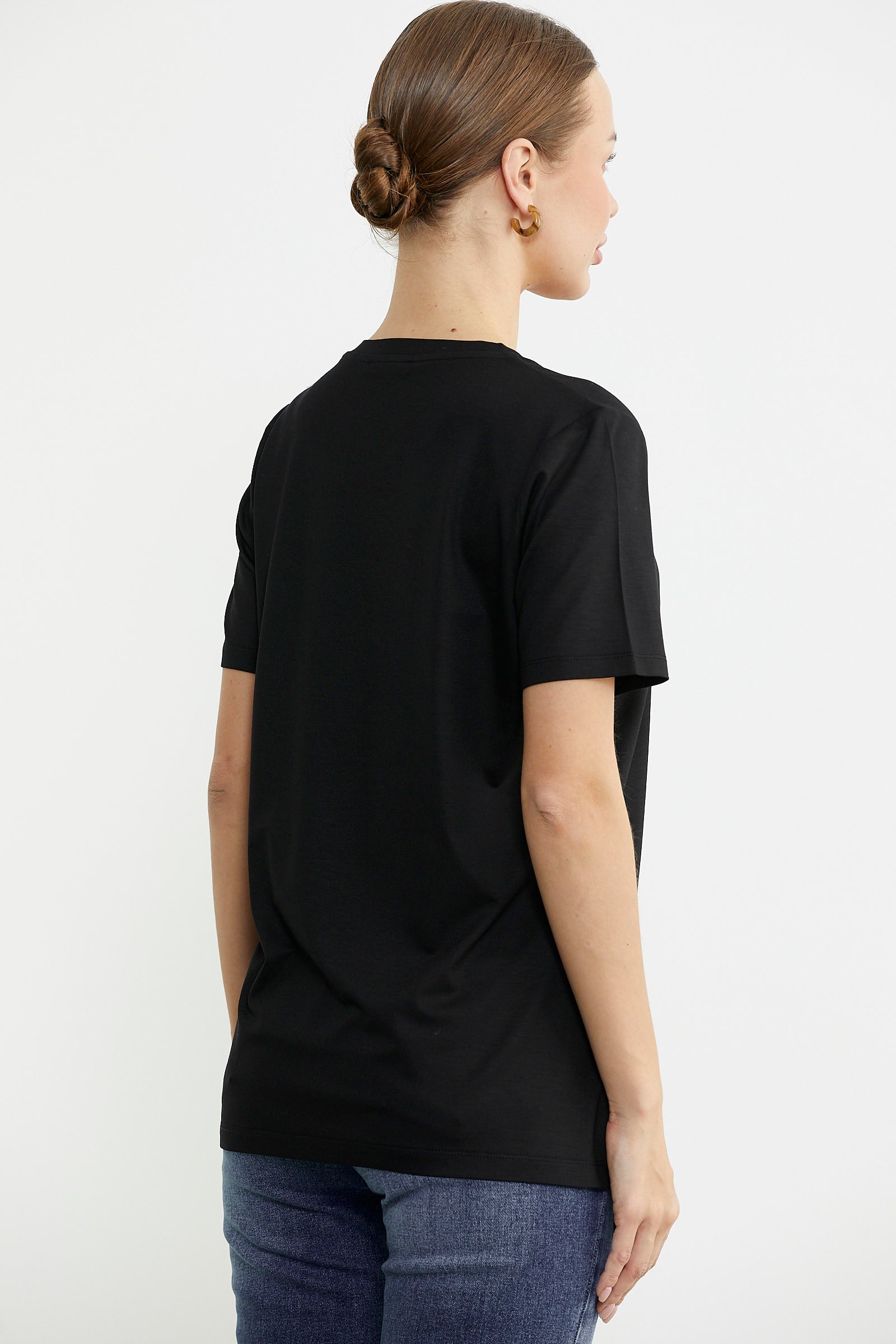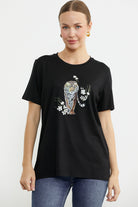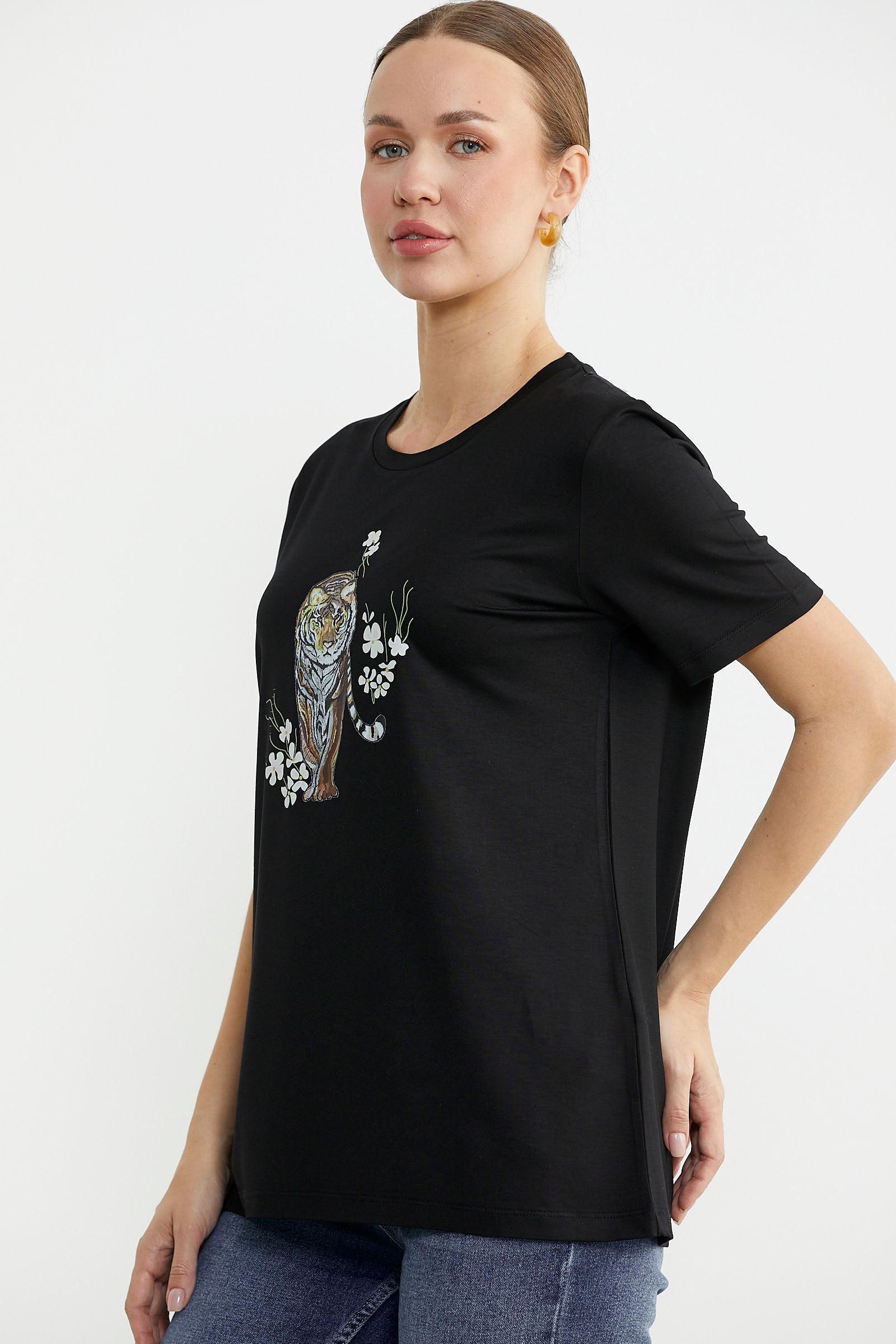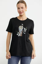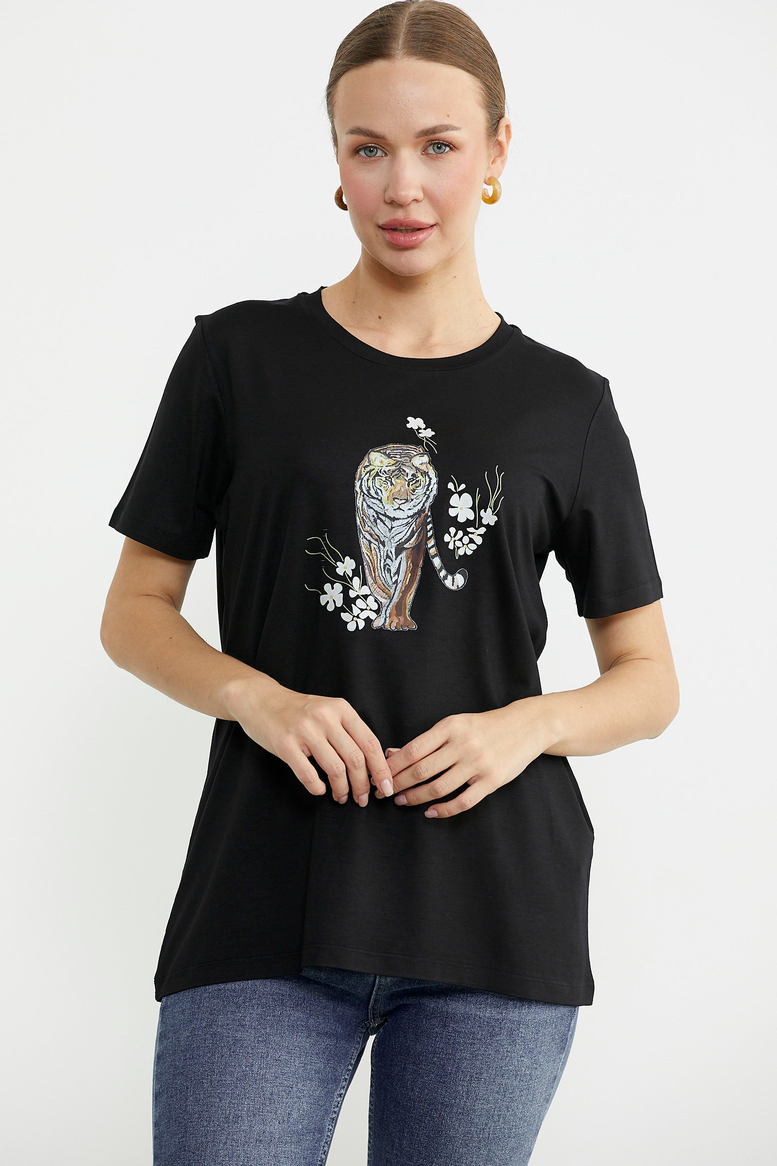 Hayvan Figür Baskılı Dökümlü Tişört - Siyah