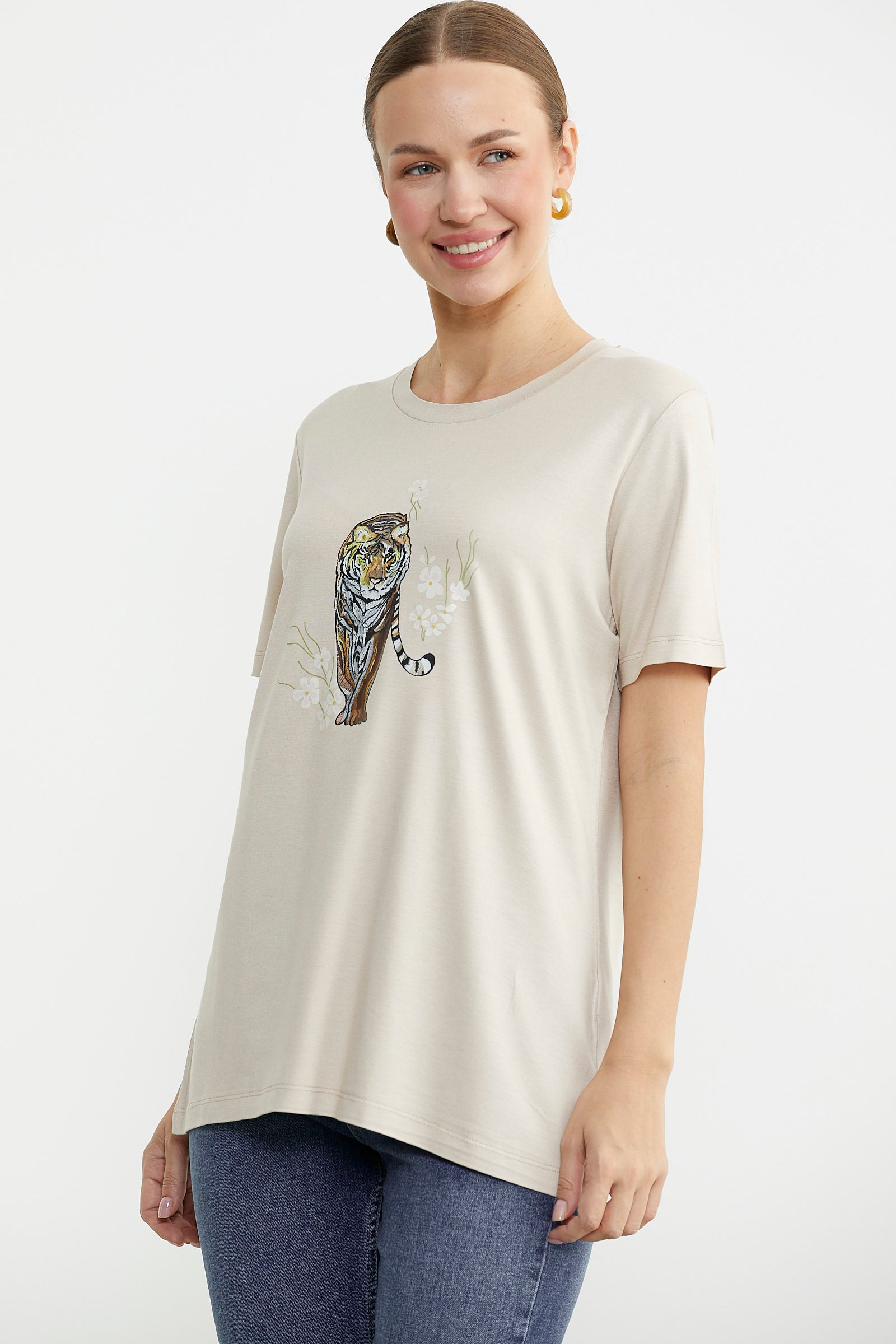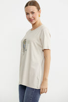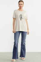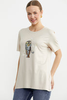 Hayvan Figür Baskılı Dökümlü Tişört - Taş