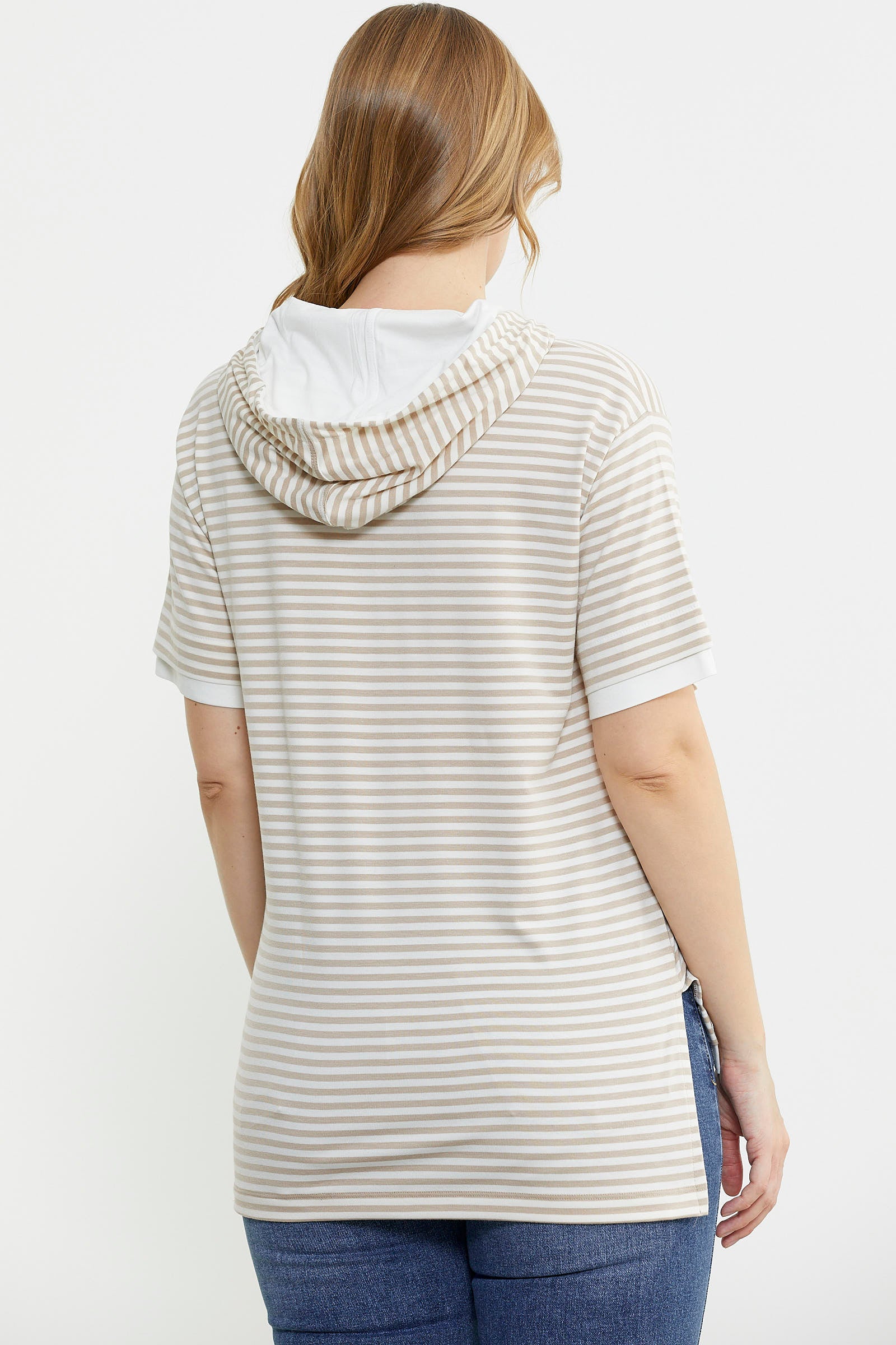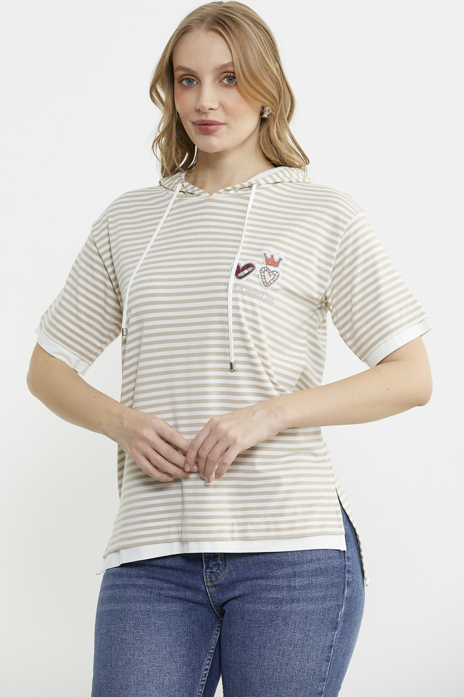 Kapüşonlu Renk Kombinli Çizgili Tişört - Kahve