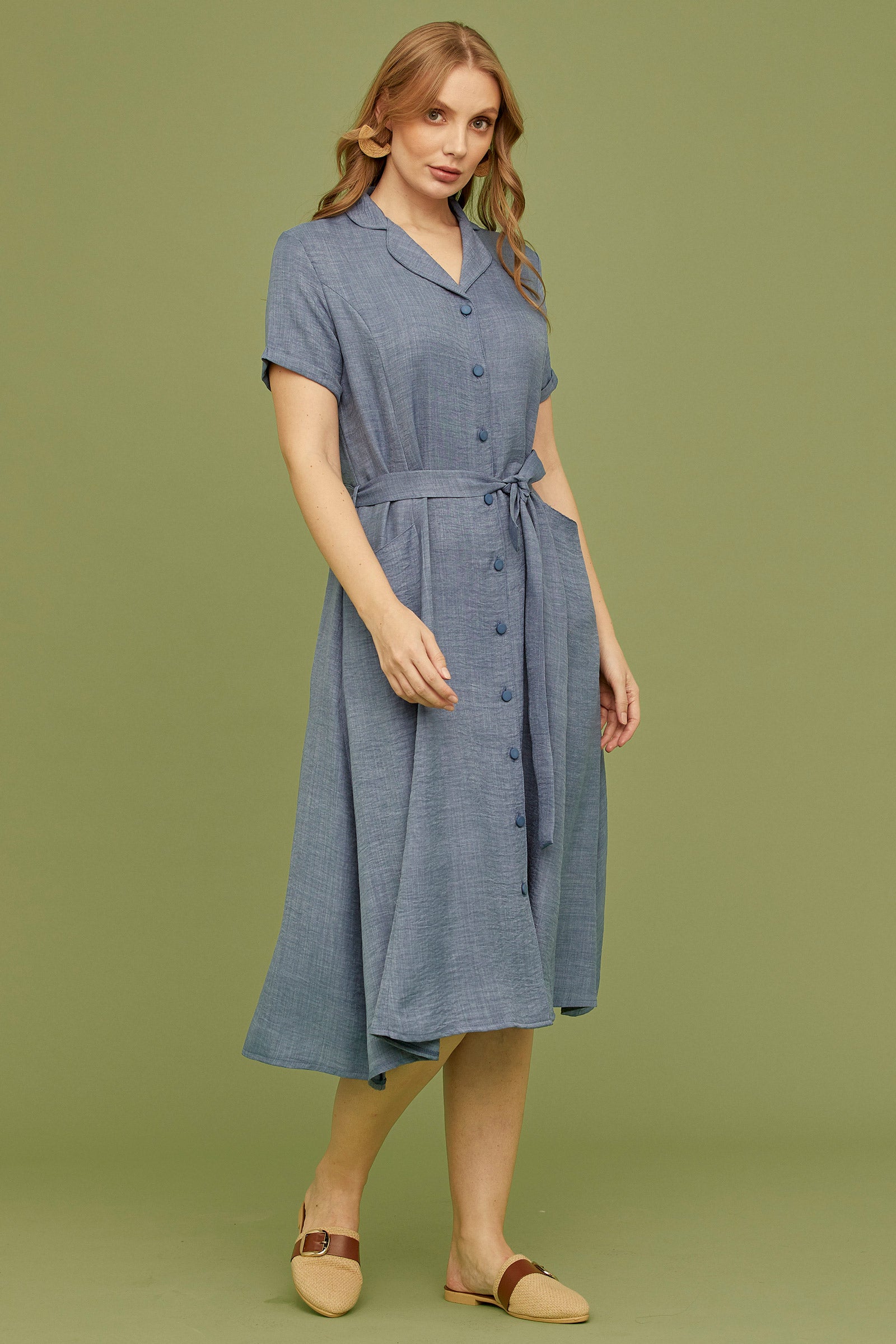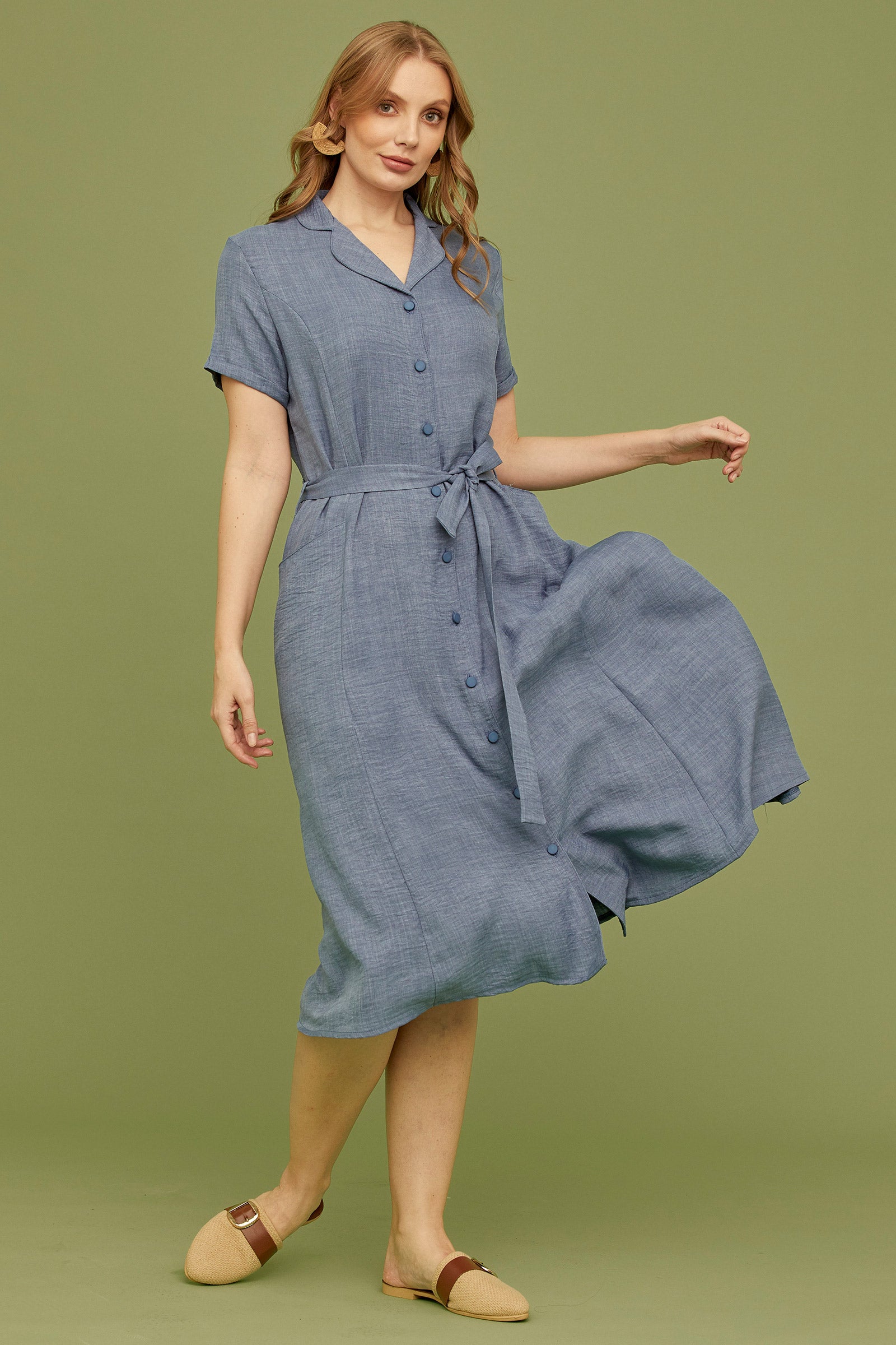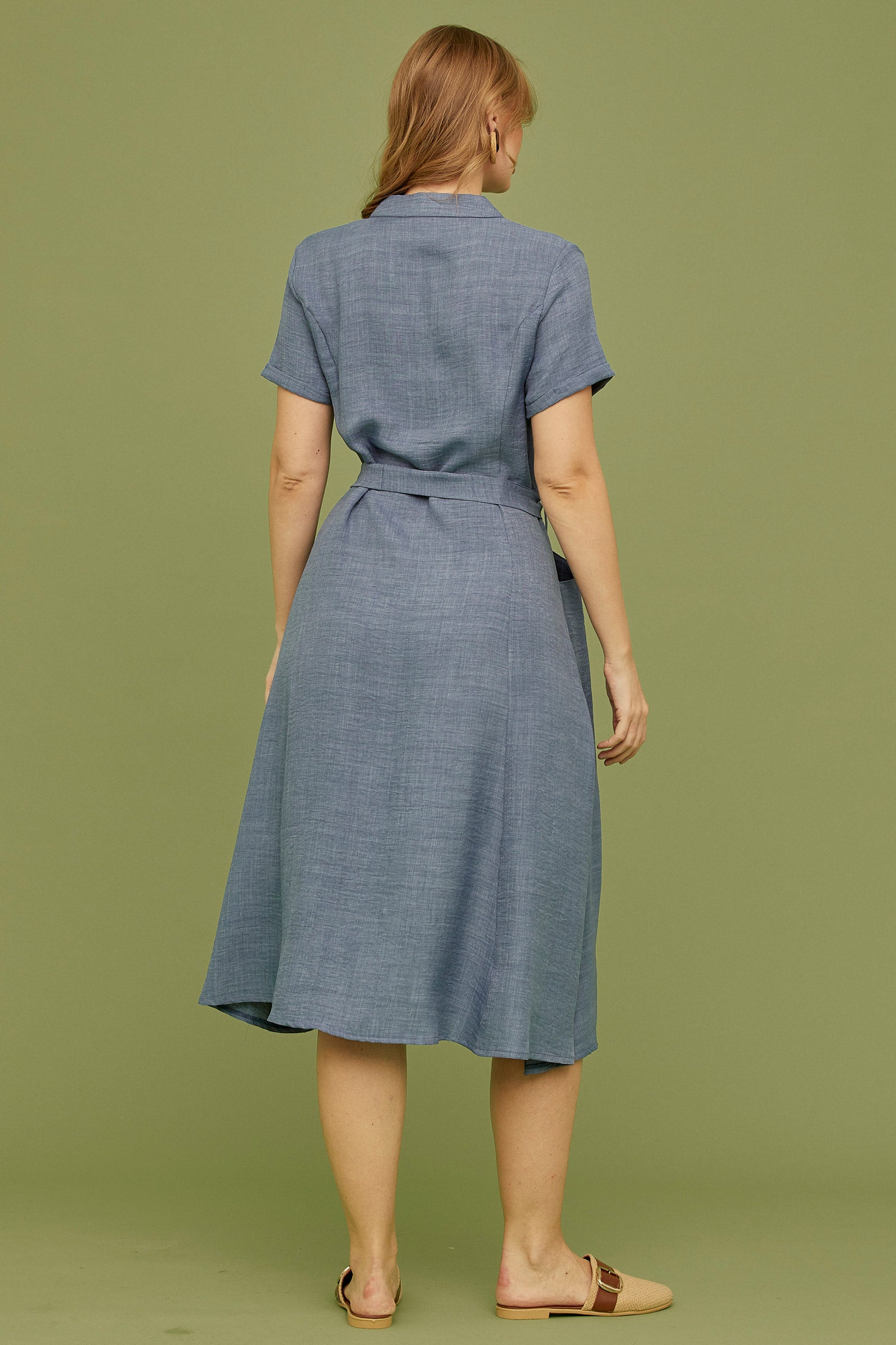 Keten Görünümlü Cepli Gömlek Elbise - Indigo
