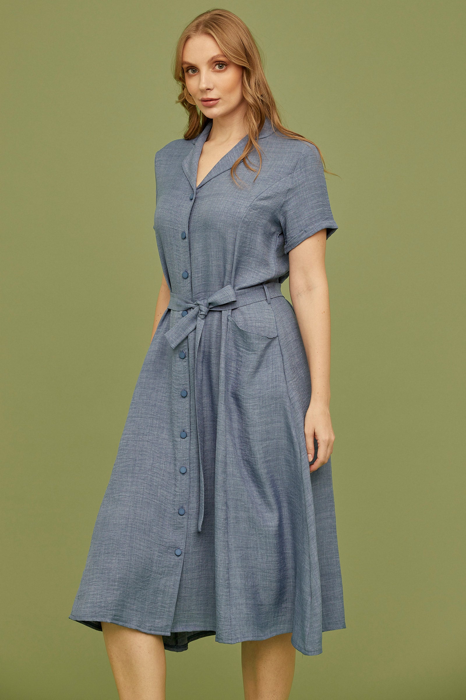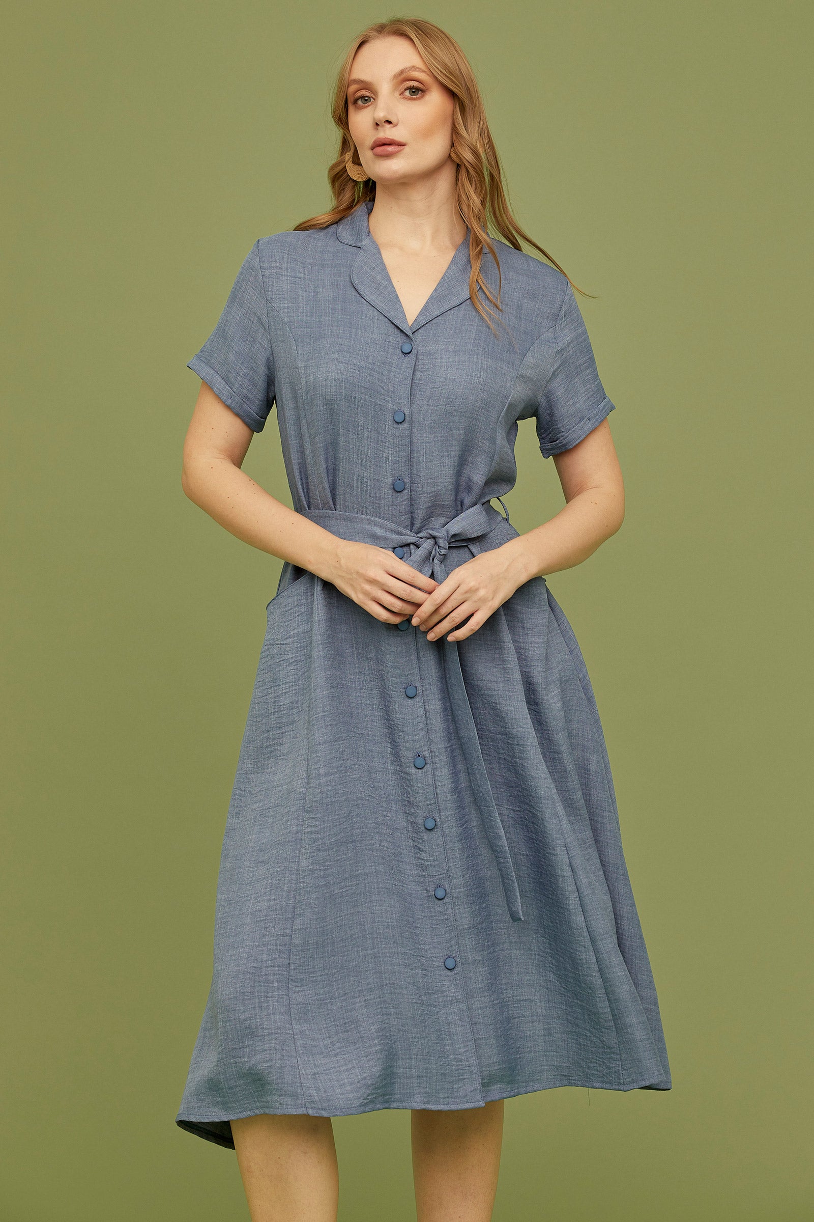 Çıkarılabilir kuşaklı gömlek model elbise midi boydur. Viskoz dokuma kumaştan üretilmiştir. Rahat kalıp, düğme kapamalıdır.