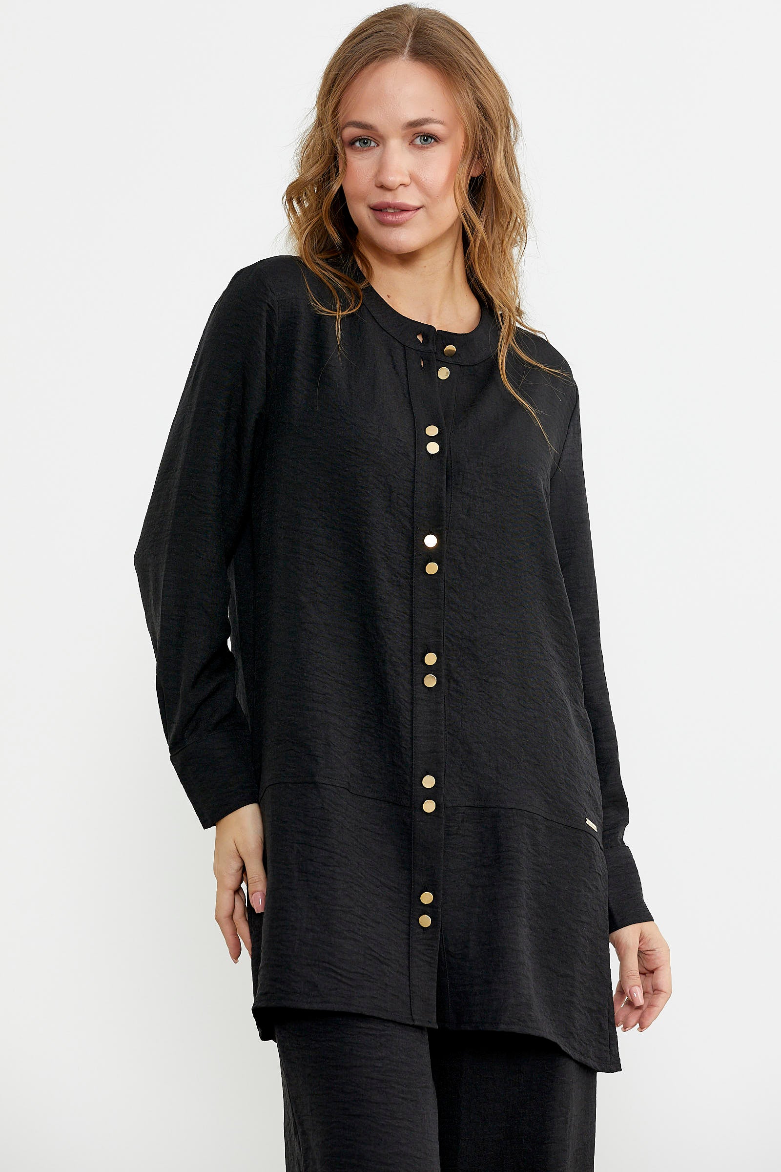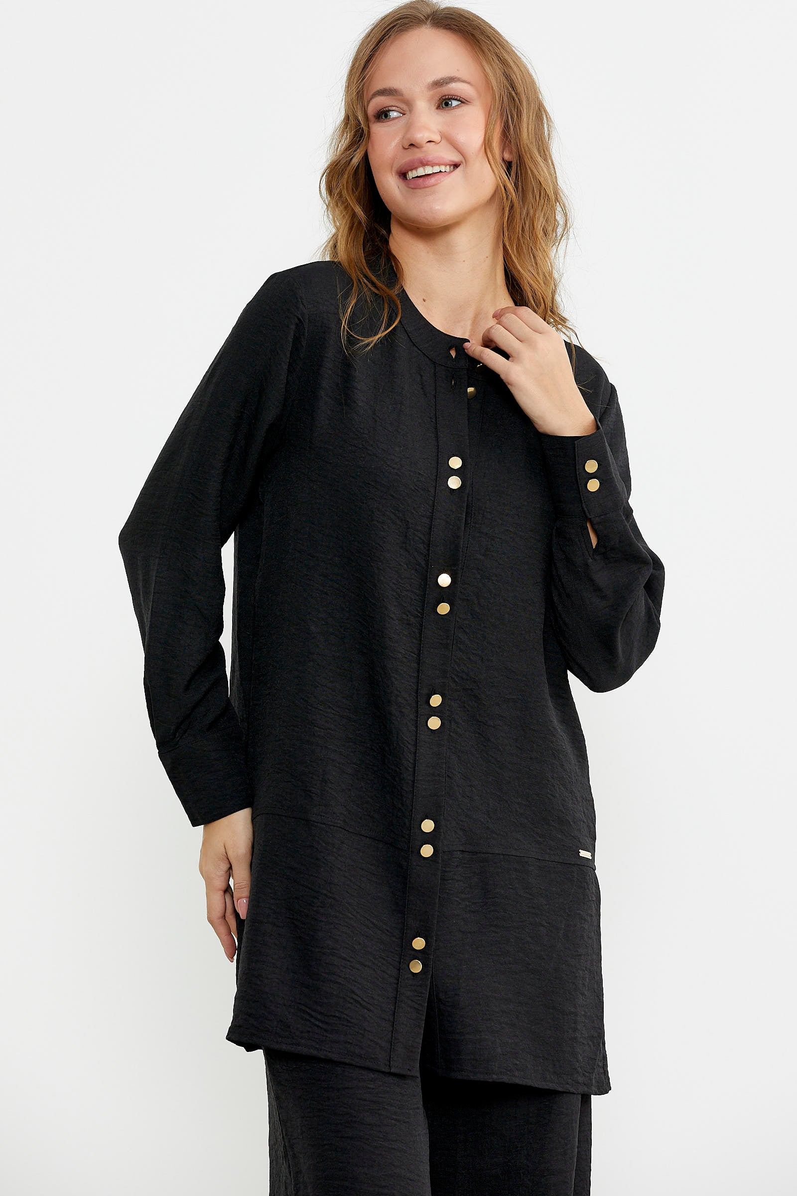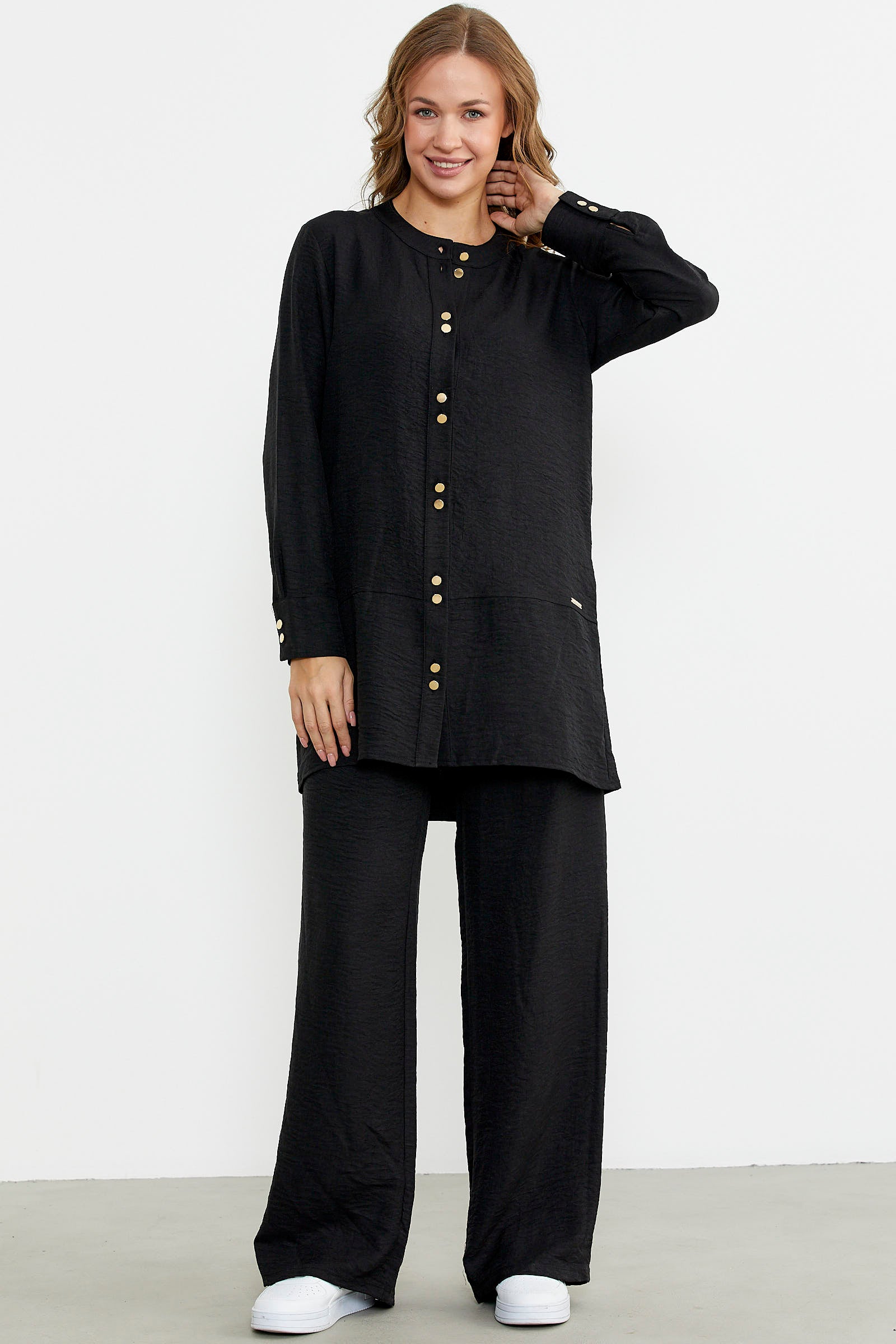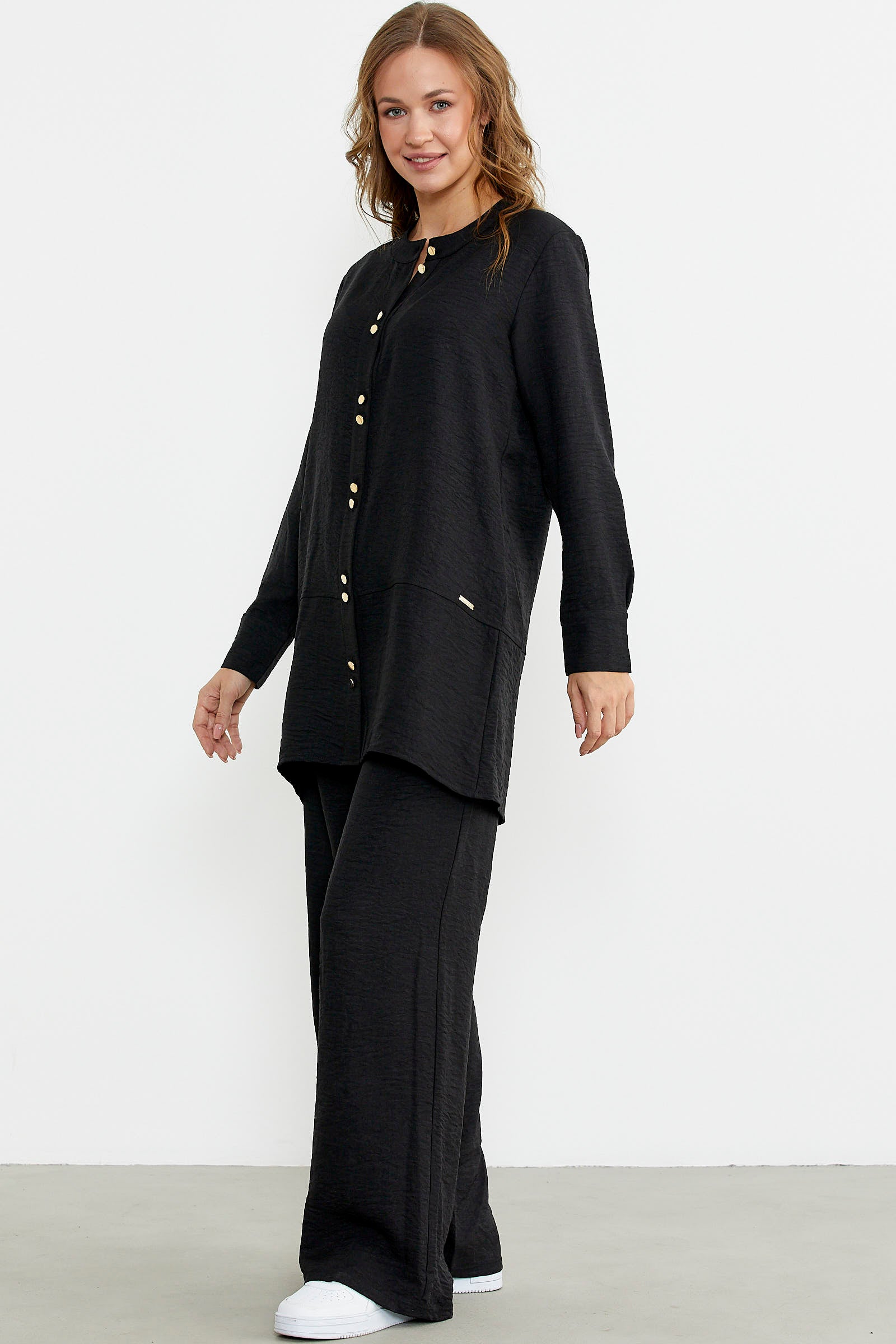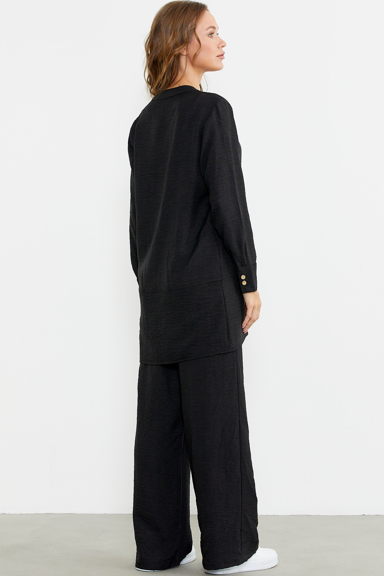 Düğme kapamalı tunik üst ve bol paça pantolon içeren takım. Keten görünümlü viskon kumaştan üretilmiştir. Rahat kalıptır.