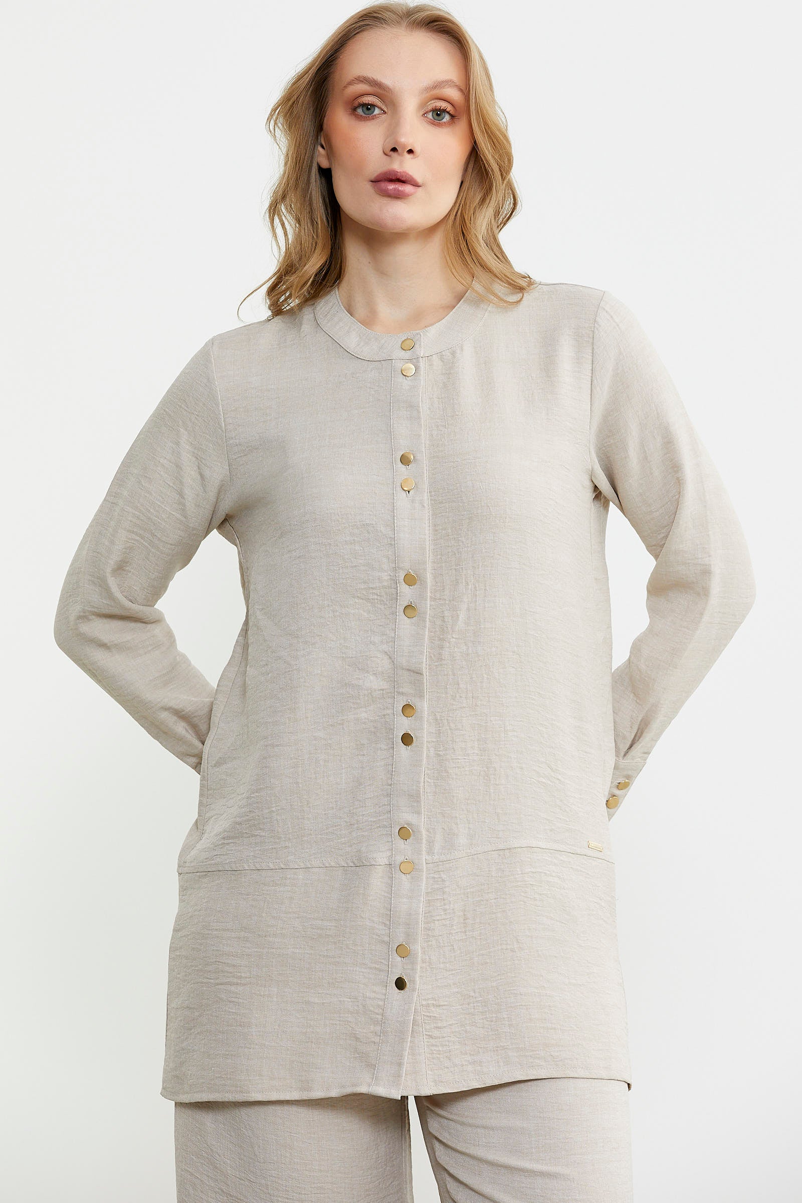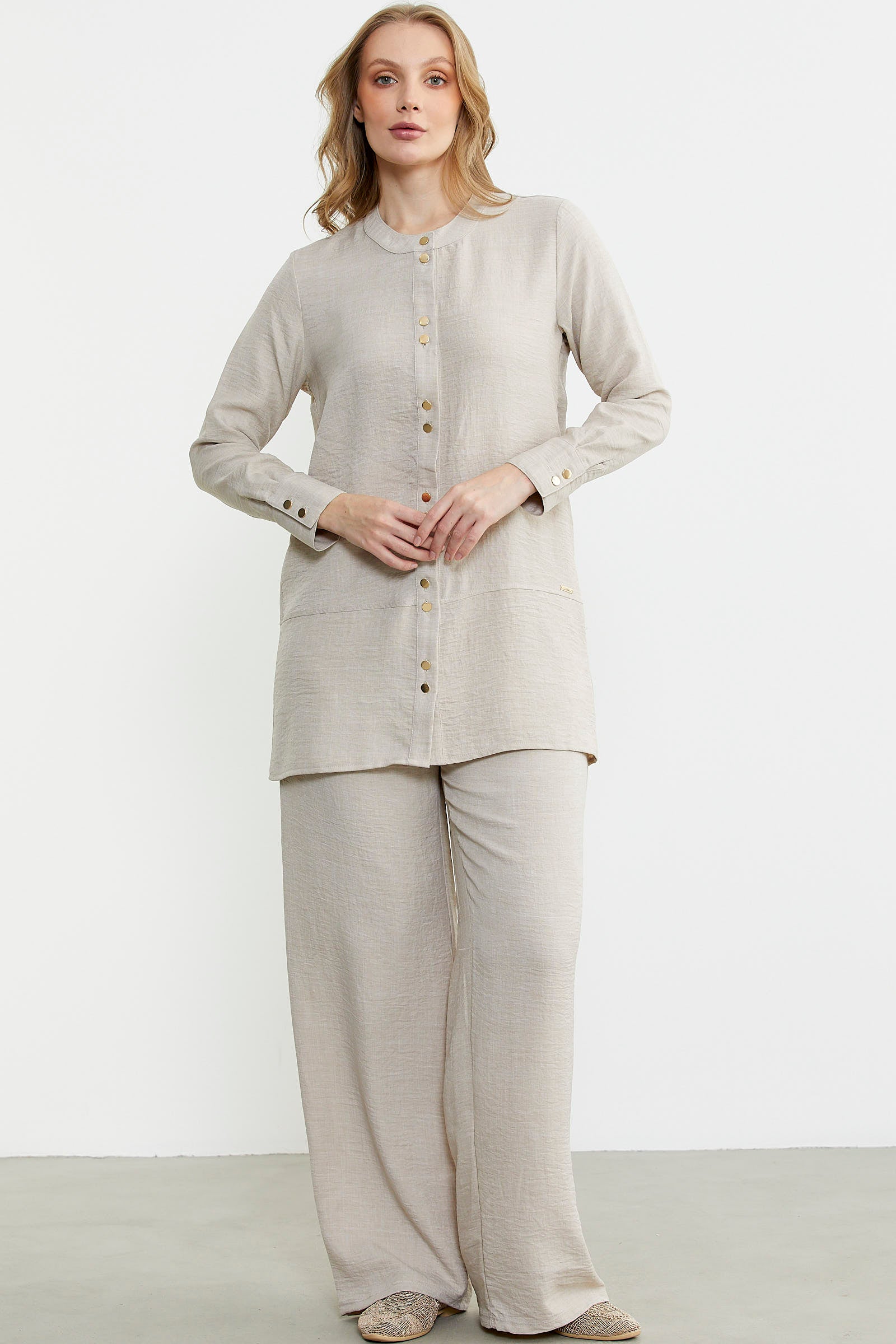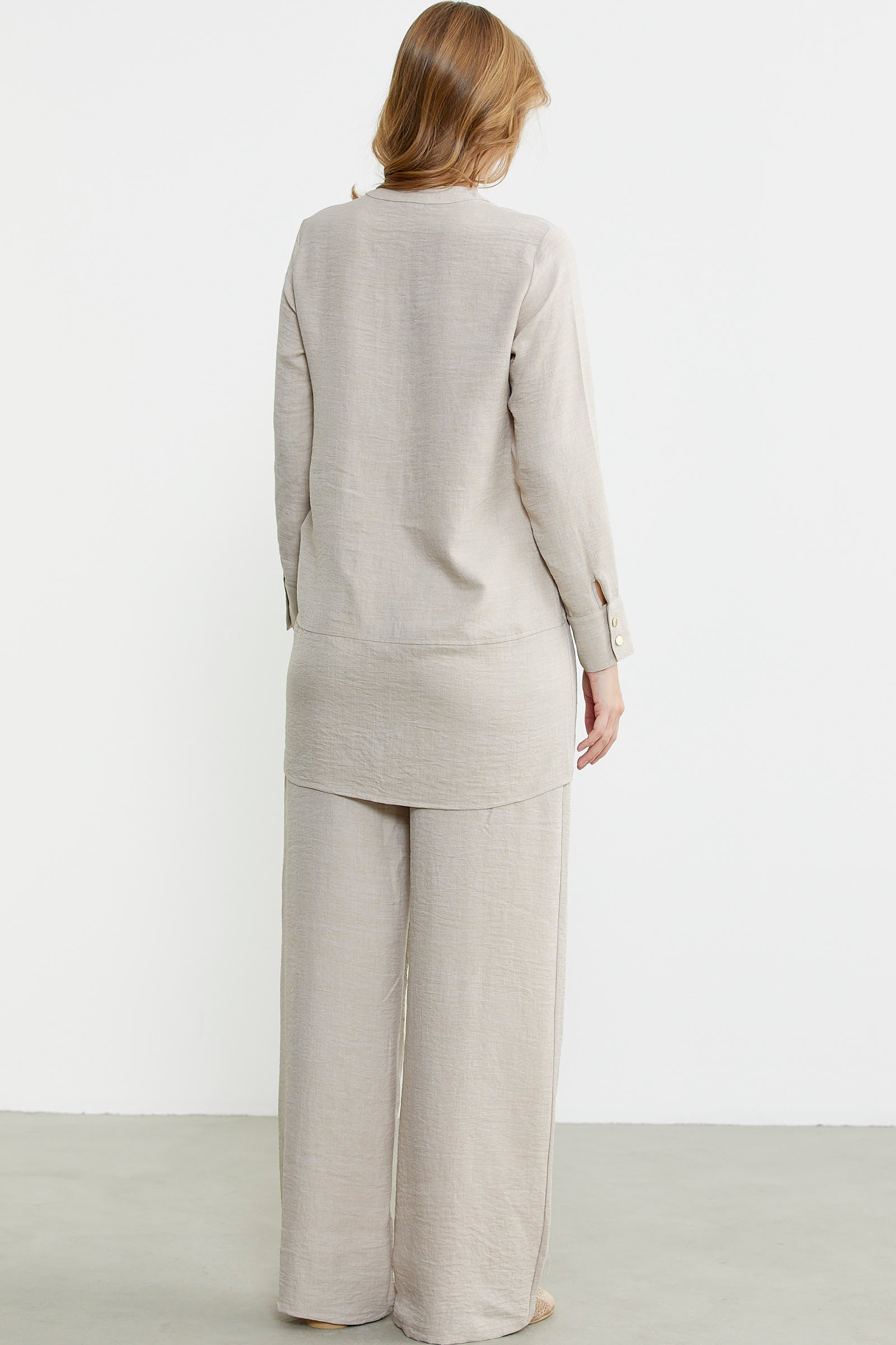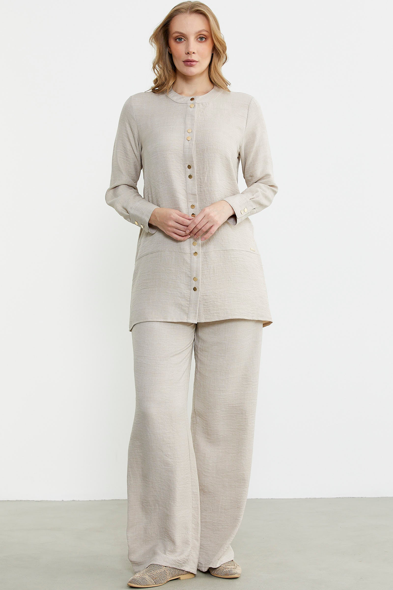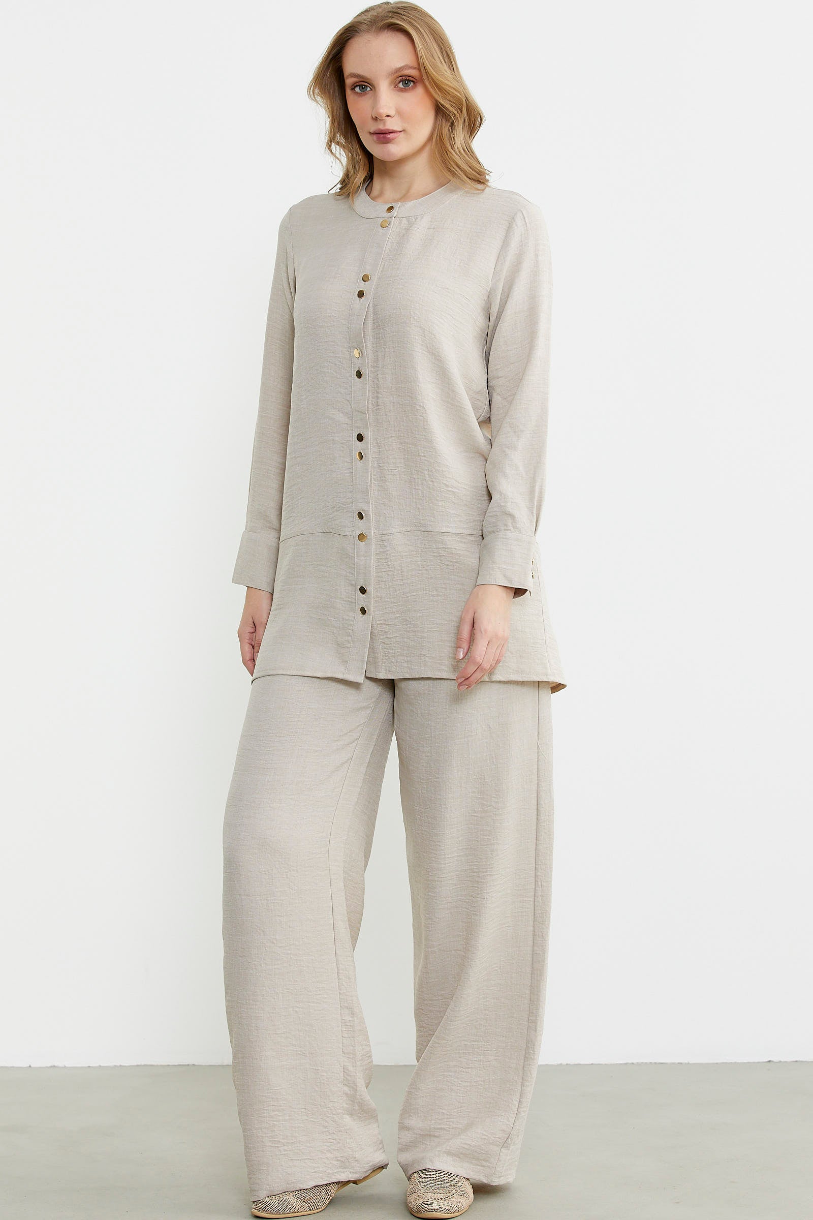Düğme kapamalı tunik üst ve bol paça pantolon içeren takım. Keten görünümlü viskon kumaştan üretilmiştir. Rahat kalıptır.