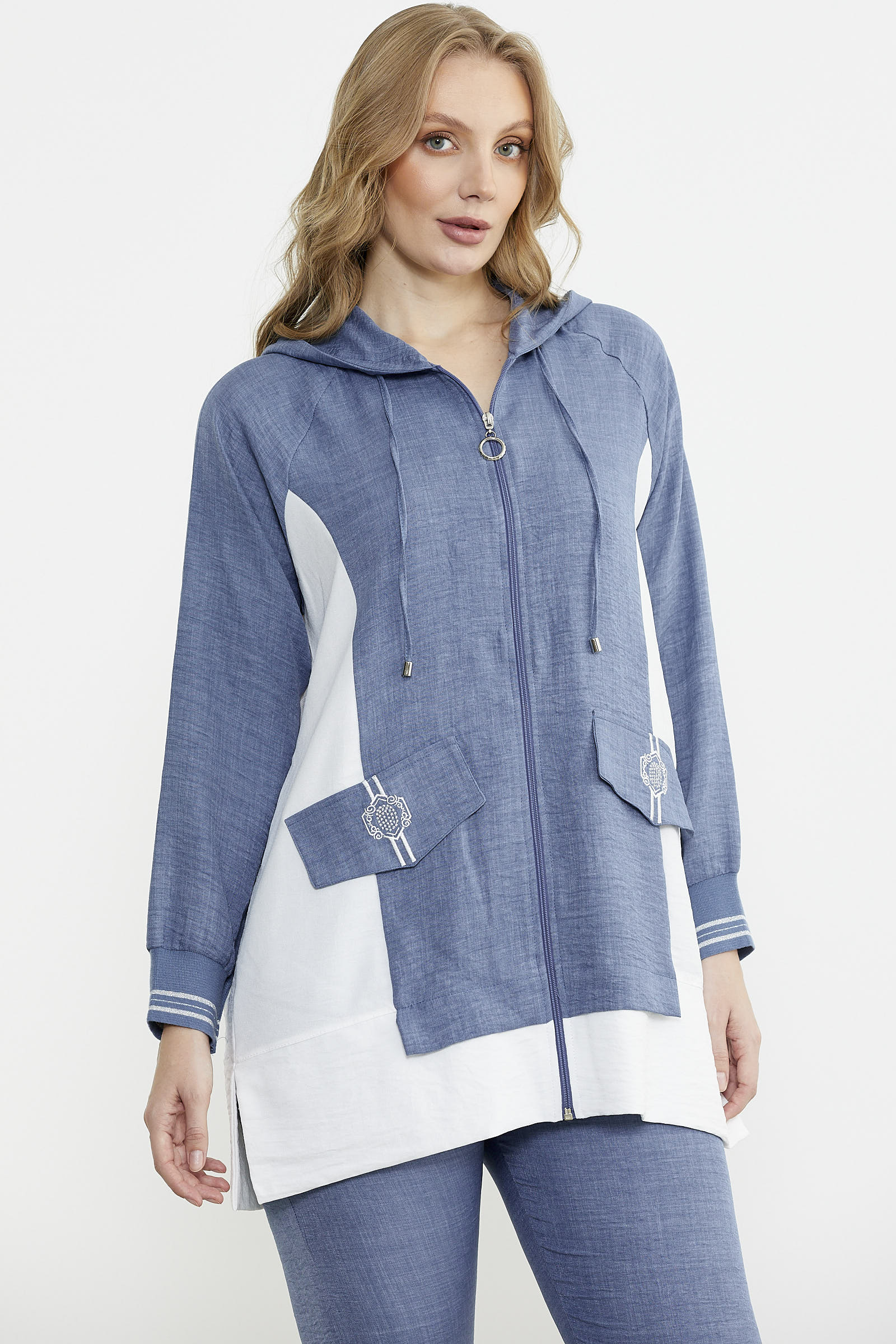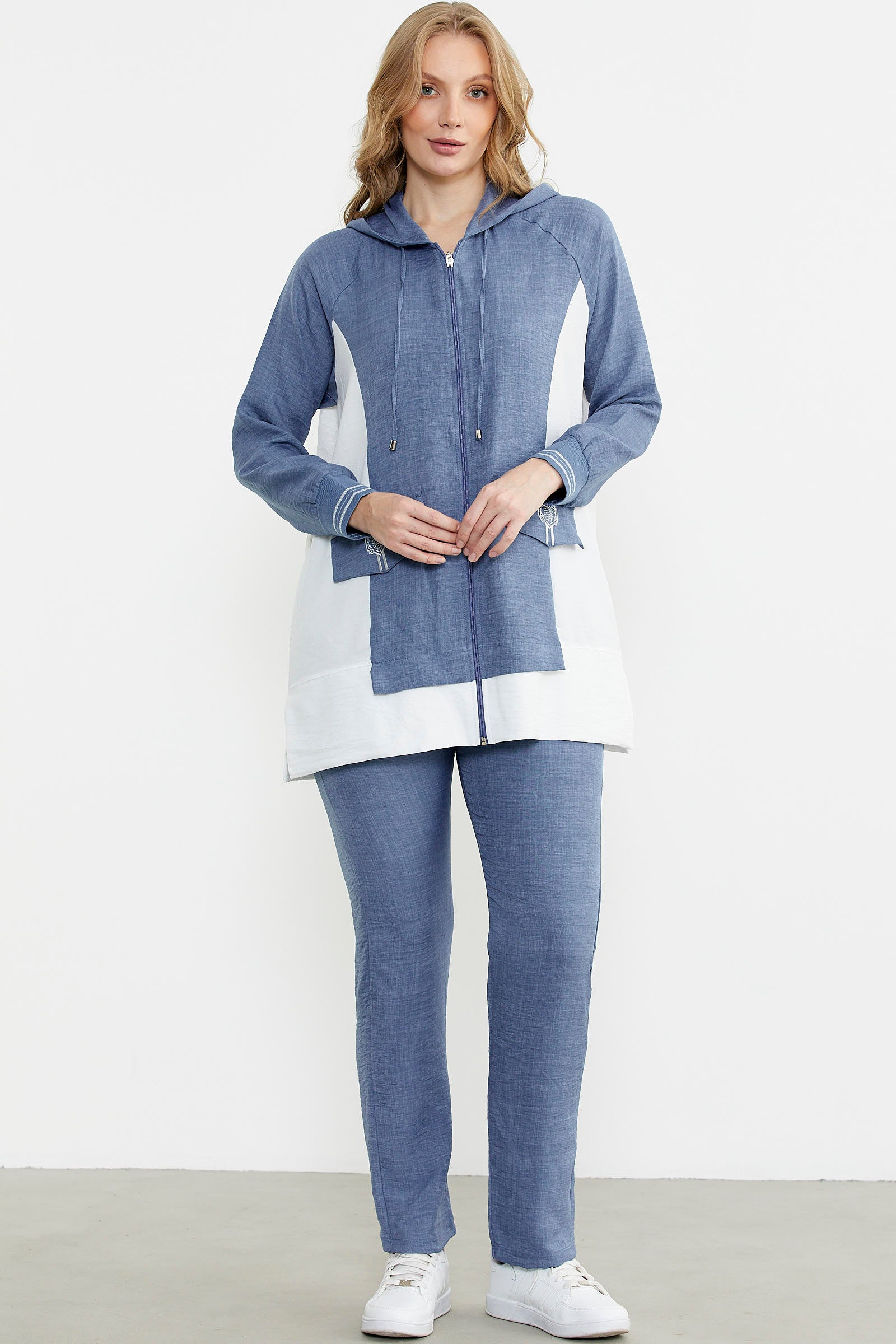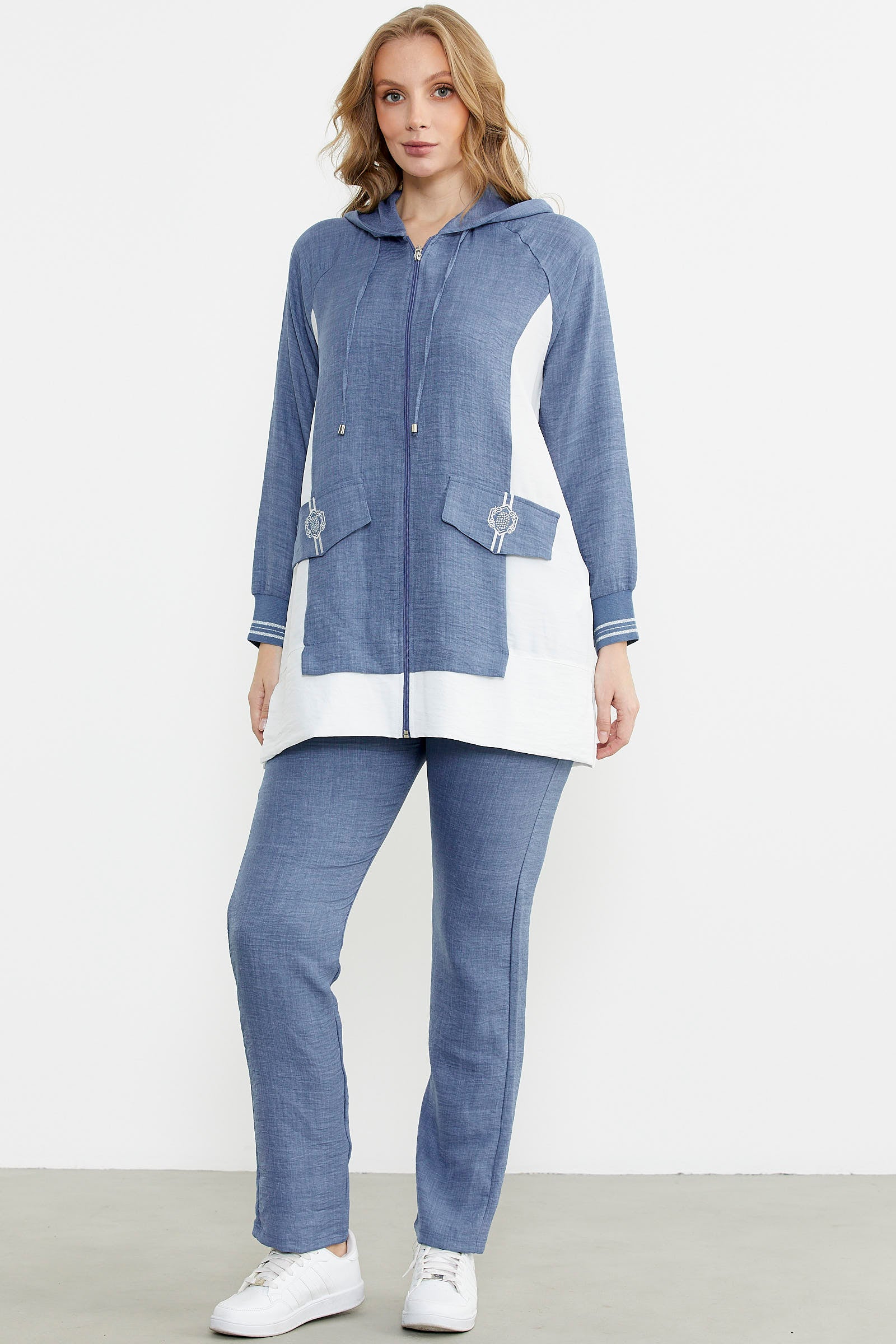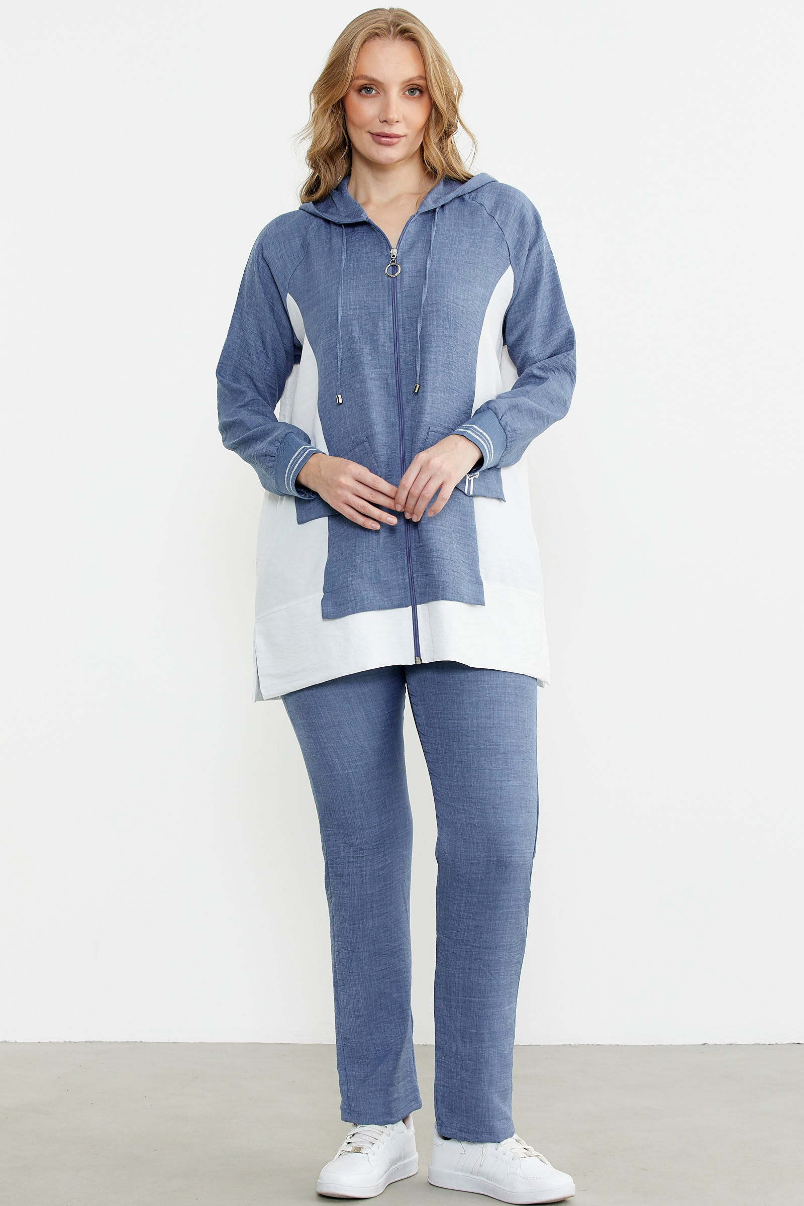 Rahat kalıp, keten görünümlü viskon kumaştan üretilmiş takım, kontrast renk çalışılmıştır. Kapüşonlu ve fermuar kapamalıdır.