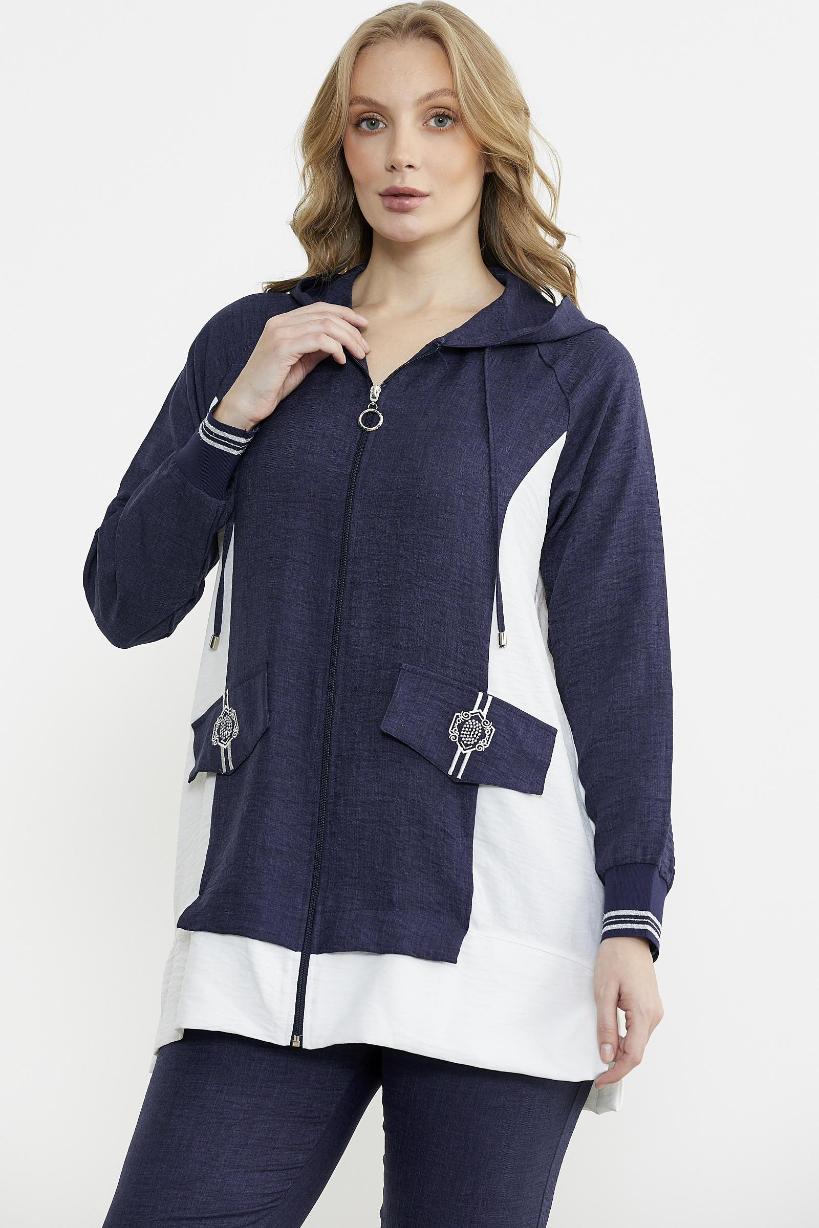 Rahat kalıp, keten görünümlü viskon kumaştan üretilmiş takım, kontrast renk çalışılmıştır. Kapüşonlu ve fermuar kapamalıdır.