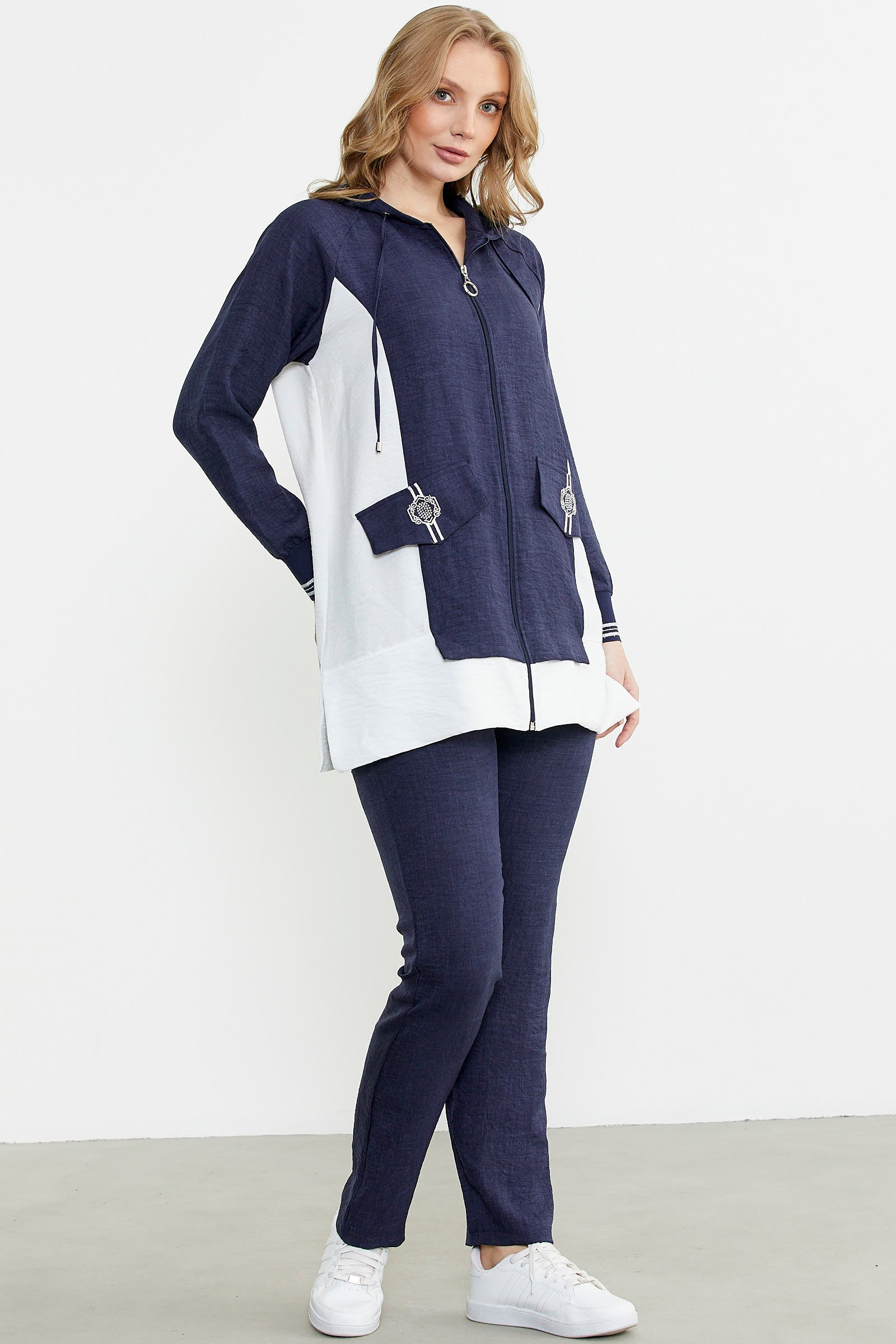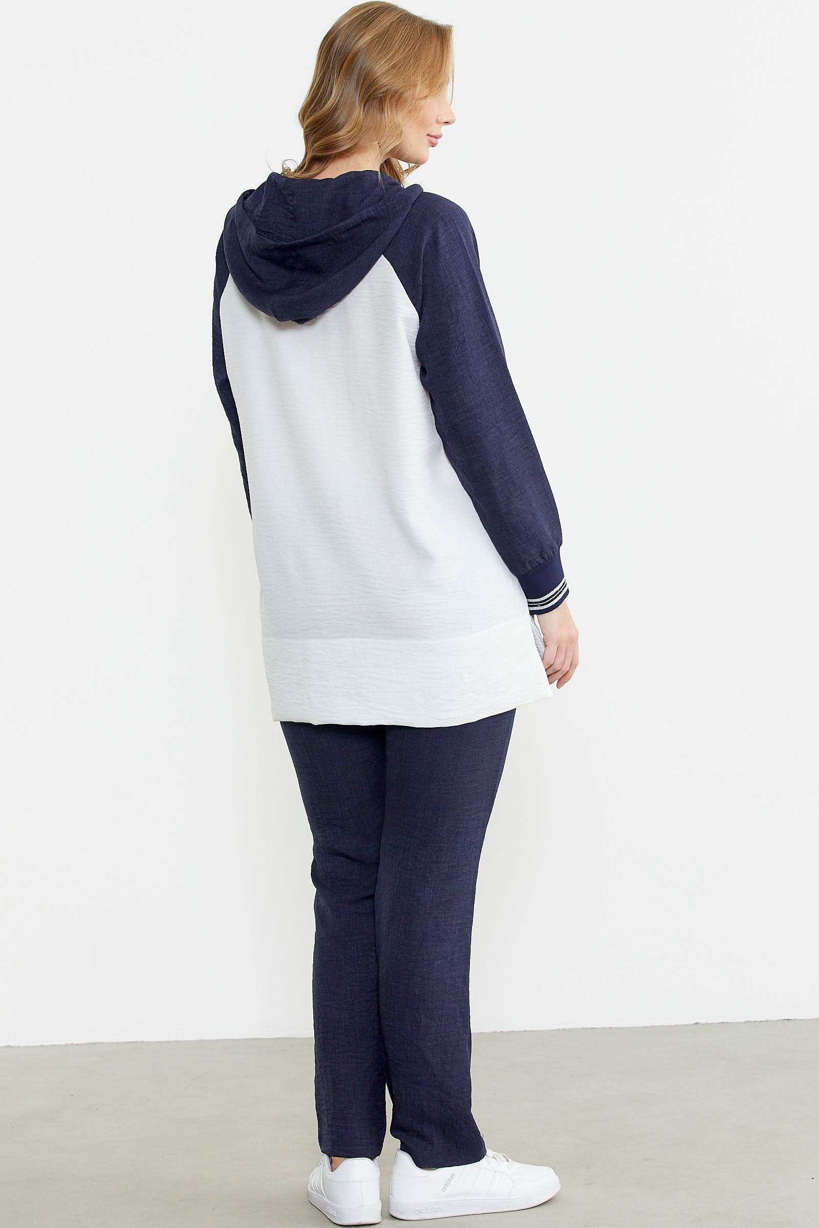 Keten Görünümlü Kapüşonlu Tunik Takım - Lacivert