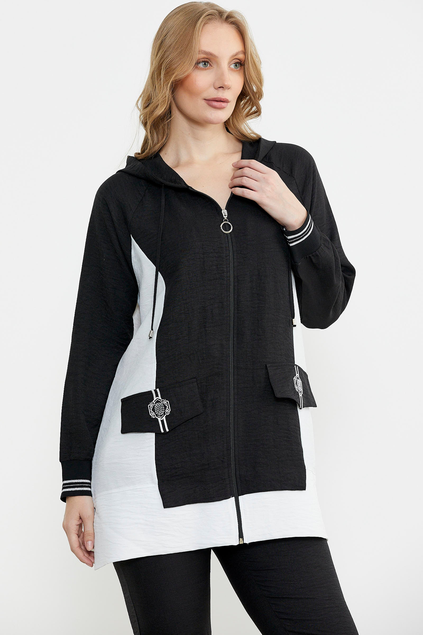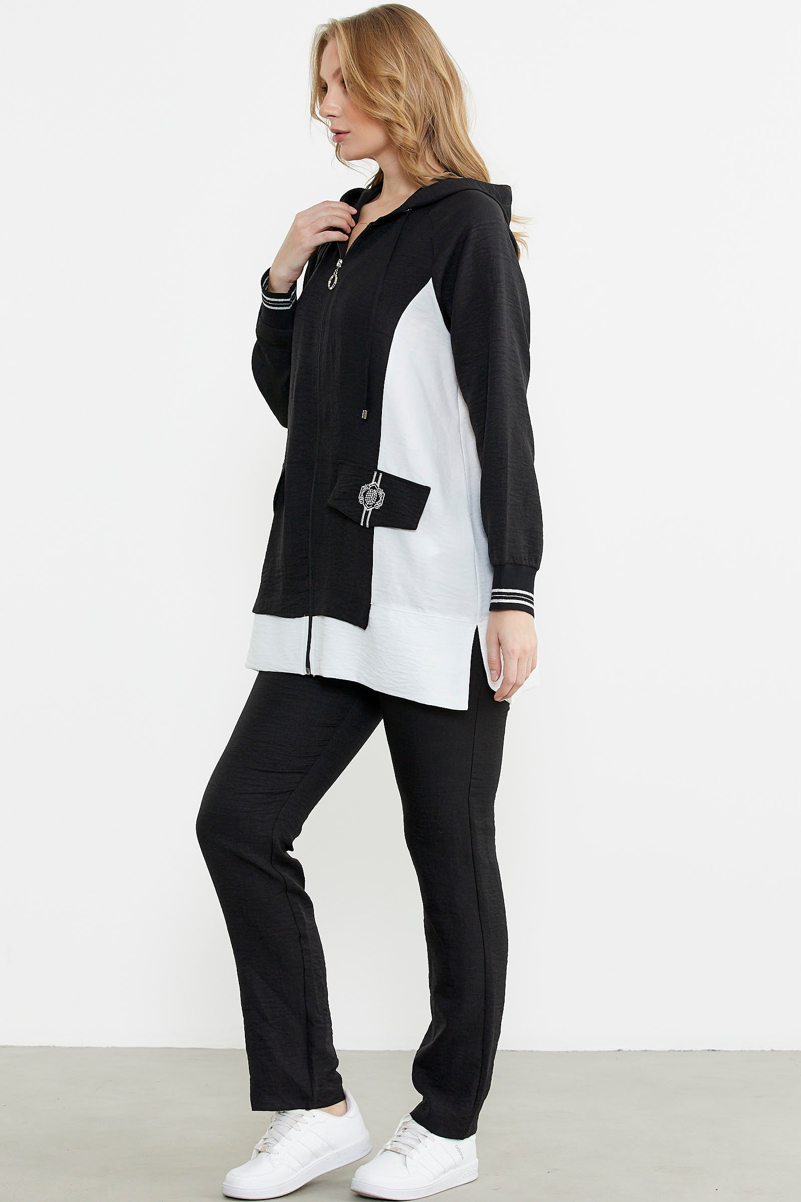 Rahat kalıp, keten görünümlü viskon kumaştan üretilmiş takım, kontrast renk çalışılmıştır. Kapüşonlu ve fermuar kapamalıdır.