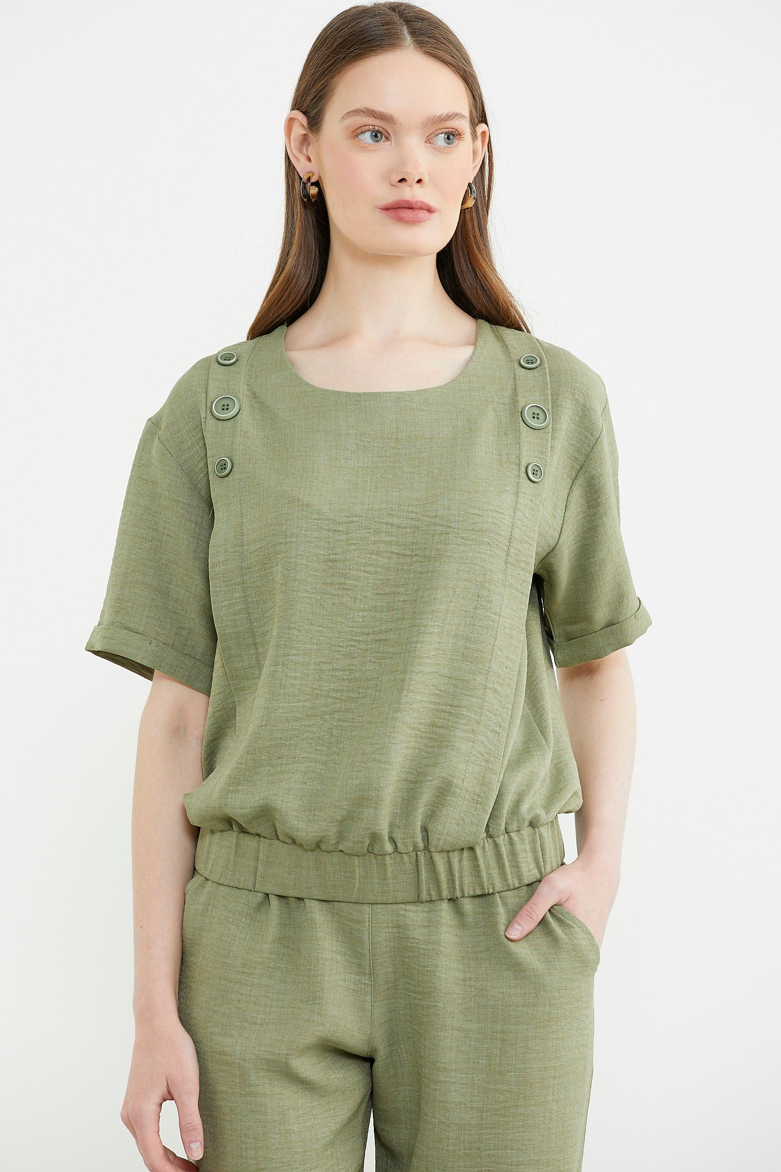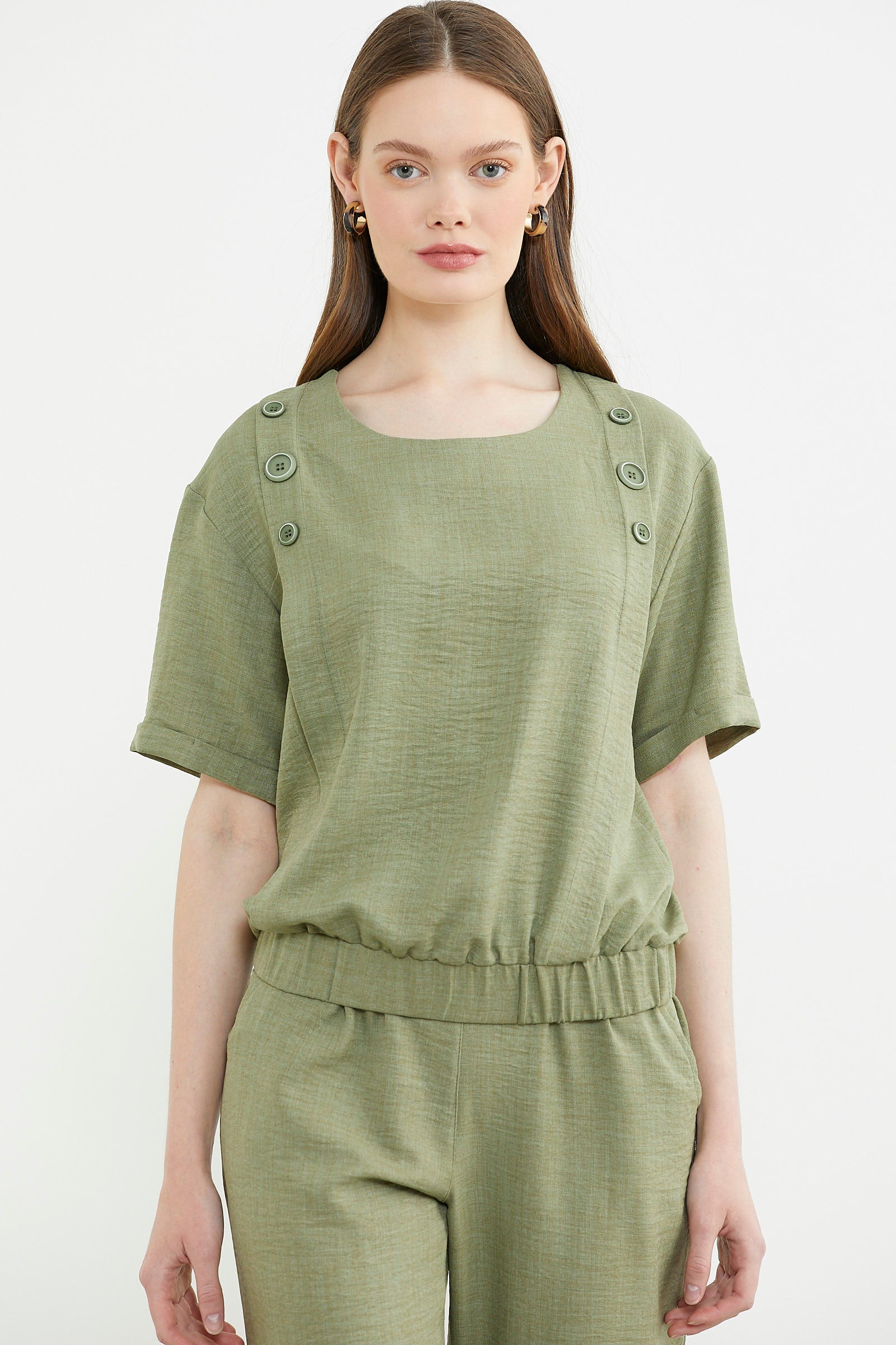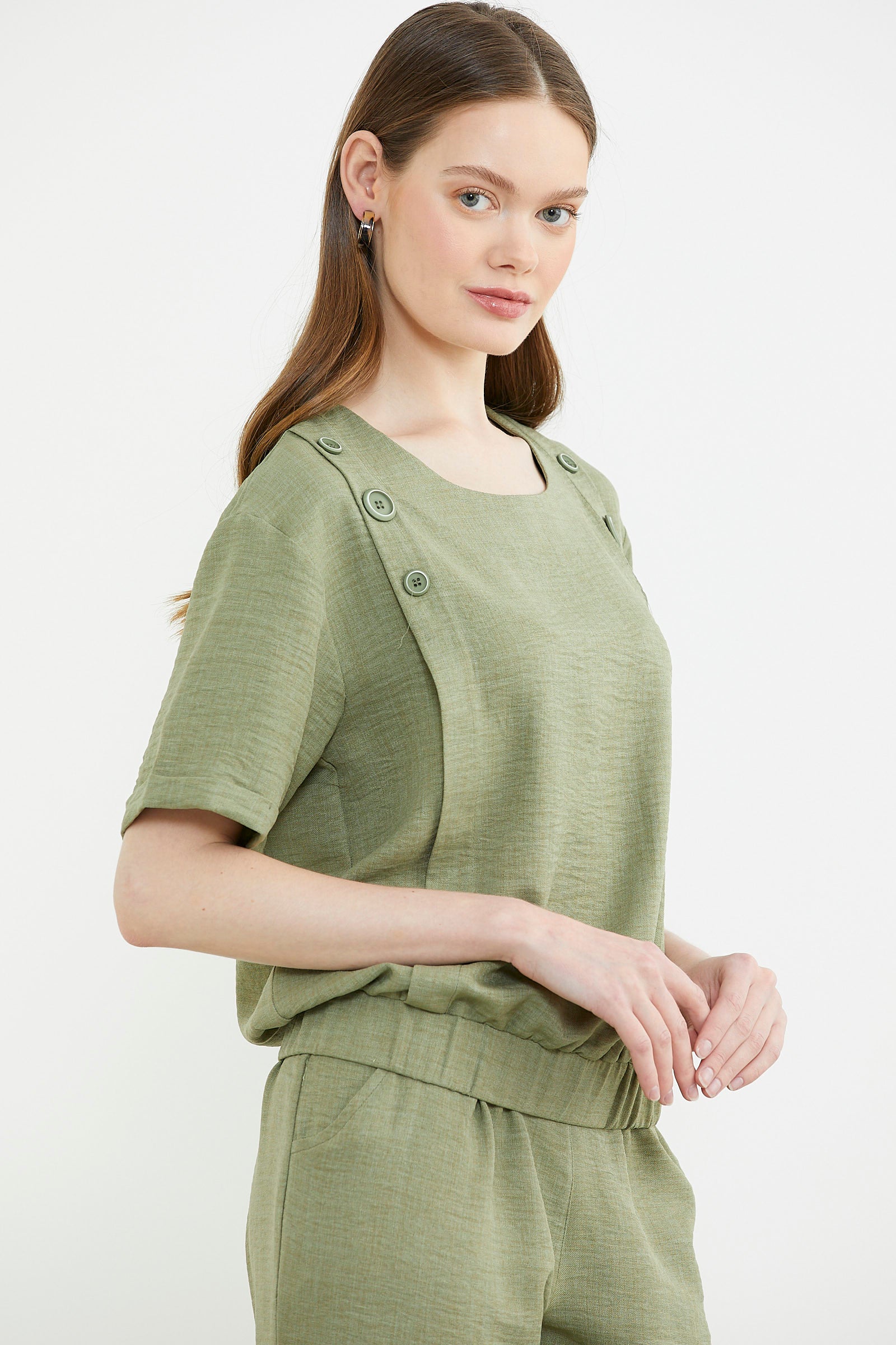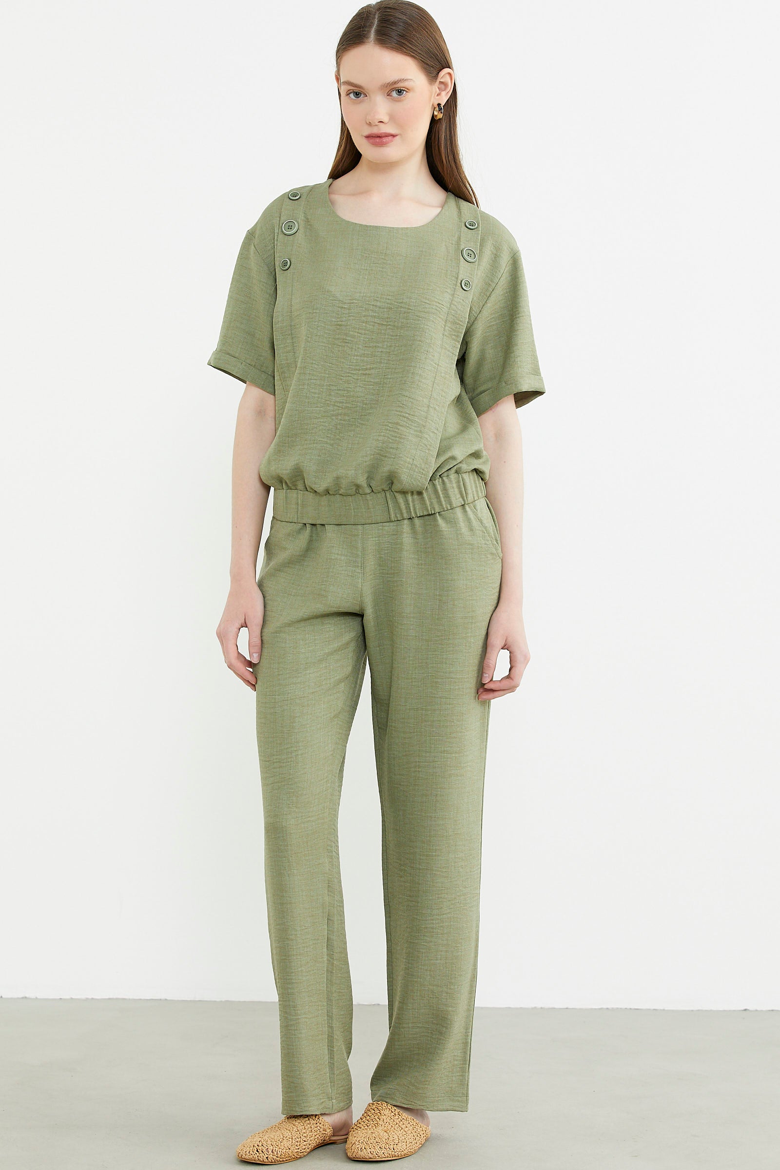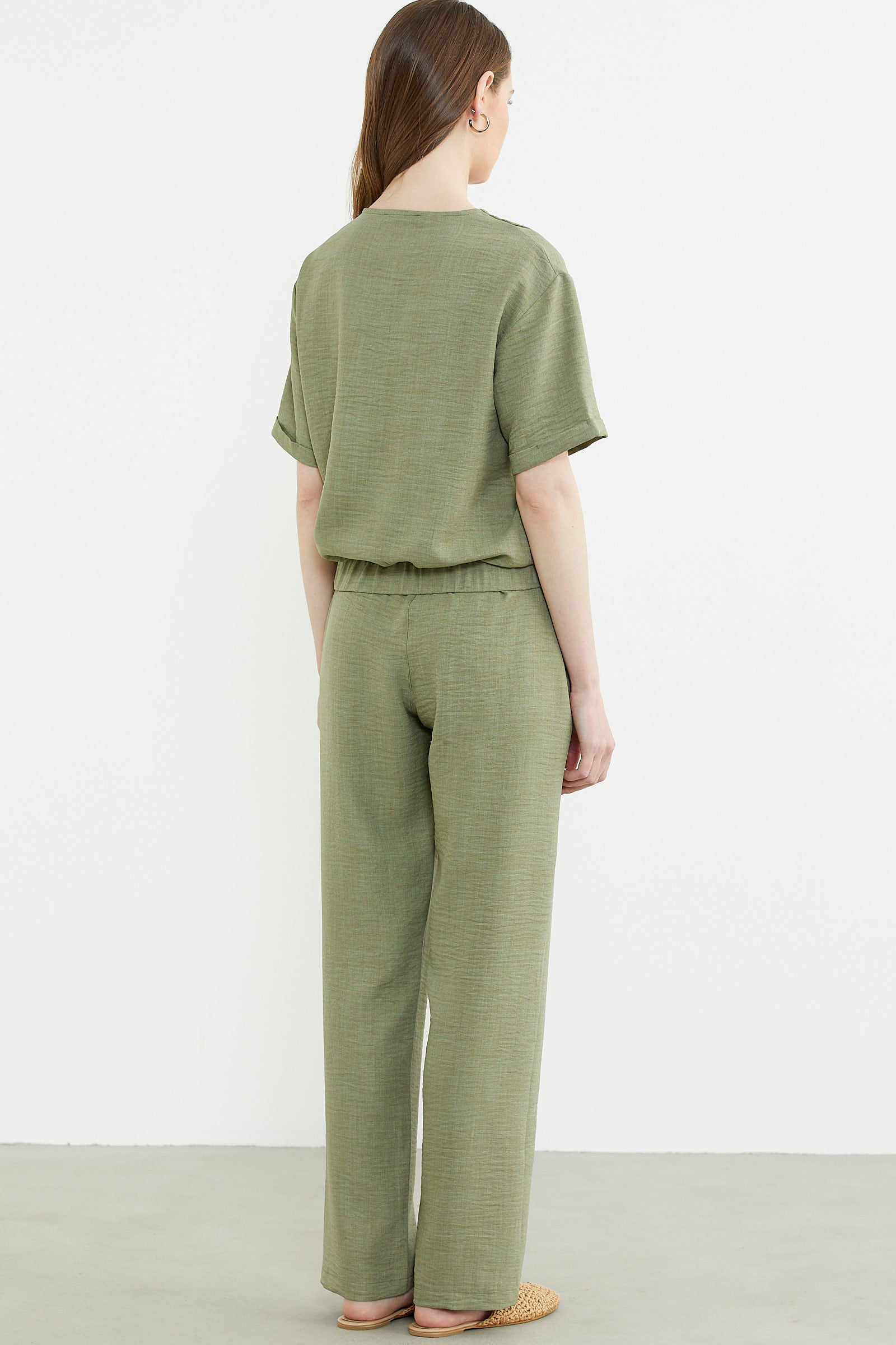 Çok yönlü olarak kullanılabilen keten görünümlü ikili takım rahat kalıptır. İlkbahar/ Yaz sezonu için tasarlanmış, casual tarzıyla günlük kullanıma uygundur.