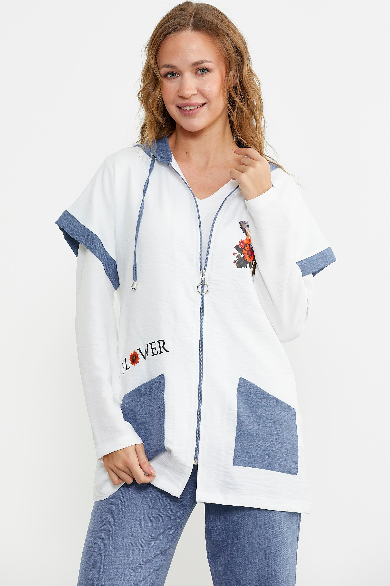 Krep dokulu kumaştan üretilmiş üçlü takım, renk kontrastlıdır.İçi uzun kollu düz, üst parça baskı detaylıdır. Rahat kalıp üretilmiştir.