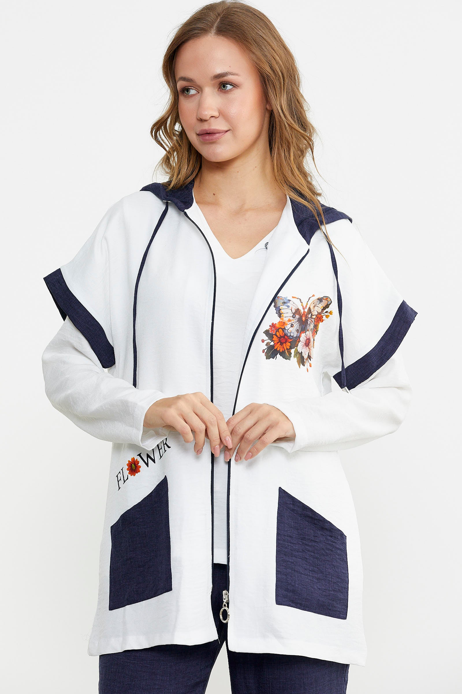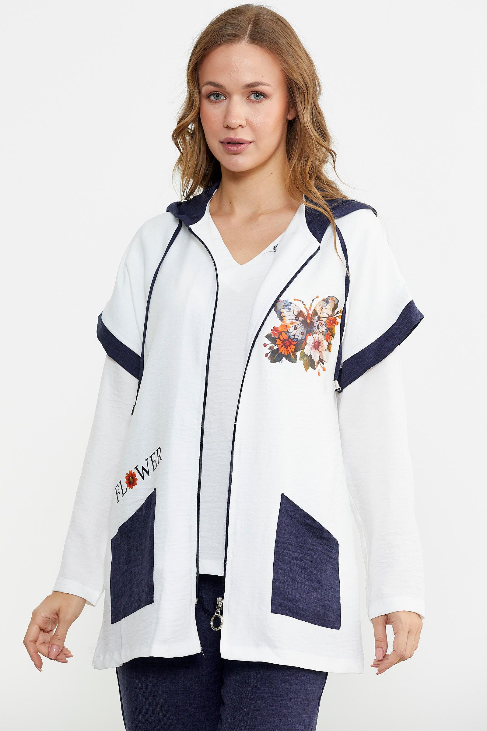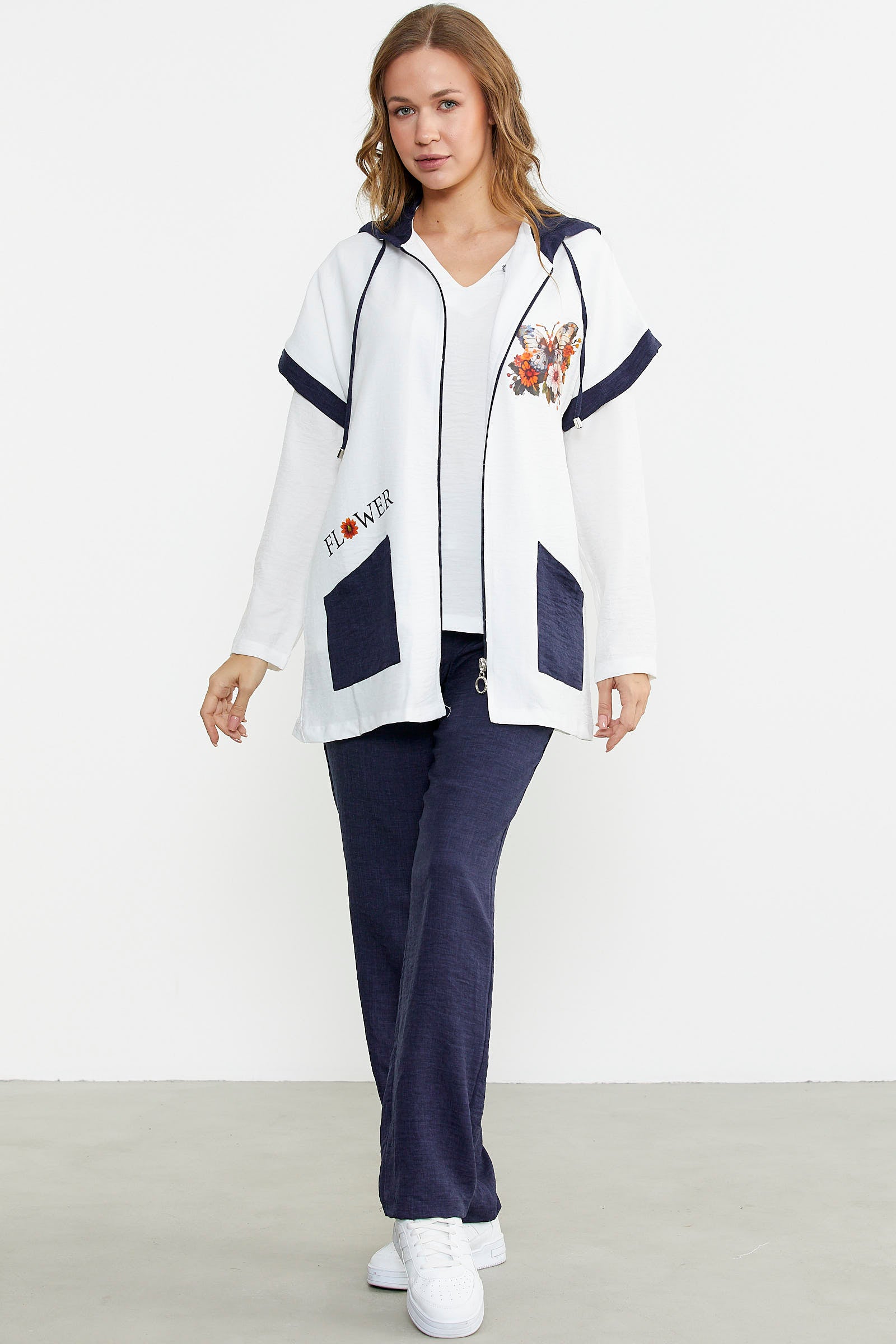 Krep dokulu kumaştan üretilmiş üçlü takım, renk kontrastlıdır.İçi uzun kollu düz, üst parça baskı detaylıdır. Rahat kalıp üretilmiştir.