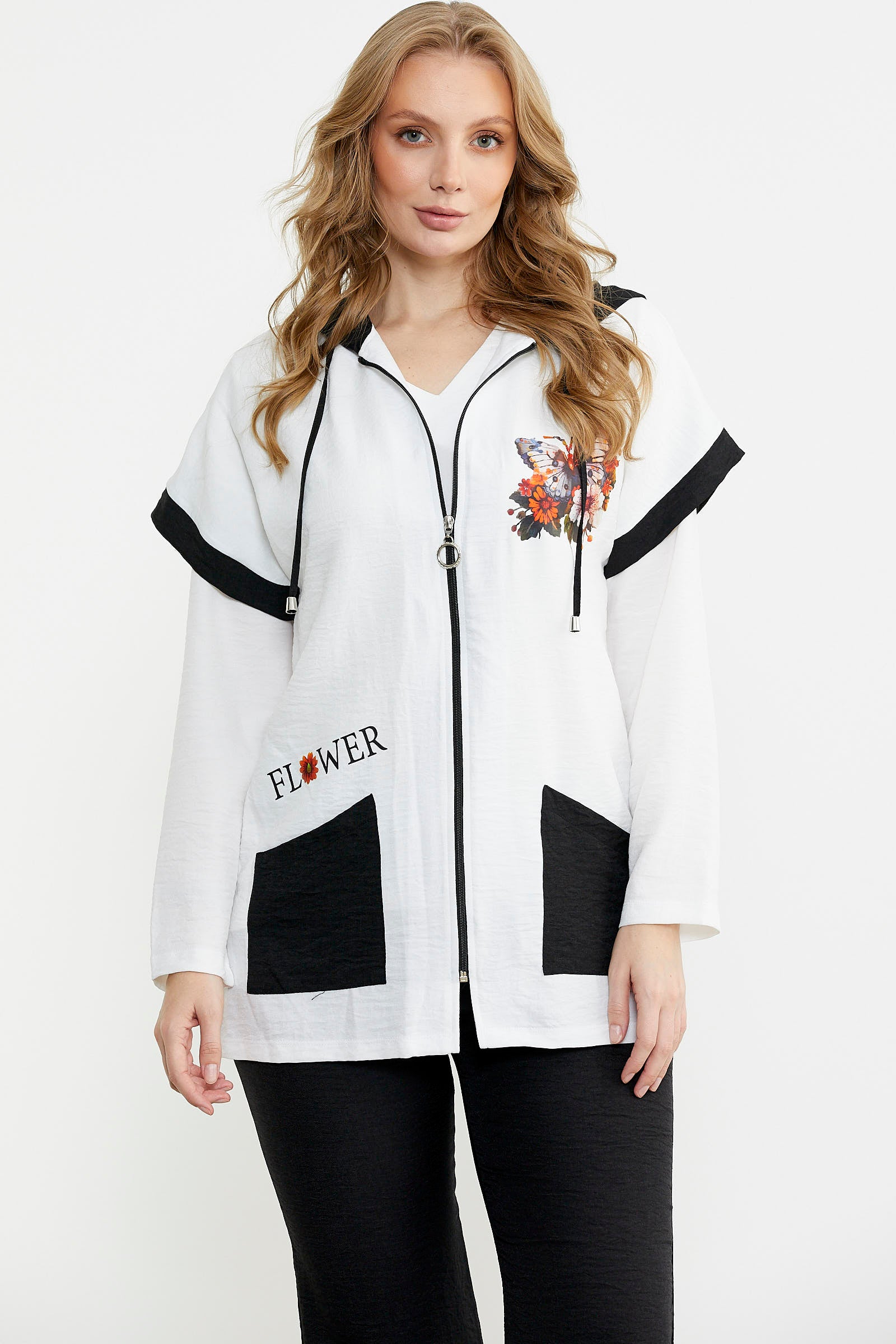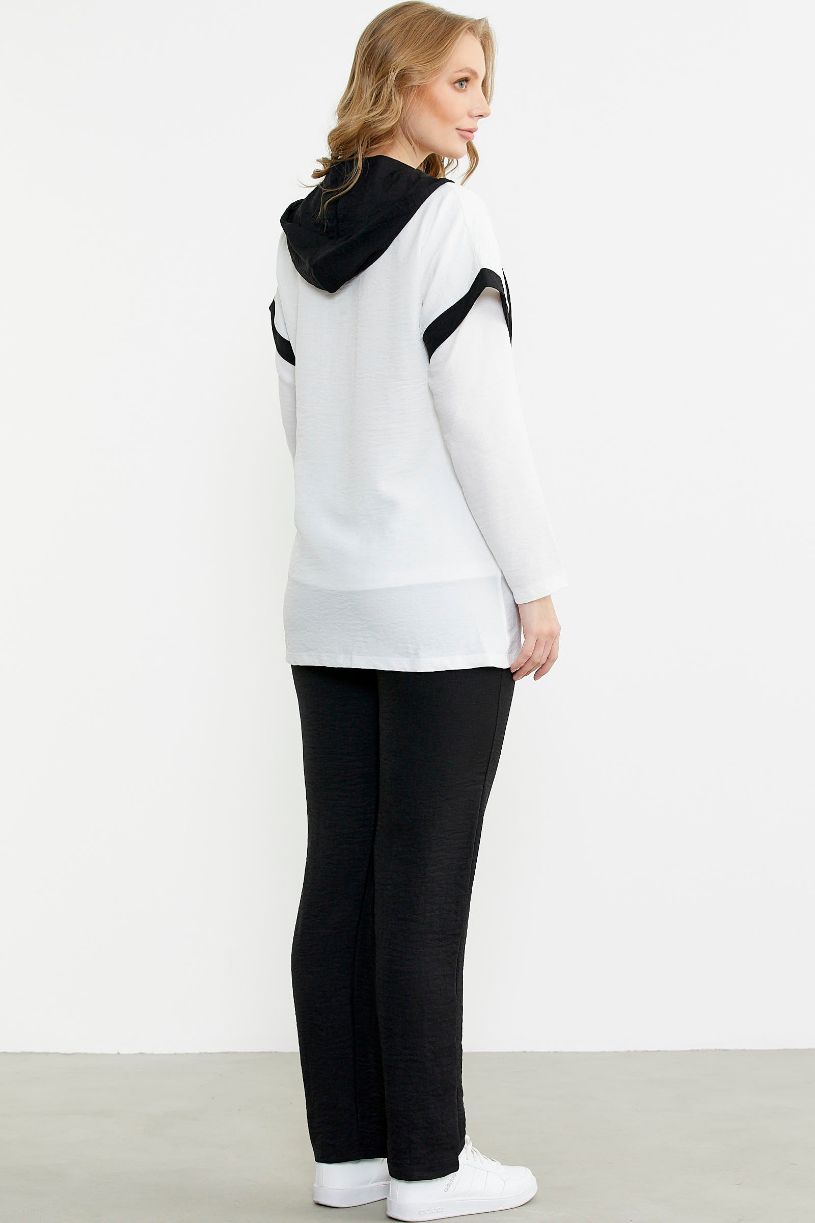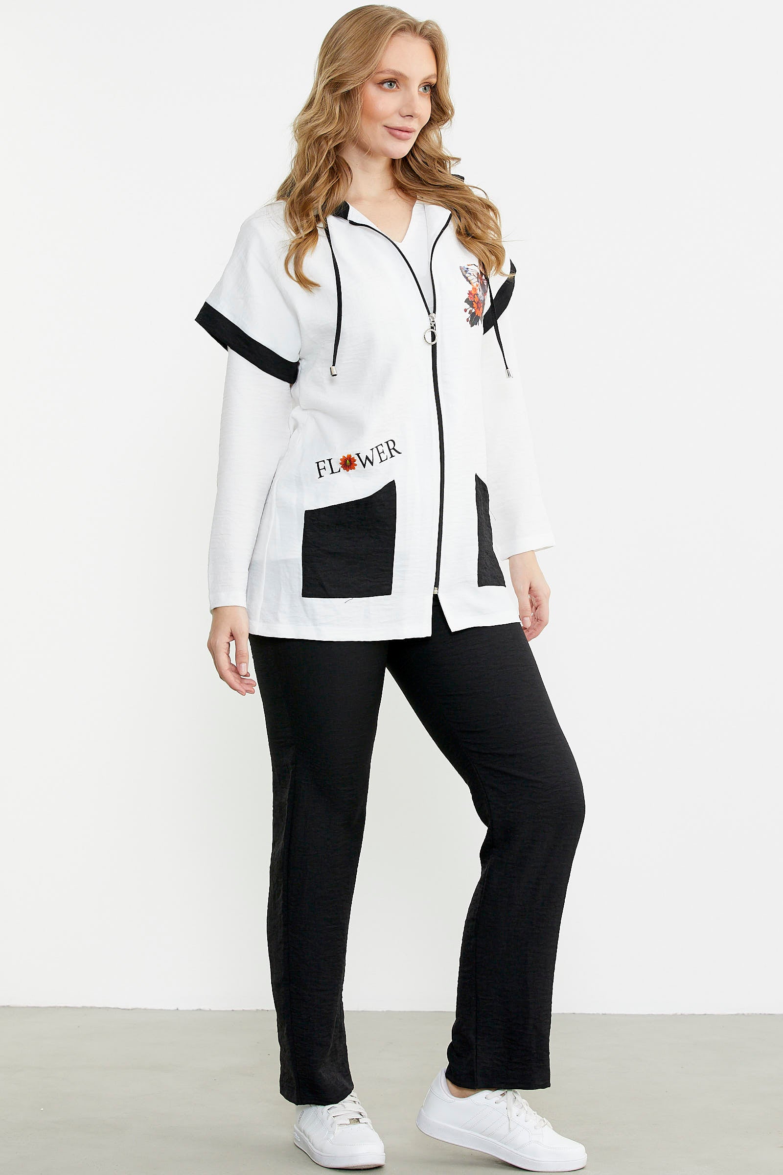 Krep dokulu kumaştan üretilmiş üçlü takım, renk kontrastlıdır.İçi uzun kollu düz, üst parça baskı detaylıdır. Rahat kalıp üretilmiştir.